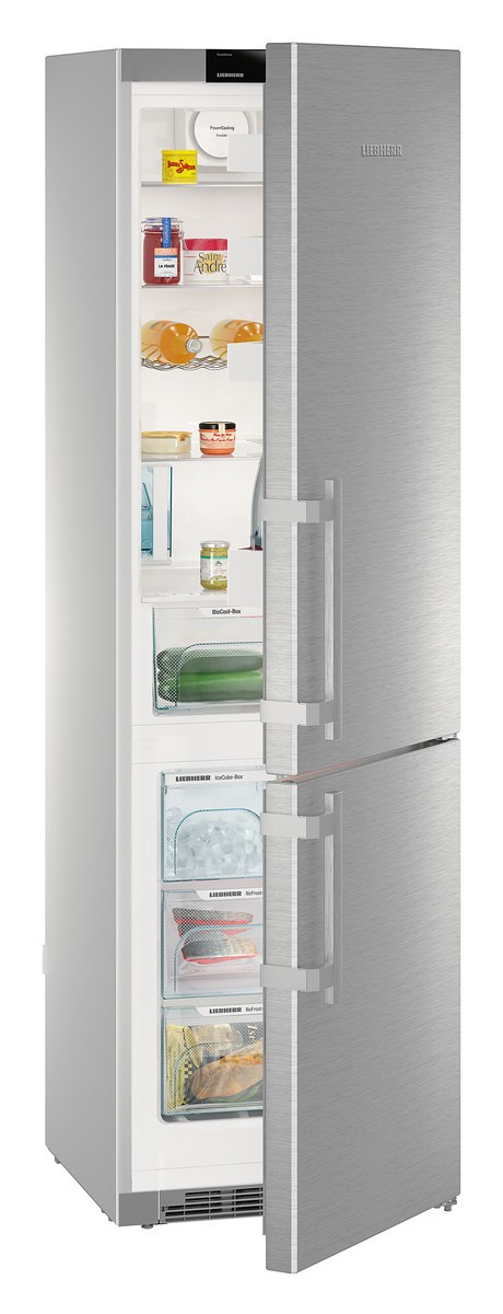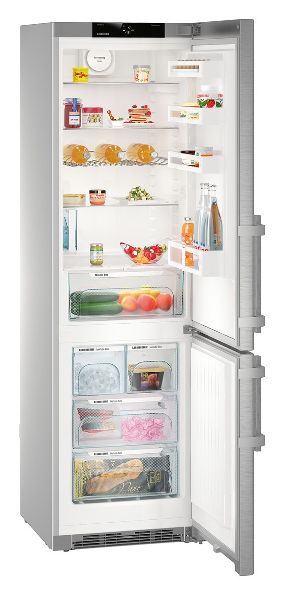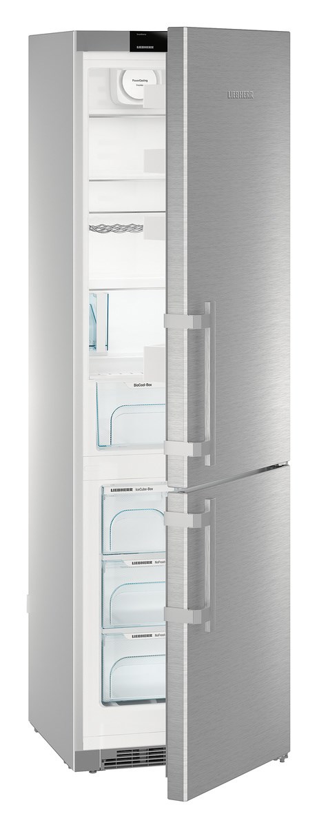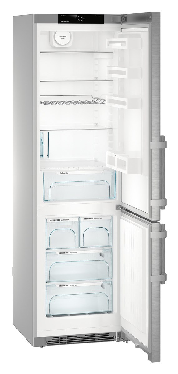 Отдельно стоящий холодильник Liebherr CNef 4845 Comfort NoFrost, выполненный в серебристом цвете, можно установить вплотную к стене. По умолчанию крепление дверцы — справа, но есть возможность перенавешивания петель. Морозильная камера расположена в нижней части и имеет 4 ящика для хранения продуктов. Мощность замораживания в сутки составляет 16 кг. Режим NoFrost сохраняет холод в случае отключения электропитания в течении дня. Этот режим хорош тем, что не накапливает лед в процессе заморозки на поверхностях камеры.