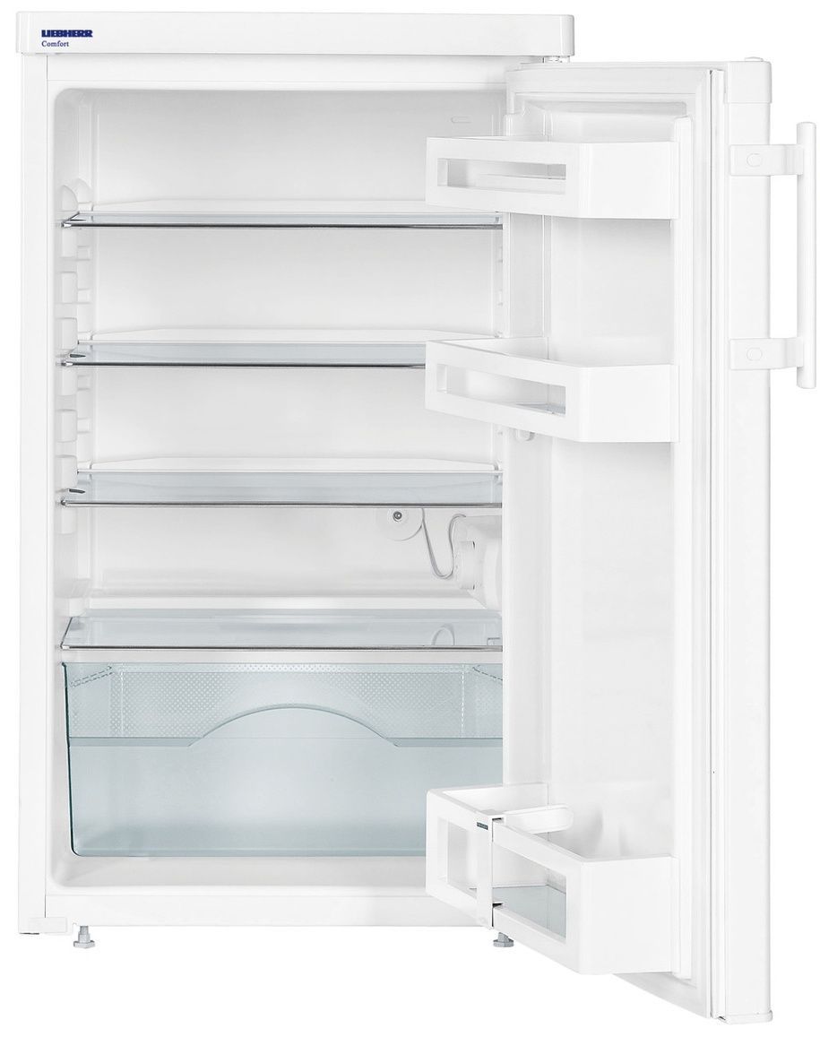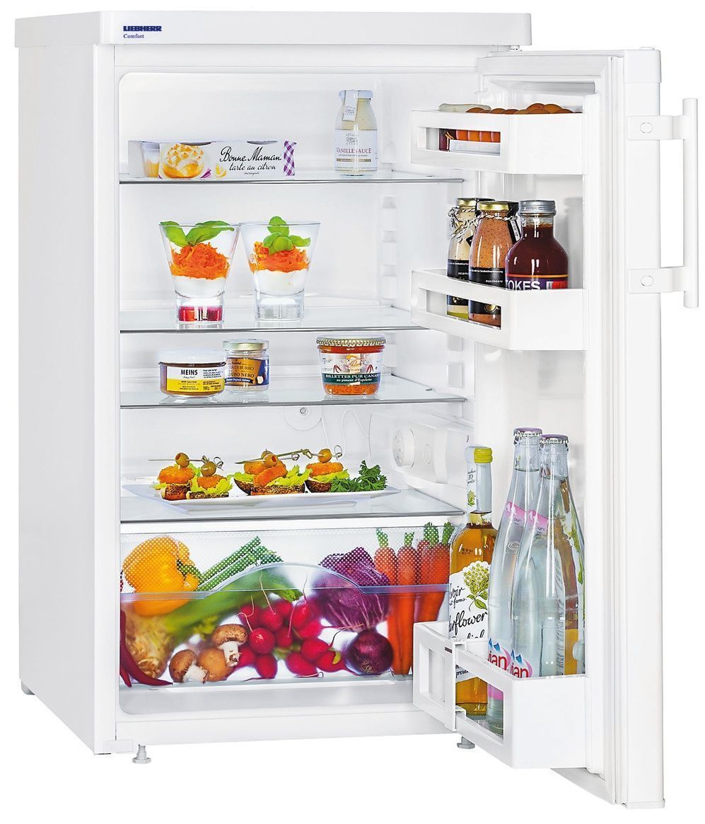 Холодильник Liebherr T 1410 Comfort — это компактная модель без морозильного отделения, которую можно расположить не только на кухне, но и в коридоре или комнате. Ее можно встроить под столешницу кухонного гарнитура. Отлично подходит для хостелов и отелей. Изделие выполнено в традиционном для подобной техники белом цвете. В дизайне использован прием SwingDesign — плавные линии и округлые края. Высота прибора 85 см, ширина — 50,1 см. В глубину он занимает 62 см. При установке будет необходимо немного отодвинуть устройство от стенки, чтобы у задней решетки было достаточно воздуха для охлаждения.