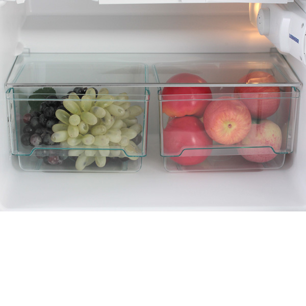 Несмотря на маленькие размеры, внутри холодильного отделения благодаря естественной циркуляции воздуха есть зоны с разной температурой. Наиболее низкая она у стенки и над ящиками, а сверху и на боковых полках — выше.