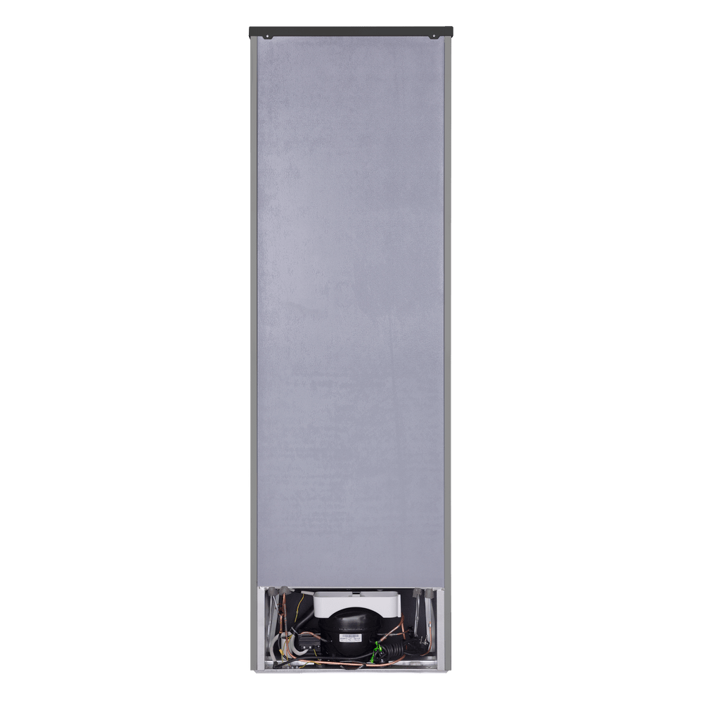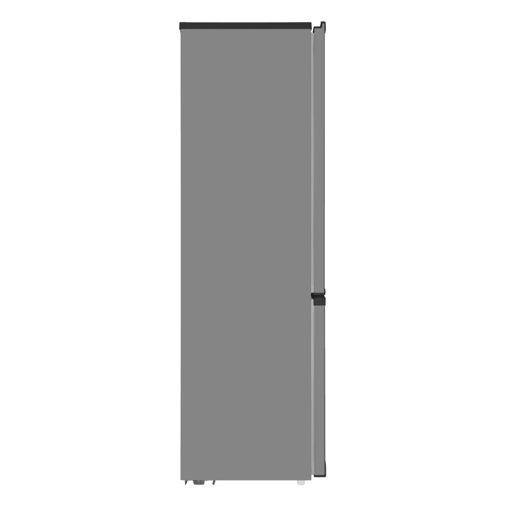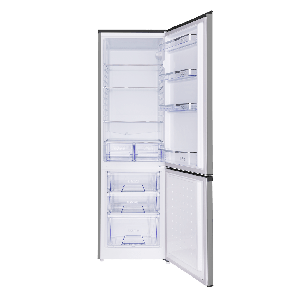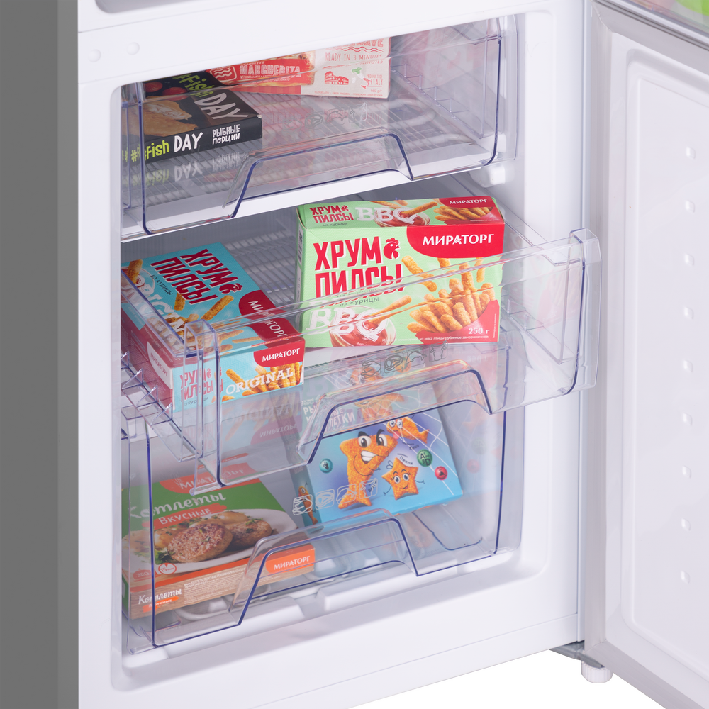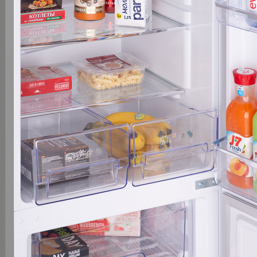 Двухкамерный холодильник с тремя вместительными ящиками в морозильной камере и двумя ящиками для овощей и фруктов. Полки из закаленного стекла с серебристой отделкой переставляются по высоте, а дверцы перенавешиваются для удобства доступа с любой стороны
