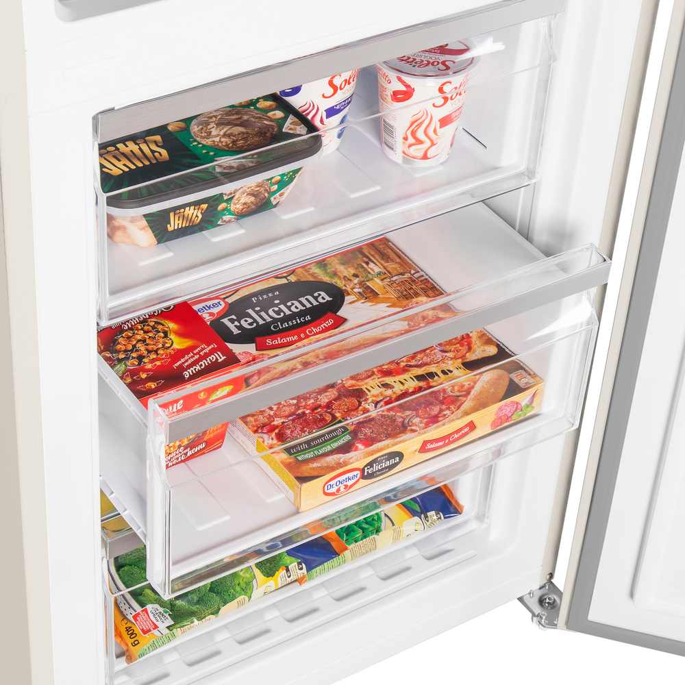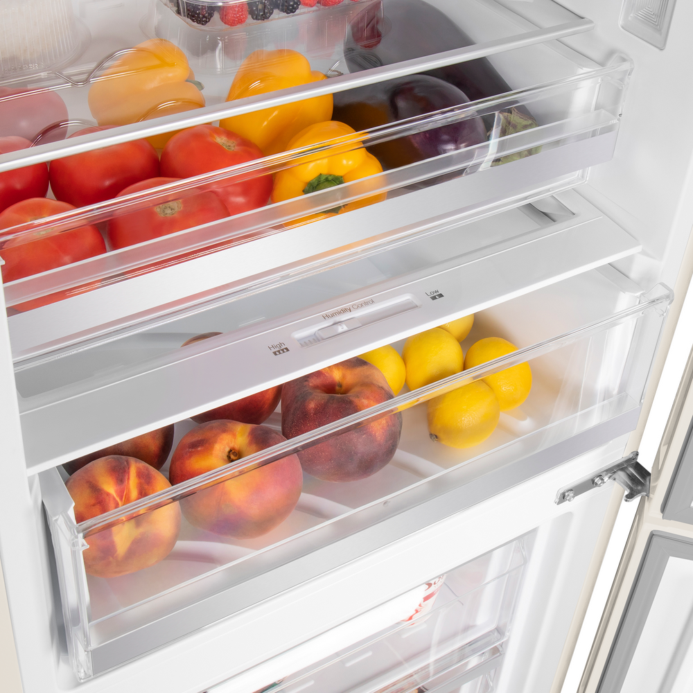 Современный двухкамерный холодильник NO FROST шириной 60 см с инверторным компрессором, многопоточным охлаждением, сенсорной панелью управления. Фасад выполнен из закаленного стекла.