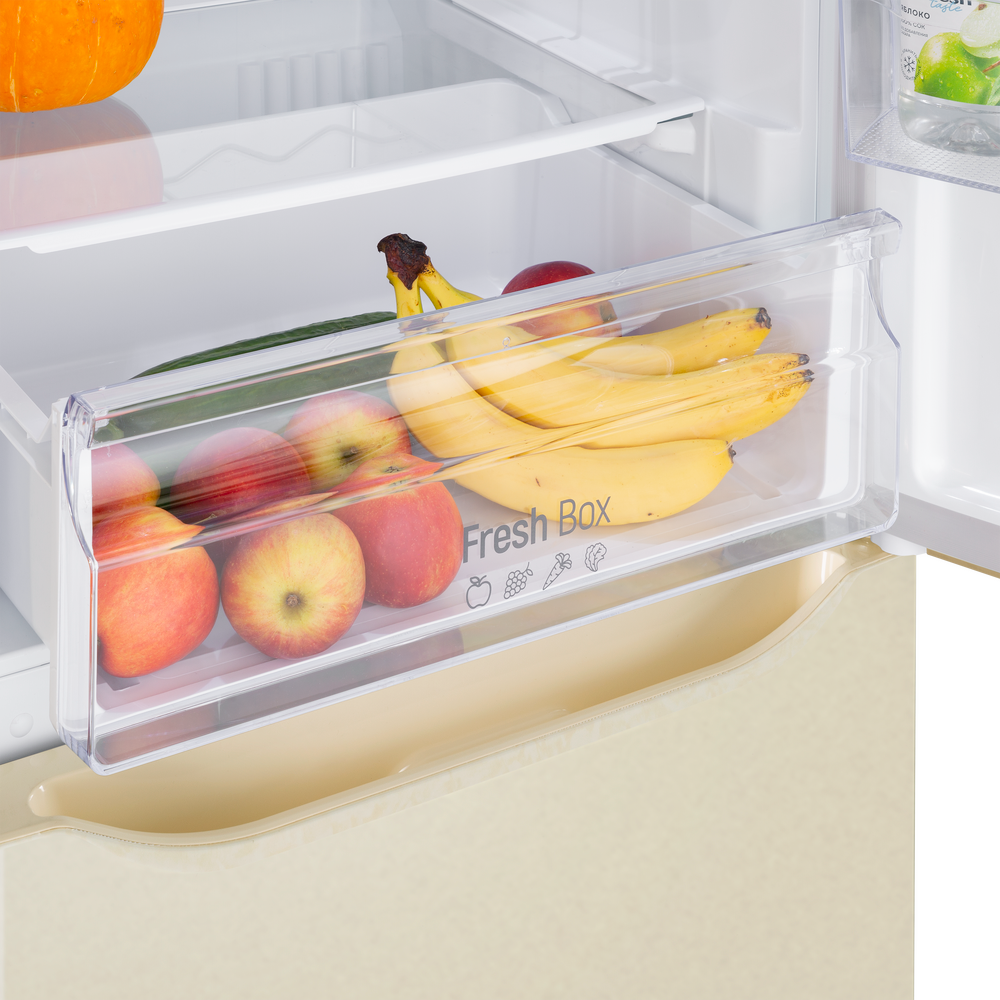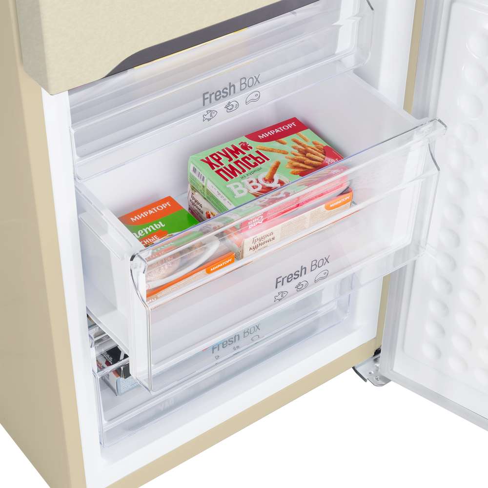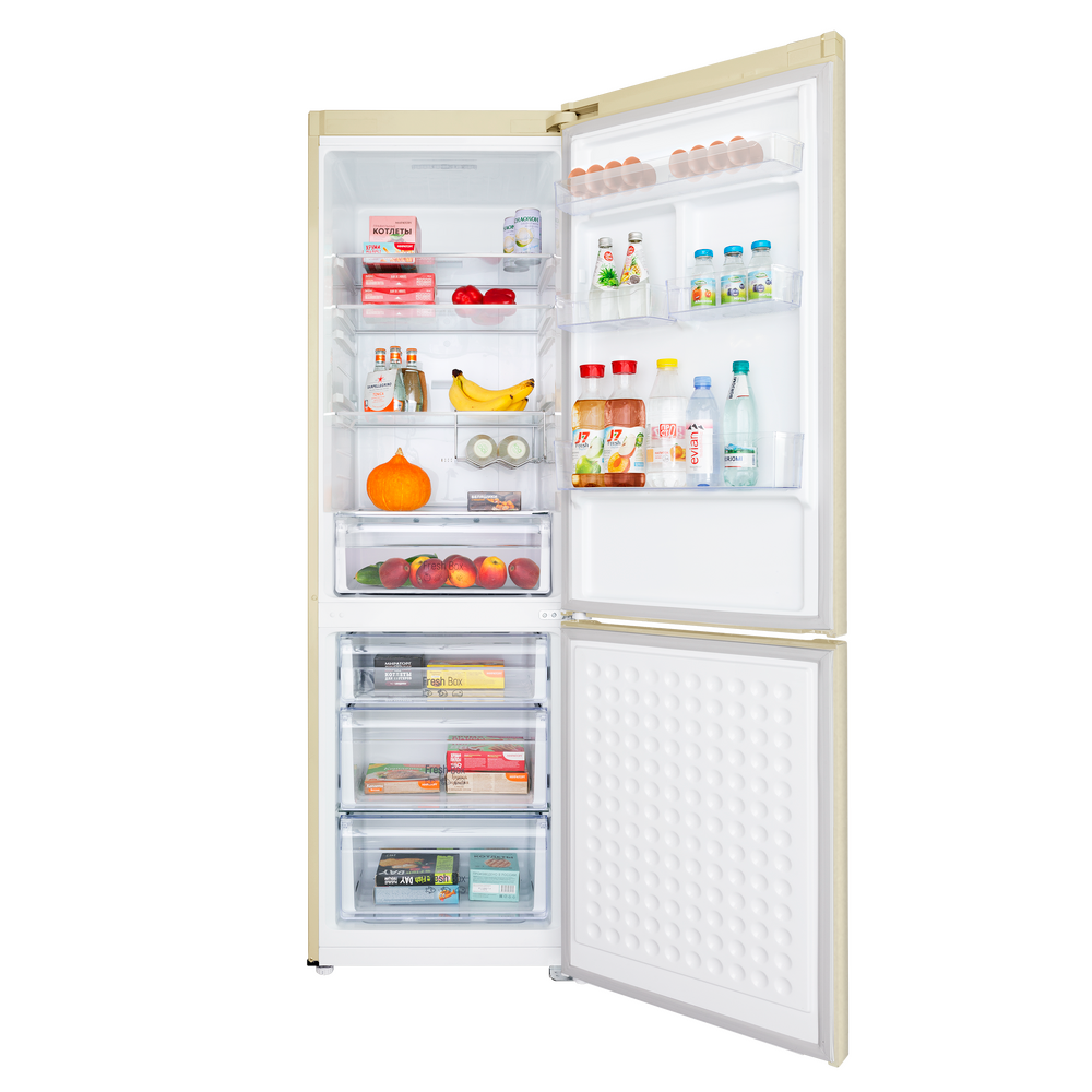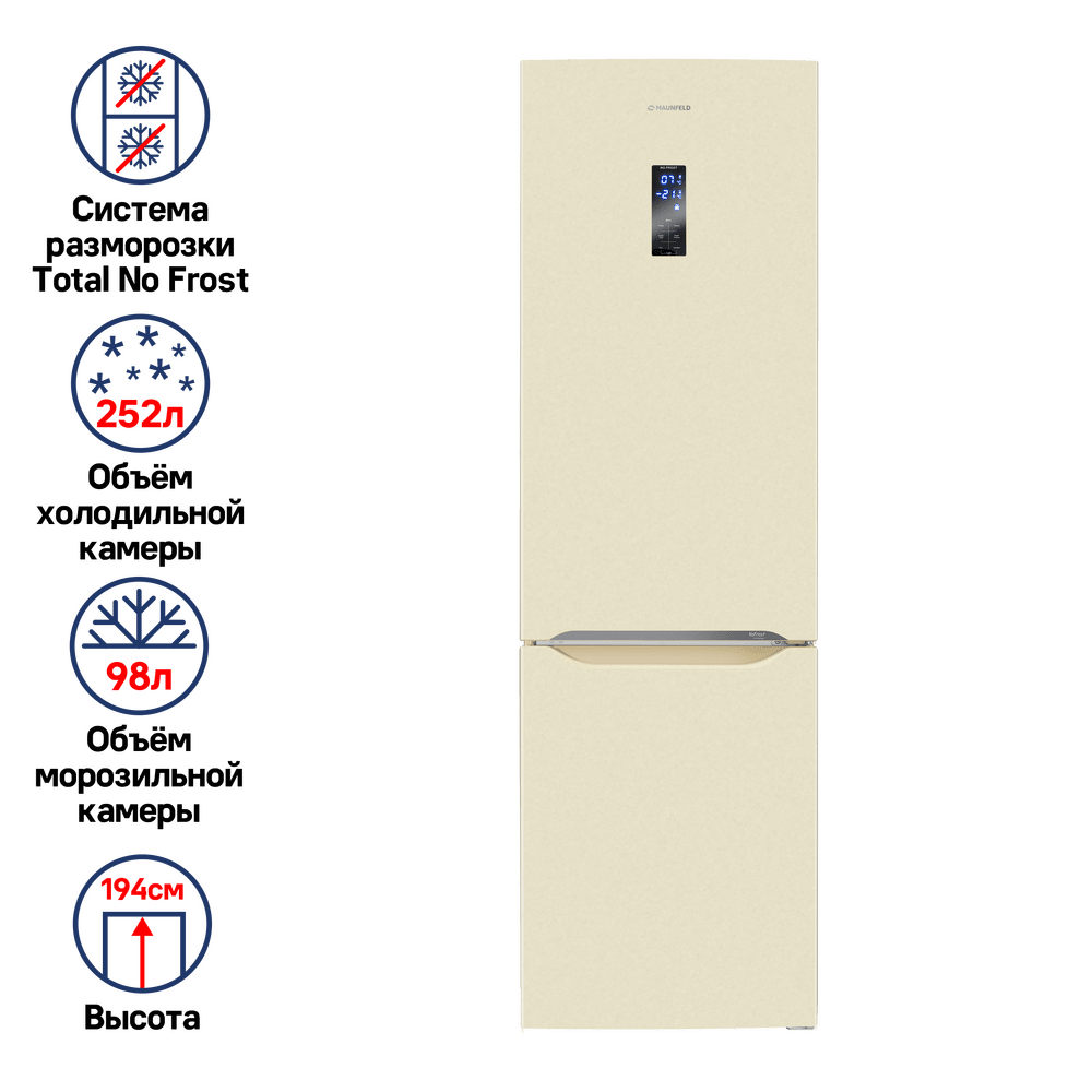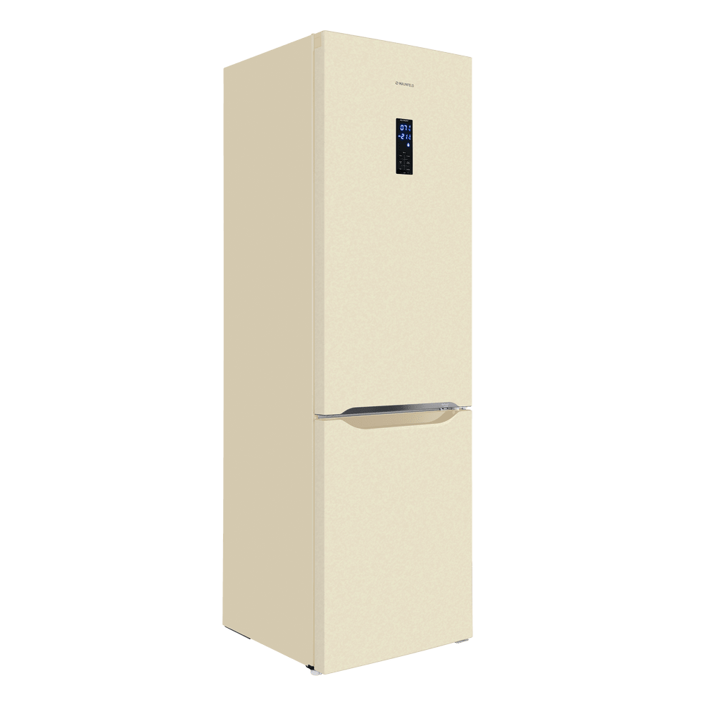 Современный двухкамерный холодильник TOTAL NO FROST шириной 60 см с сенсорной панелью управления. Фасад выполнен из металла.