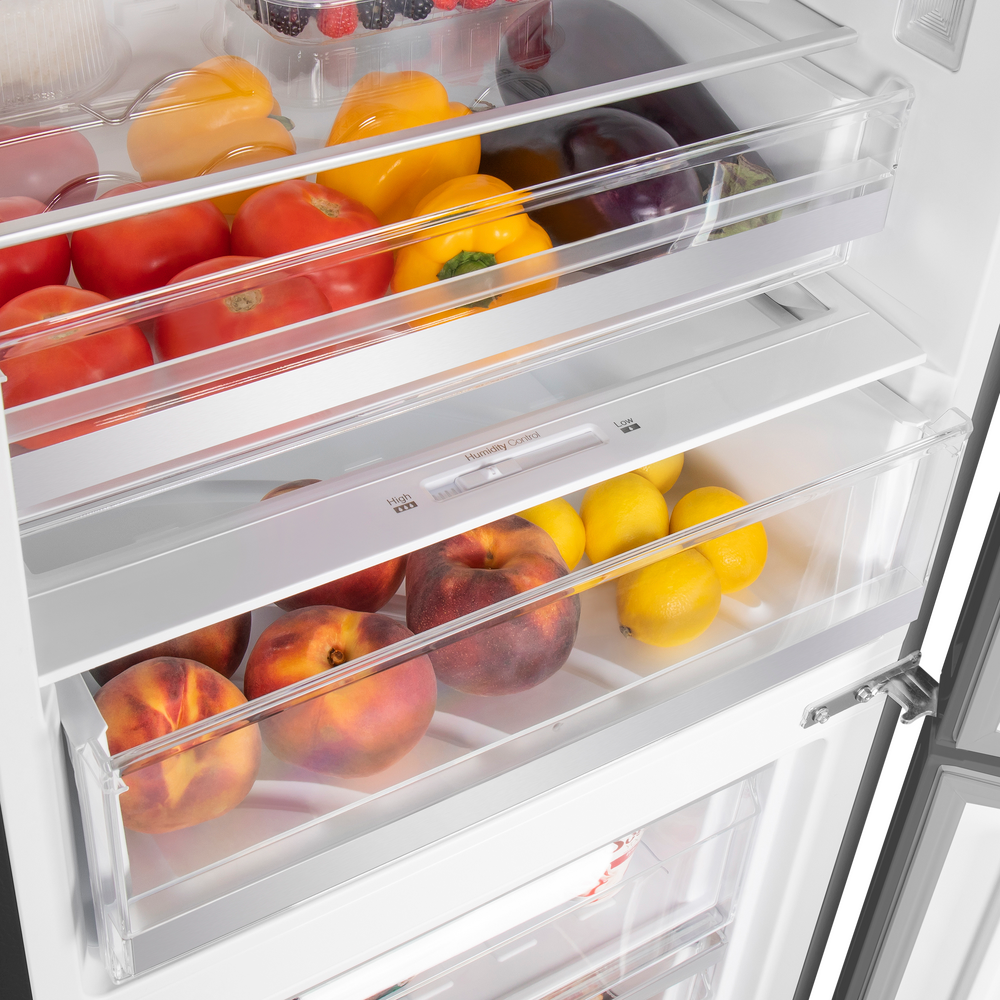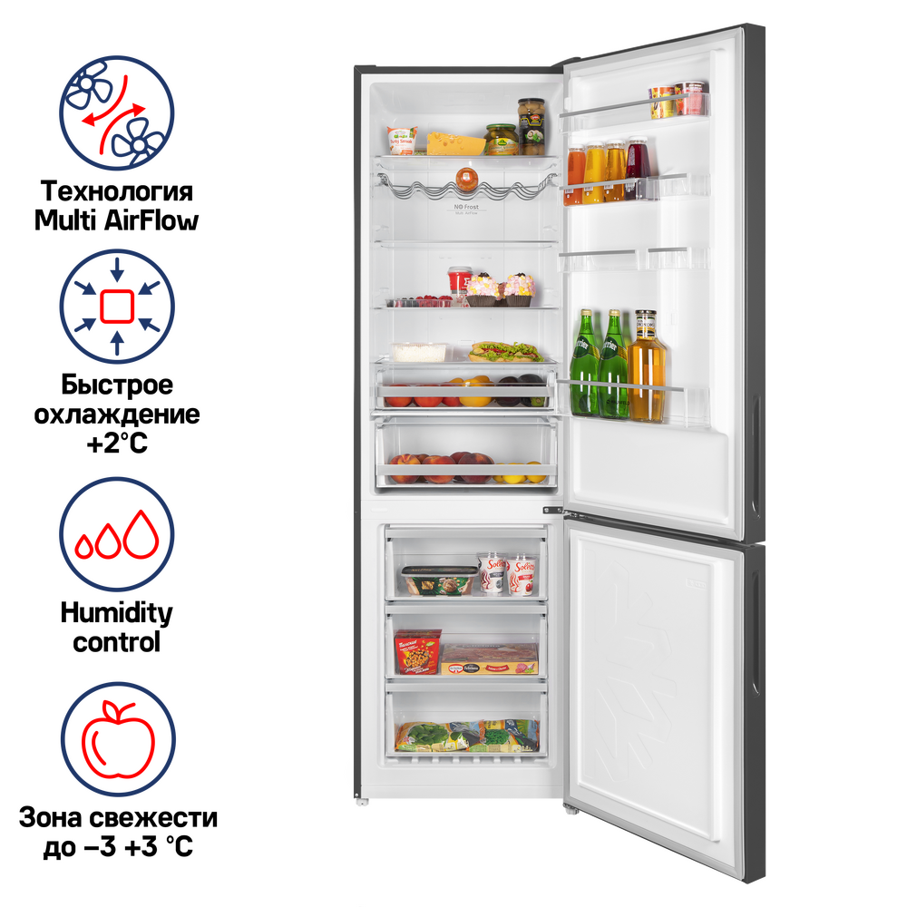 Современный двухкамерный холодильник TOTAL NO FROST шириной 60 см с многопоточным охлаждением и сенсорной панелью управления. Фасад выполнен из металла.