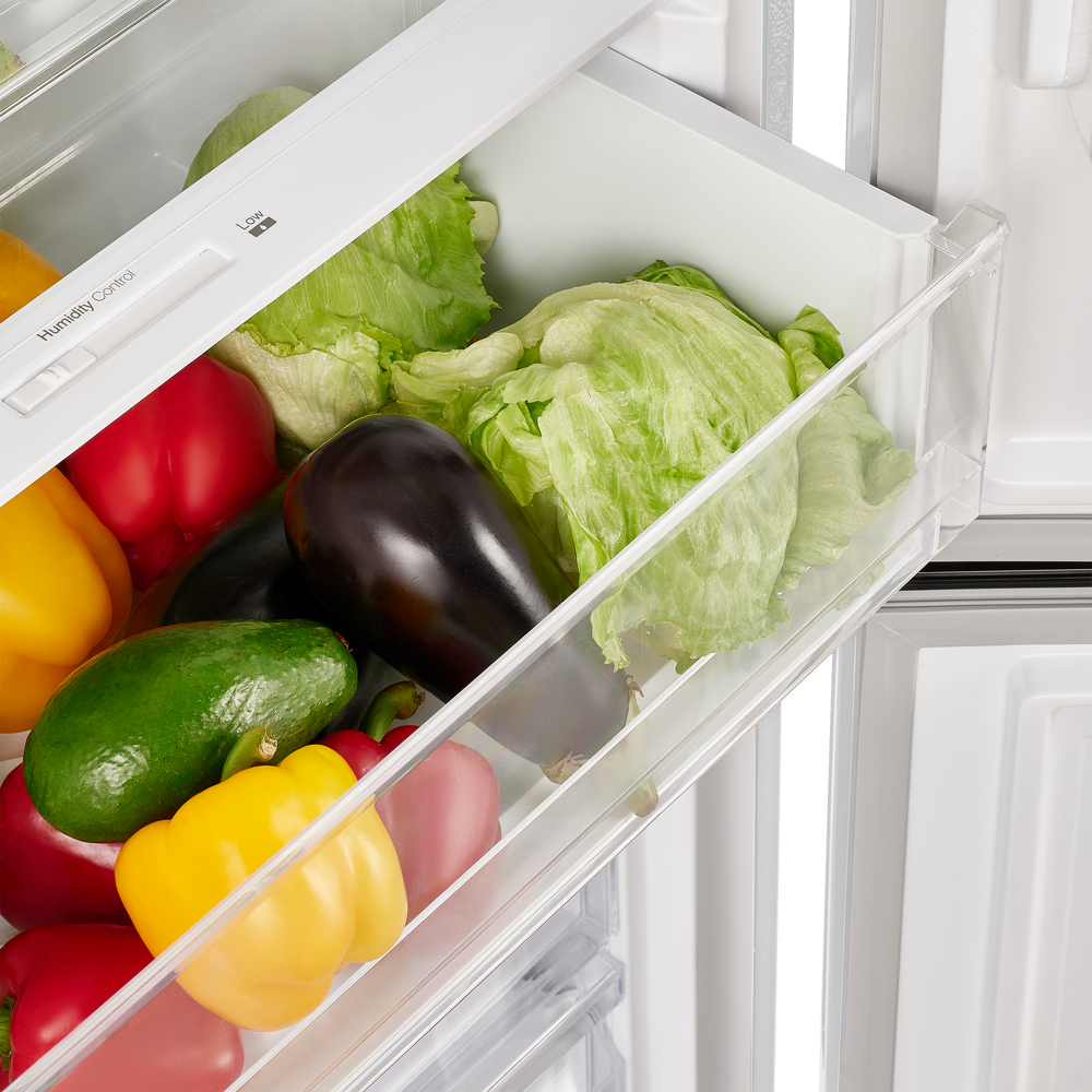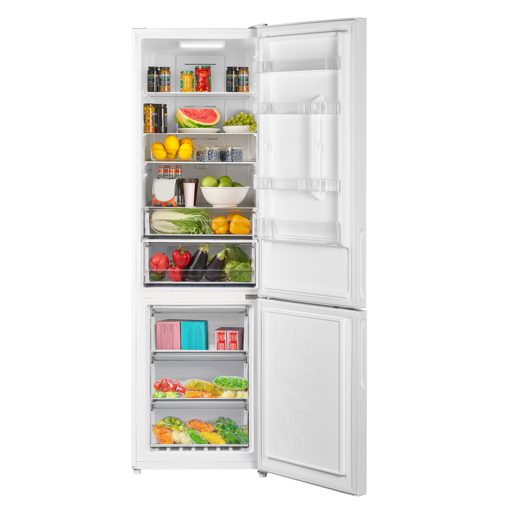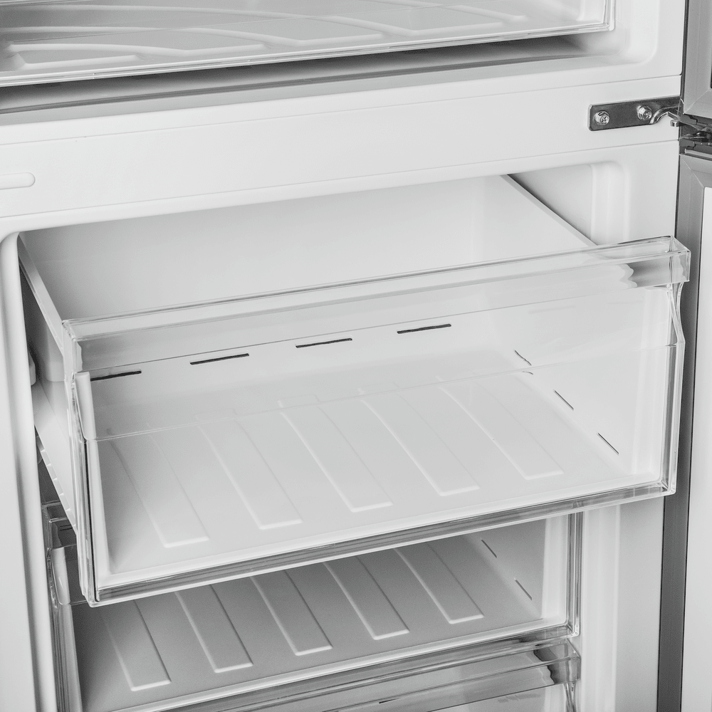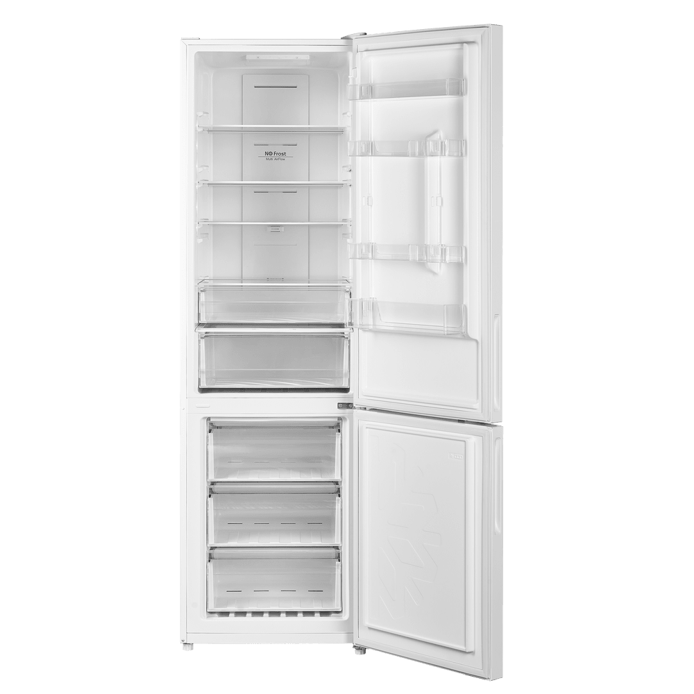Современный двухкамерный холодильник TOTAL NO FROST шириной 60 см с многопоточным охлаждением и электронным управлением. Фасад выполнен из металла.