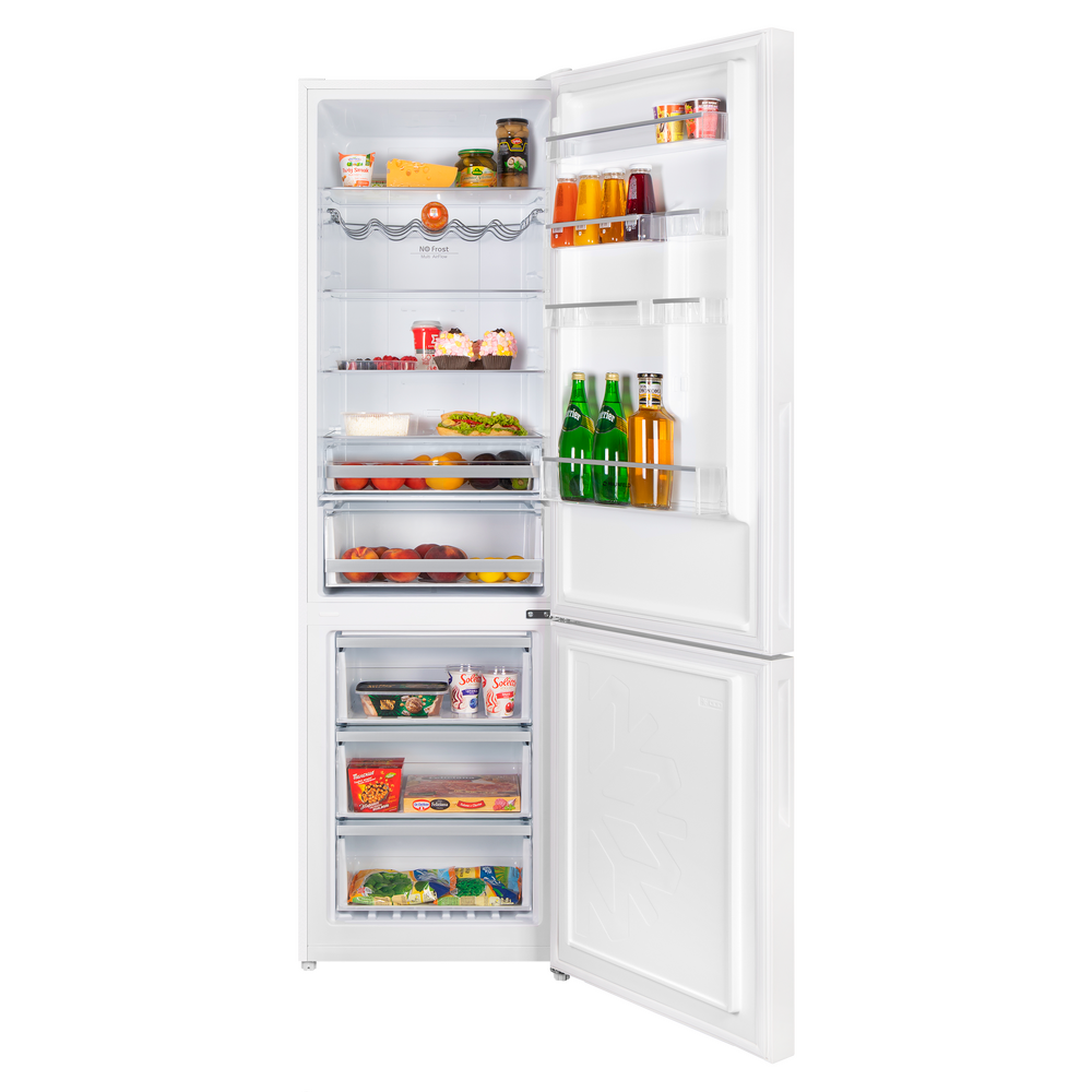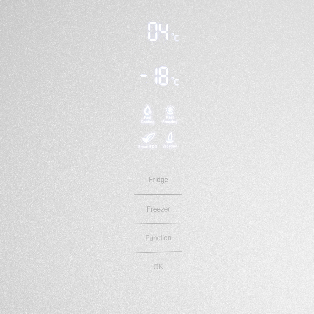 Современный двухкамерный холодильник TOTAL NO FROST шириной 60 см с инверторным компрессором, сенсорной панелью управления. Фасад выполнен из закаленного стекла.