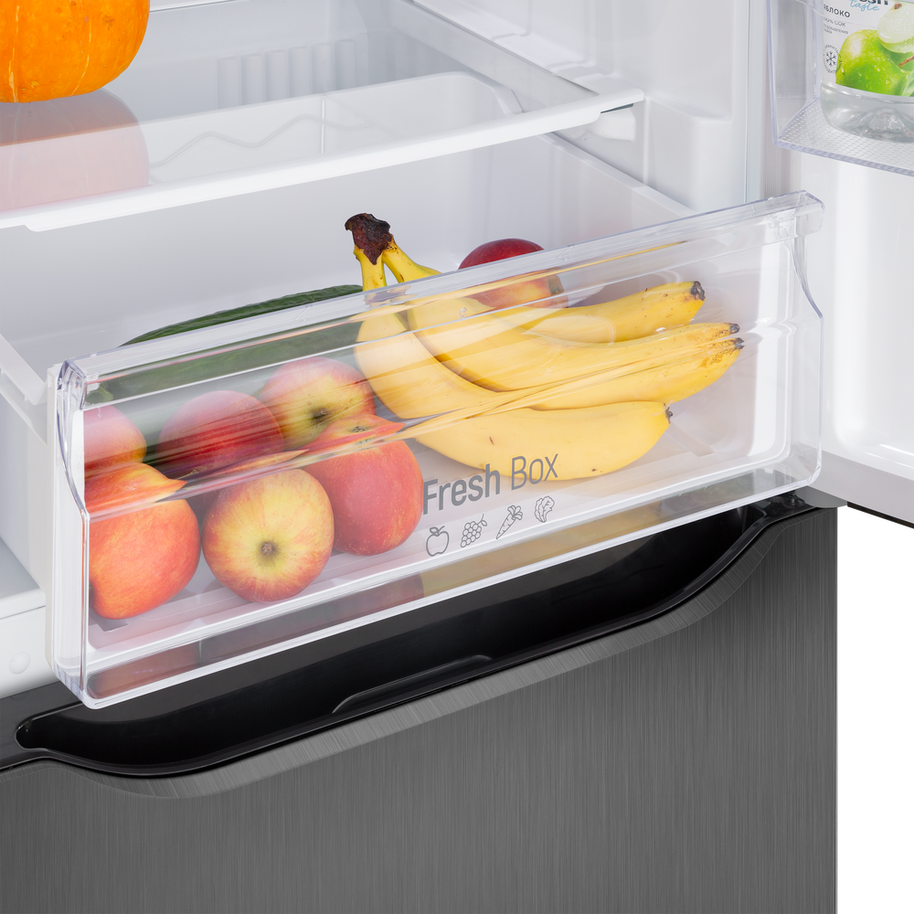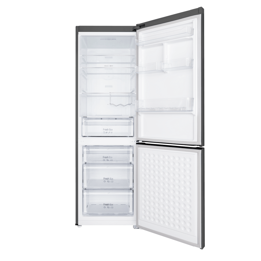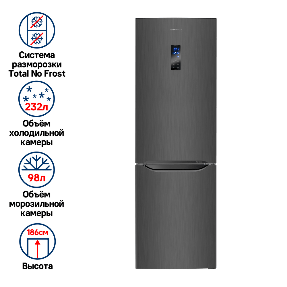 Современный двухкамерный холодильник TOTAL NO FROST шириной 60 см с инверторным компрессором, сенсорной панелью управления. Фасад выполнен из металла.