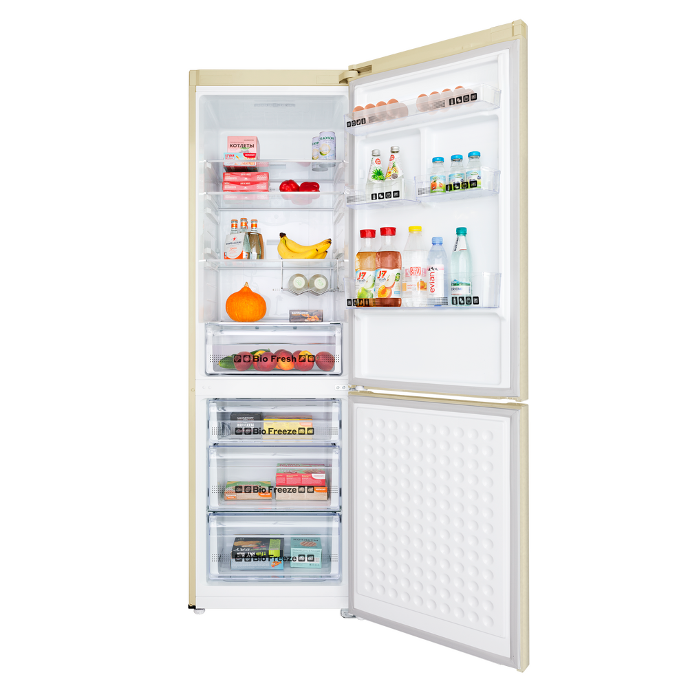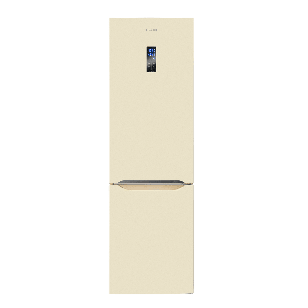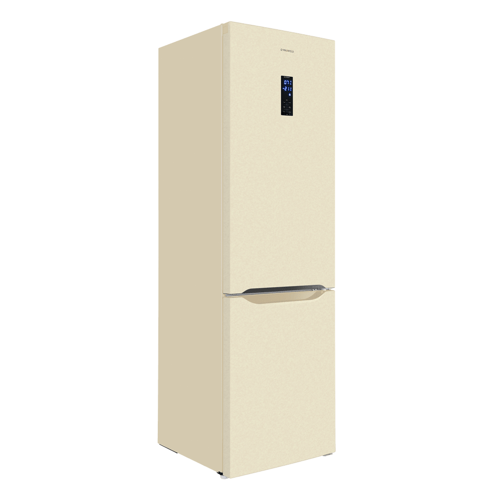 Современный двухкамерный холодильник TOTAL NO FROST шириной 60 см с инверторным компрессором, сенсорной панелью управления. Фасад выполнен из металла.