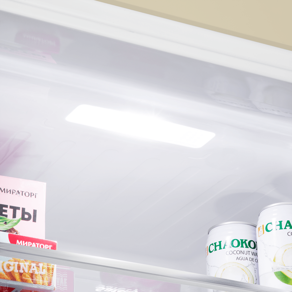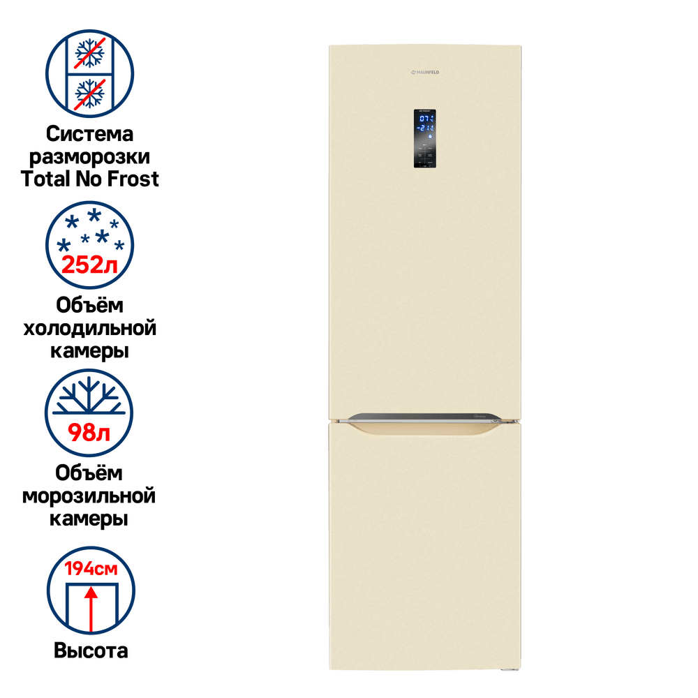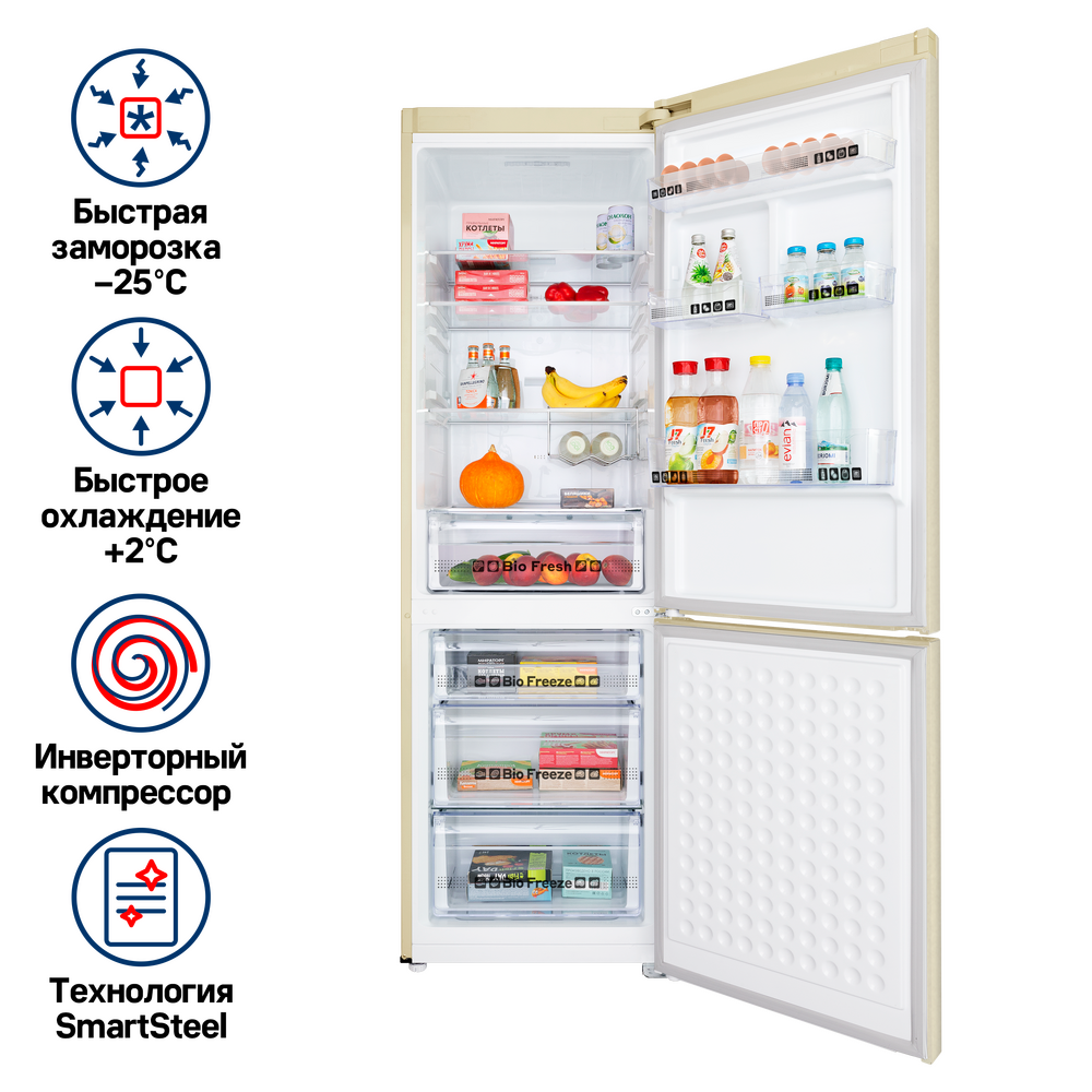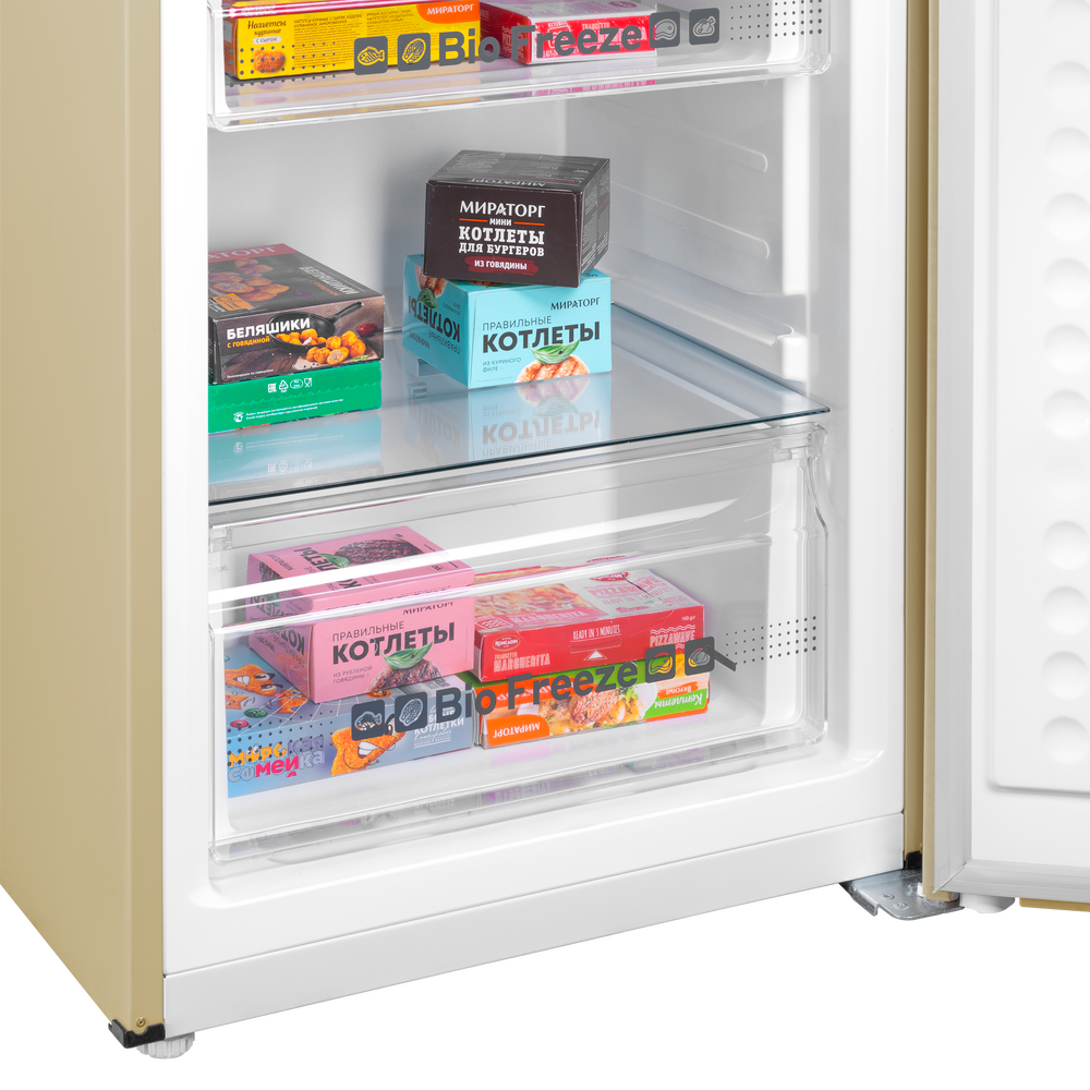 Современный двухкамерный холодильник TOTAL NO FROST шириной 60 см с инверторным компрессором, сенсорной панелью управления. Фасад выполнен из металла.