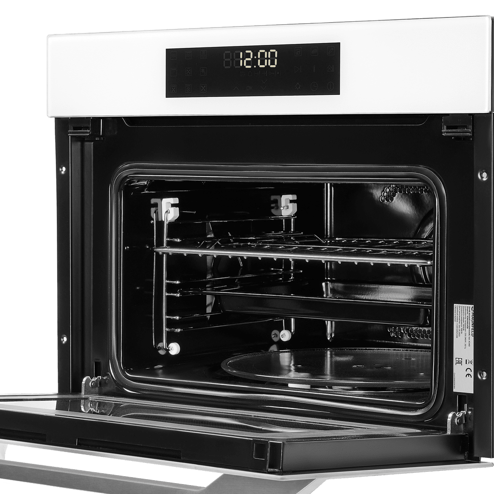 Компактный электрический духовой шкаф с функцией СВЧ может встраиваться в колонну с другой бытовой техникой.