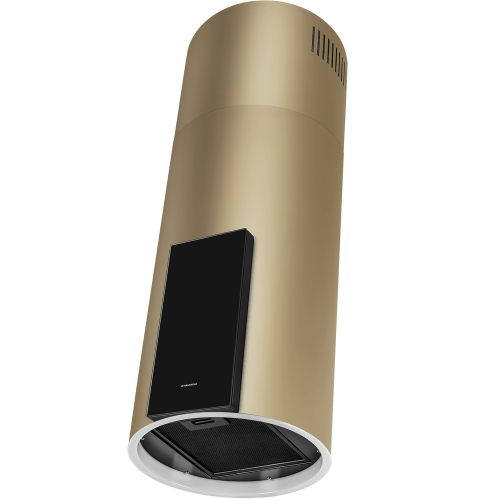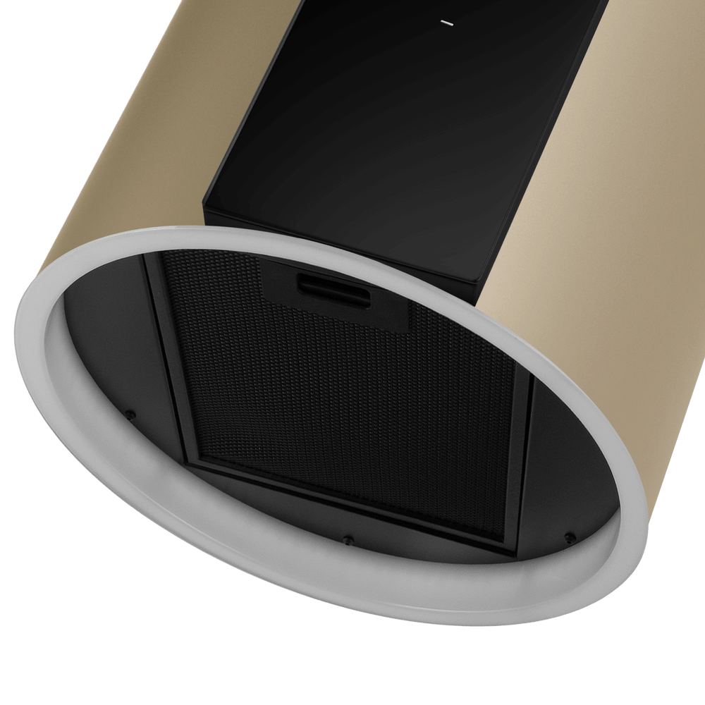 Уникальная вытяжка цилиндрической формы с возможностью изменения длины корпуса. Благодаря потолочному креплению может использоваться на островной кухне.