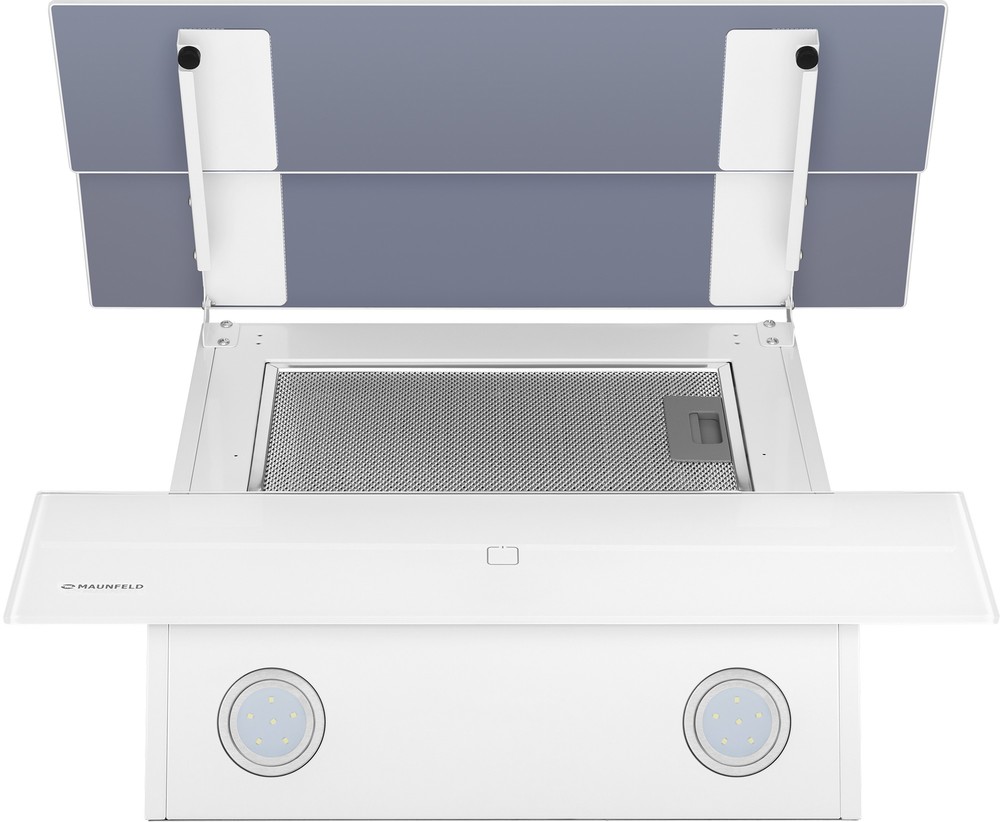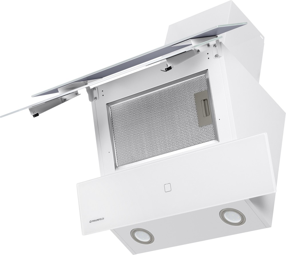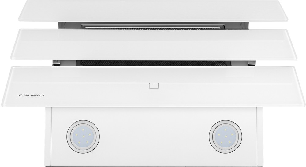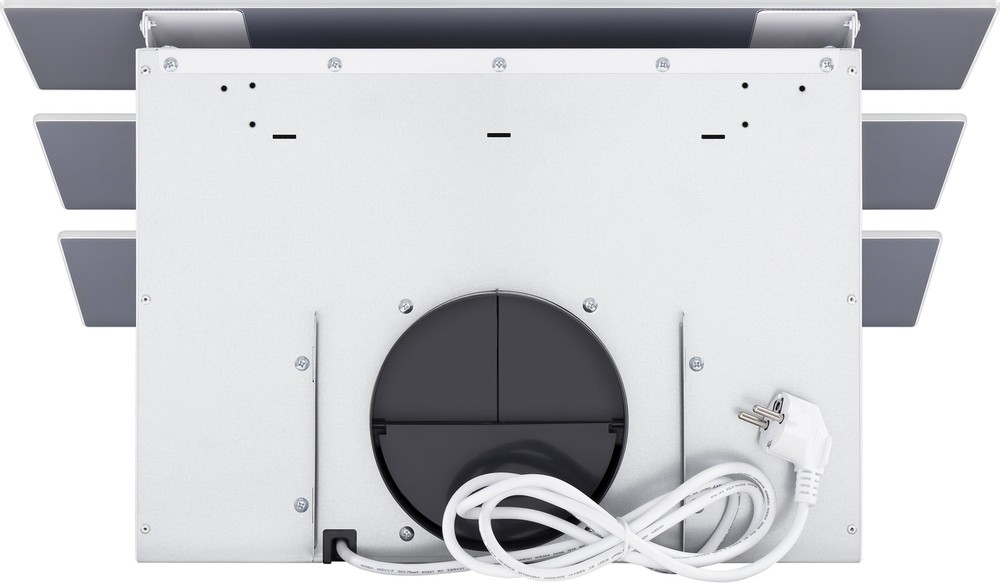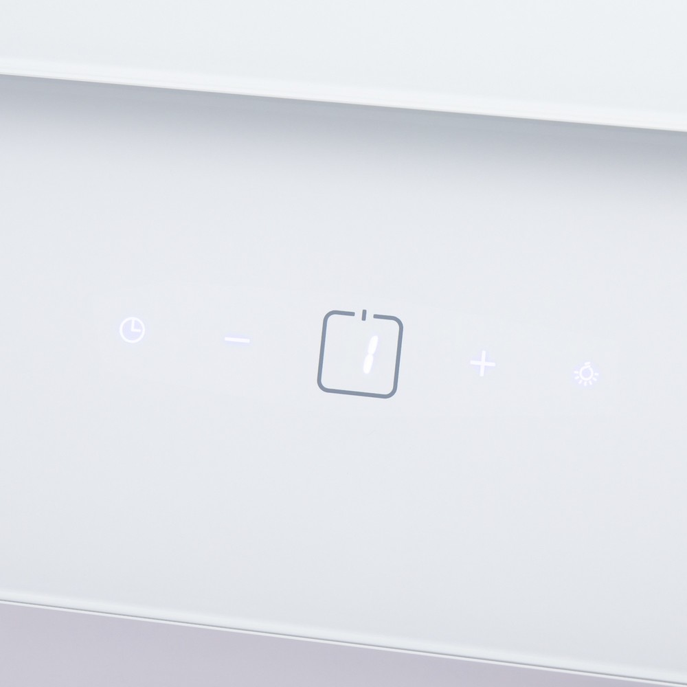 Стильная наклонная вытяжка шириной 60 см для большой кухни. Корпус из эмалированной стали. Дизайнерский фасад из каскада трех сверхпрочных закаленных стекол. Сенсорное управление с дисплеем.