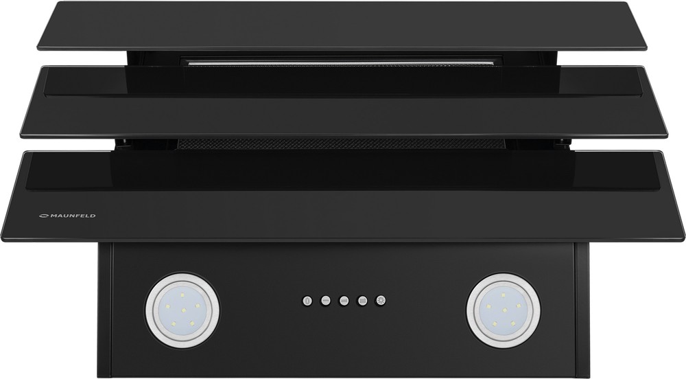 Стильная наклонная вытяжка шириной 50 см для большой кухни. Корпус выполнен из эмалированной стали. Дизайнерский фасад из каскада трех сверхпрочных закаленных глянцевых стекол.