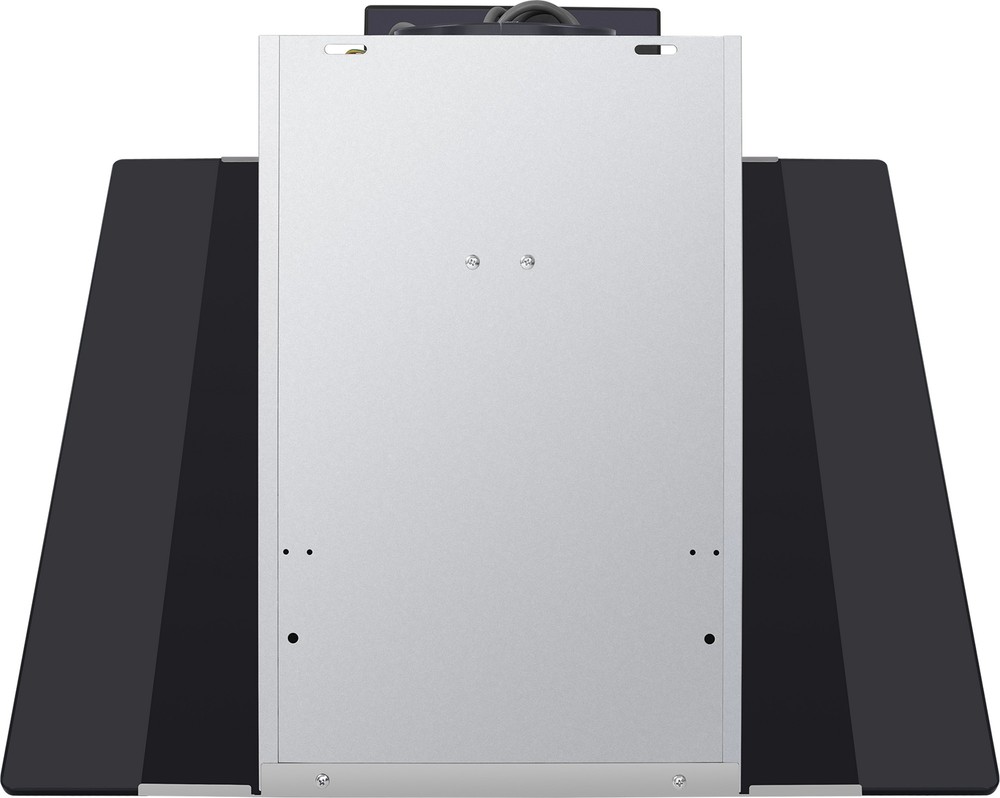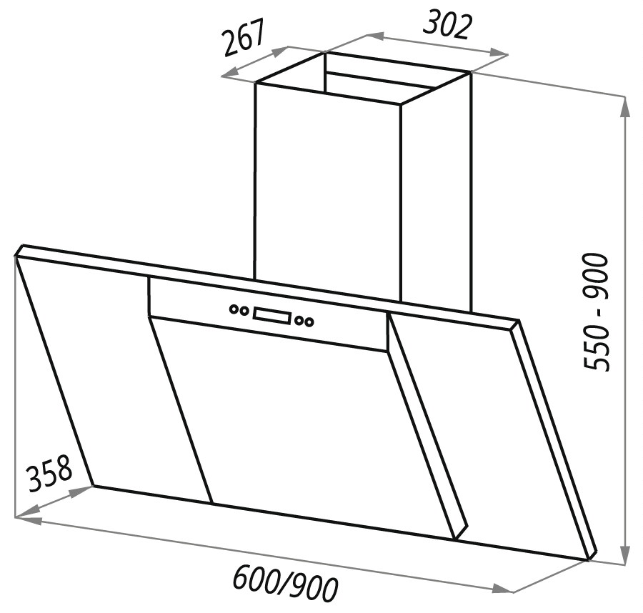 Стильная наклонная вытяжка для большой кухни выполнена из нержавеющей стали. Элегантные боковые вставки из закаленного стекла. Электронное управление с дисплеем.