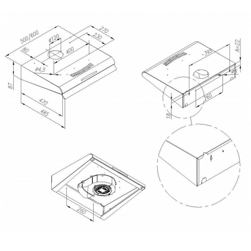 Классическая подвесная кухонная вытяжка шириной 60 см крепится к стене над поверхностью варочной плиты. Выполнена из нержавеющей стали.