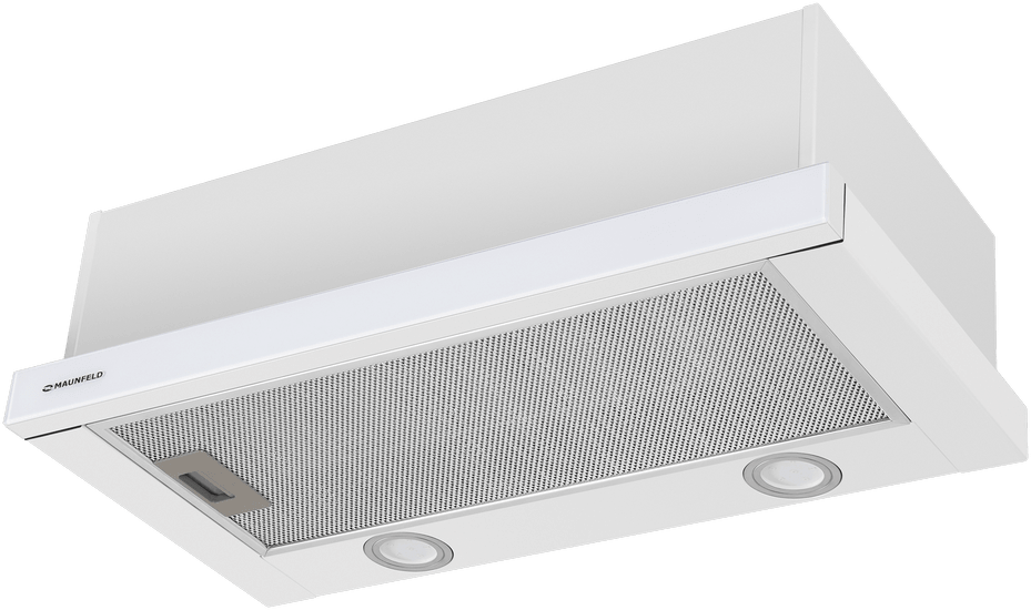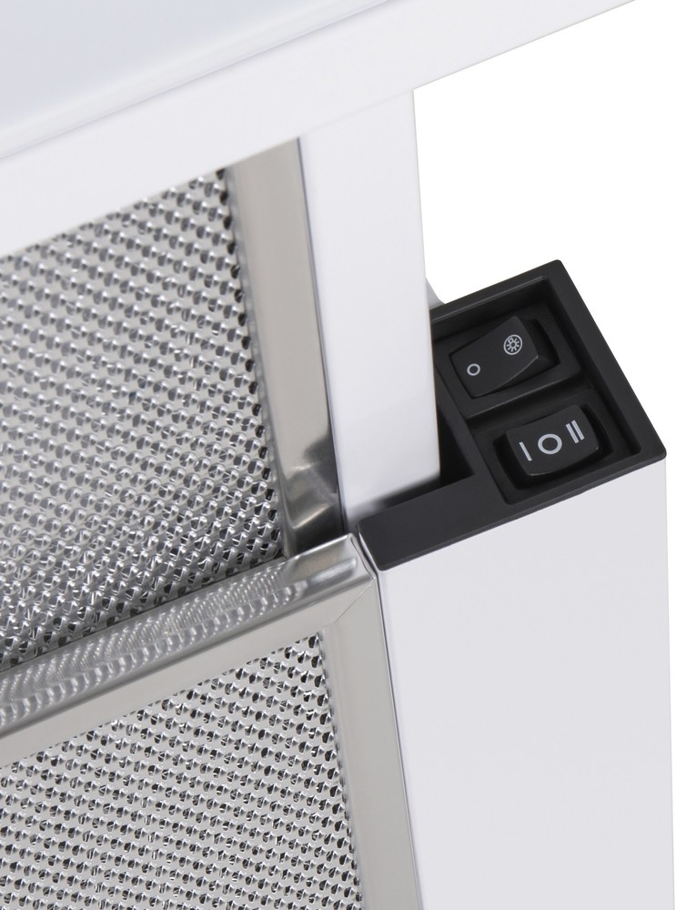 Классическая встраиваемая вытяжка шириной 60 см сделана из нержавеющей стали. Фасадная панель телескопического козырька выполнена из закаленного стекла.
