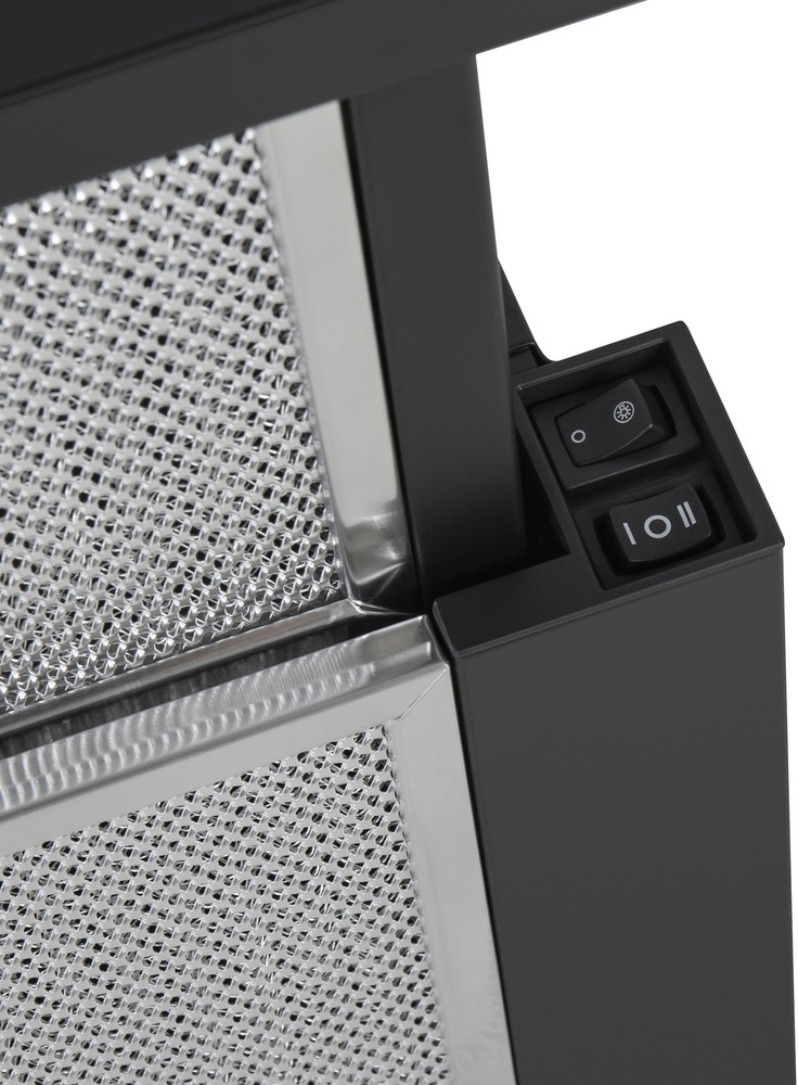 Классическая встраиваемая вытяжка шириной 60 см сделана из нержавеющей стали. Фасадная панель телескопического козырька выполнена из закаленного стекла.