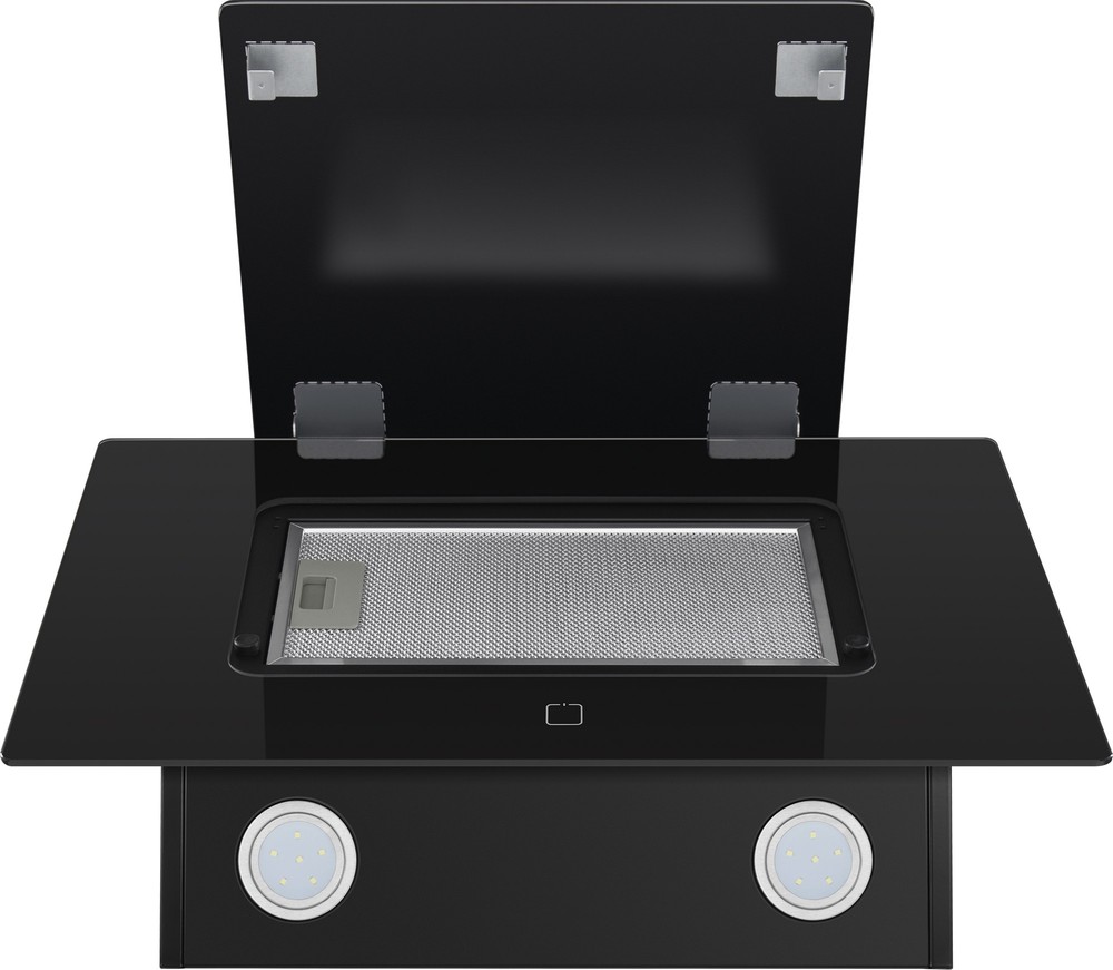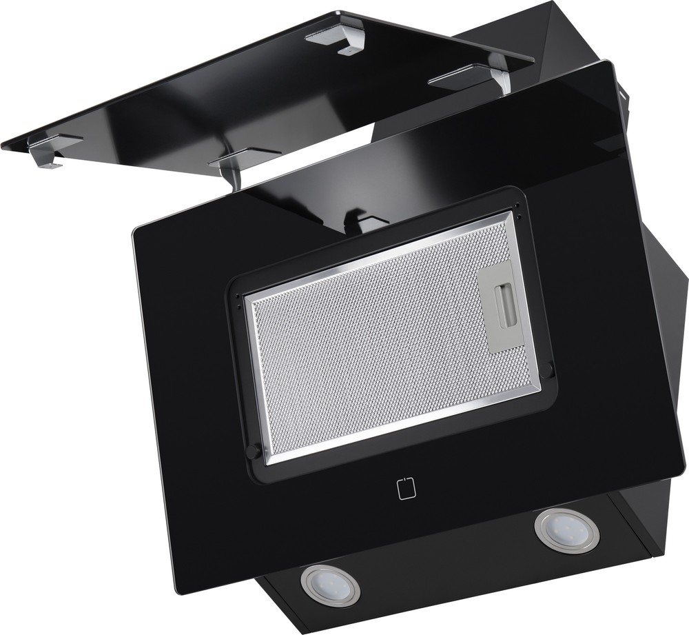 Наклонная вытяжка шириной 60 см . Корпус сделан из эмалированной стали, фасад выполнен из закаленного стекла со стеклянной крышкой. Сенсорное управление с дисплеем для выбора режима работы и установки таймера.
