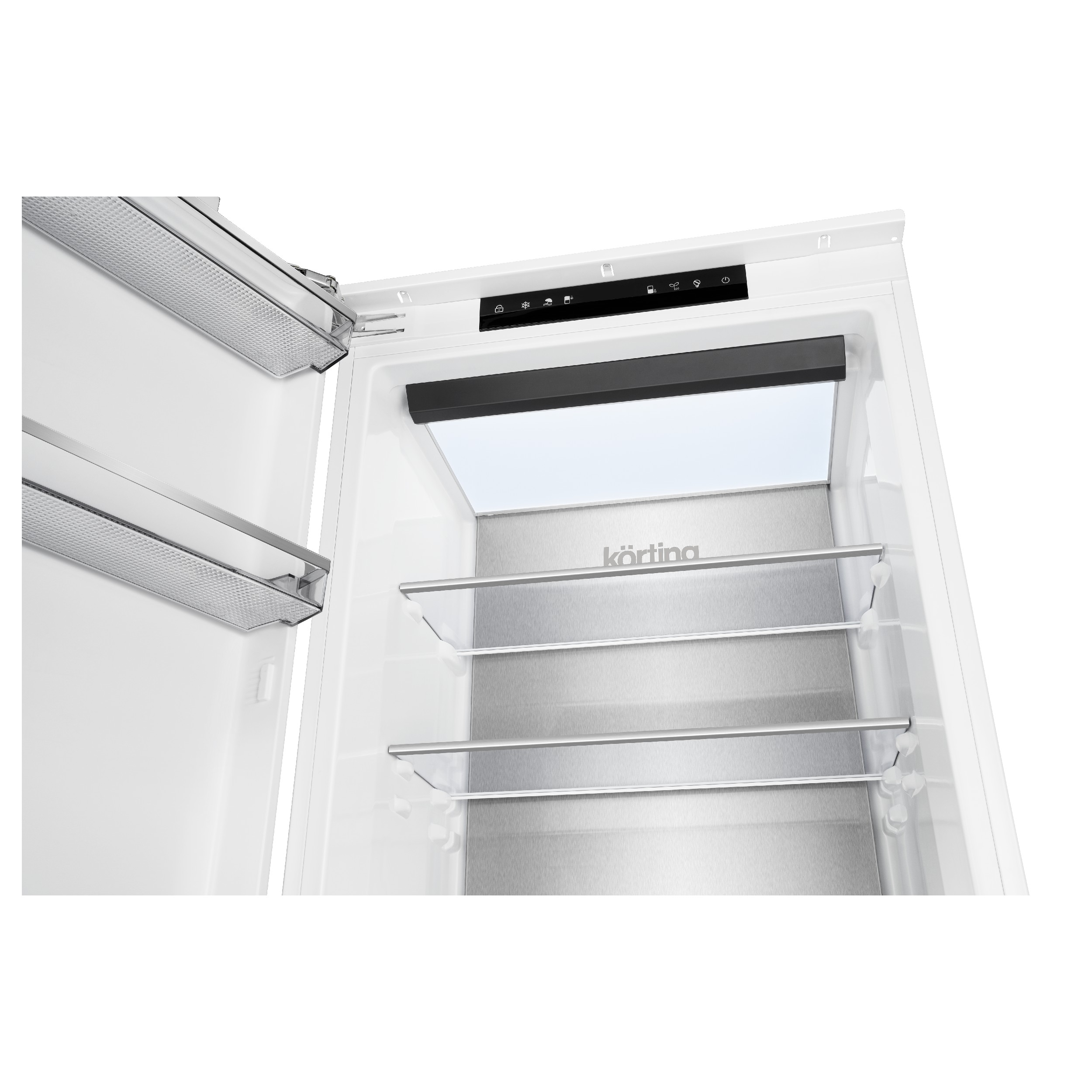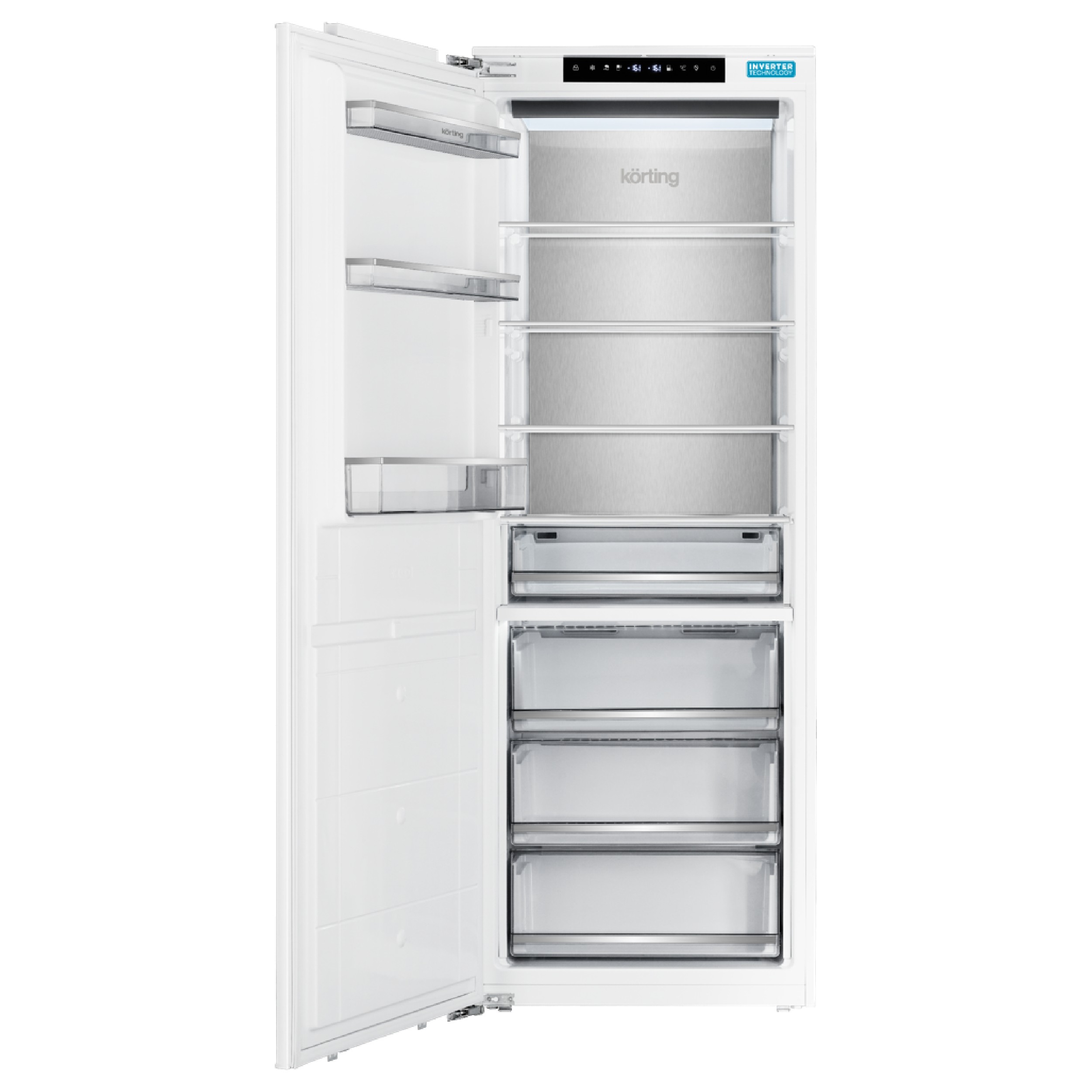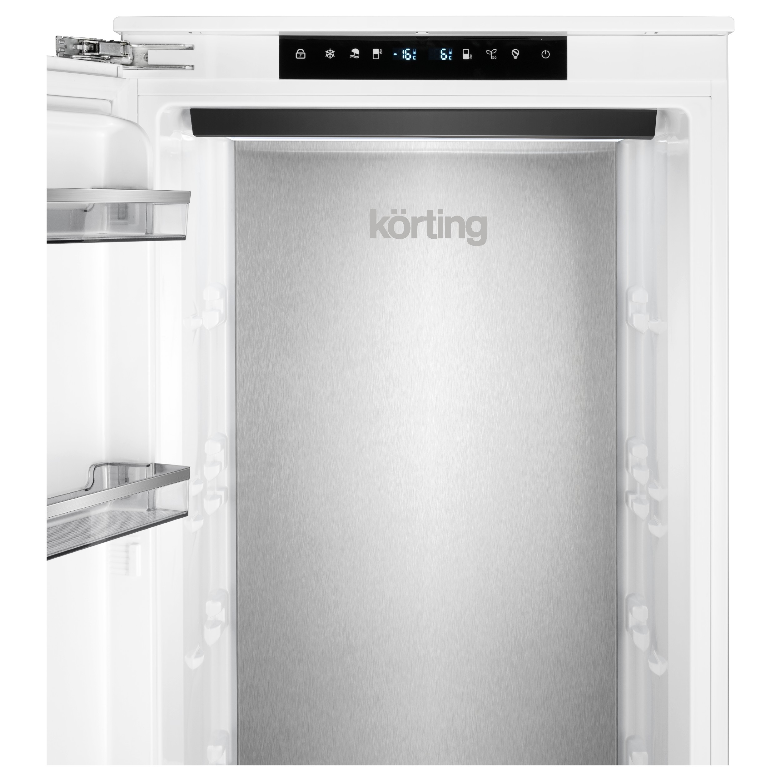 Морозильная камера KSFI 1955 — современный встраиваемый бытовой прибор, выполненный в белом цвете, с общим объемом 330 литров. Модель оснащена восемью контейнерами и лотком для льда. Отличительной особенностью прибора является раздельная регулировка температуры для верхней и нижней зон морозильника, Интуитивно понятное электронное управление и дисплей позволяют легко регулировать и контролировать параметры работы прибора. Благодаря динамическому охлаждению обеспечивается равномерное распределение холода, что способствует более эффективному хранению продуктов. Кроме того, поверхность из металла, расположенная на задней стенке холодильной камеры, помогает поддерживать заданную температуру, быстрее и равномернее охлаждать продукты, сохраняя их свежесть надолго. Функция интенсивной заморозки «Super Freeze» особенно актуальна во время сезона заготовок — для быстрого замораживания ягод, грибов и других сезонных продуктов: моментальная заморозка сохраняет питательные вещества, внешний вид и витамины. Система «No Frost» избавляет от необходимости периодической ручной разморозки благодаря автоматической системе удаления инея — вместо этого можно заниматься приятными и полезными делами. LED-освещение обеспечивает мягкий и равномерный свет, делая поиск нужных продуктов максимально удобным. Возможность самостоятельно перевешивать двери позволяет выбрать сторону открытия, чтобы идеально вписать морозильную камеру в интерьер кухни. Благодаря использованию высокоэффективного инверторного компрессора достигается высокий класс энергопотребления А+, а также низкий уровень шума — всего 41 дБ. Морозильную камеру KSFI 1955 можно объединить с холодильником KSI 1947 в просторный двухдверный Side-by-Side с большим объемом для всего запаса продуктов. Электронное управление За счет электронного управления можно наиболее точно установить необходимую температуру в холодильной и морозильной камере. Система авторазморозки «No Frost» «No Frost» это система разморозки, расположенная в морозильной камере Körting, которая не позволяет образовываться инею. Можно забыть о разморозке холодильника на долго. Функция быстрого замораживания «Super Freeze» Функция «Super Freeze» чаще используется во время сезона заготовок для заморозки ягод, грибов и других сезонных продуктов. Функция моментально замораживает продукты, сохраняя их питательные вещества, внешний вид и витамины. Перенавешивание дверцы Неважно, справа от стены стоит Ваш холодильник или слева. Благодаря перенавешиваемым дверцам холодильника, всегда можно поменять их положение, даже не прибегая к помощи сервисного центра. Высокий класс энергоэффективности Благодаря современным технологиям и качественным компрессорам, холодильники Körting имеют самые высокие показатели энергоэффективности, что позволяет Вам экономить на электричестве. Хранение при отключенном питании Если произошло отключение электроэнергии, в морозильной камере будет поддерживаться достаточно низкая температура, приемлемая для хранения скоропортящихся продуктов. Металлическая панель «COLD METAL» Поверхность из металла, расположенная на задней стенке холодильной камеры, благодаря своим свойствам, помогает поддерживать заданную температуру, быстрее и равномернее охлаждать продукты, сохраняя их свежесть надолго. Установка «Side-by-Side» Объед