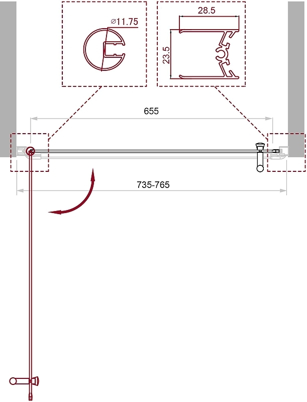 - Регулировка ширины предусмотрена за счет боковых профилей, что позволяет без проблем установить изделие даже при кривизне стен.