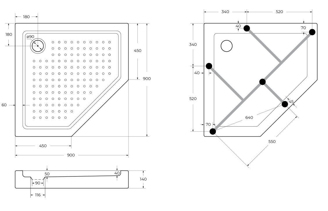 Это обеспечивает легкость и простоту ухода, а благодаря рельефной поверхности дна безопасность при приёме душа. Усиленное дно поддона и металлический каркас с регулируемыми во высоте ножками, позволяют выдерживать нагрузку свыше 250 кг. Сочетание используемых материалов и современных технологий производства, гарантирует сохранение внешнего вида и функциональности поддонов CEZARES на долгие годы. Сифон обеспечивает скорость стока воды до 30 л/мин.