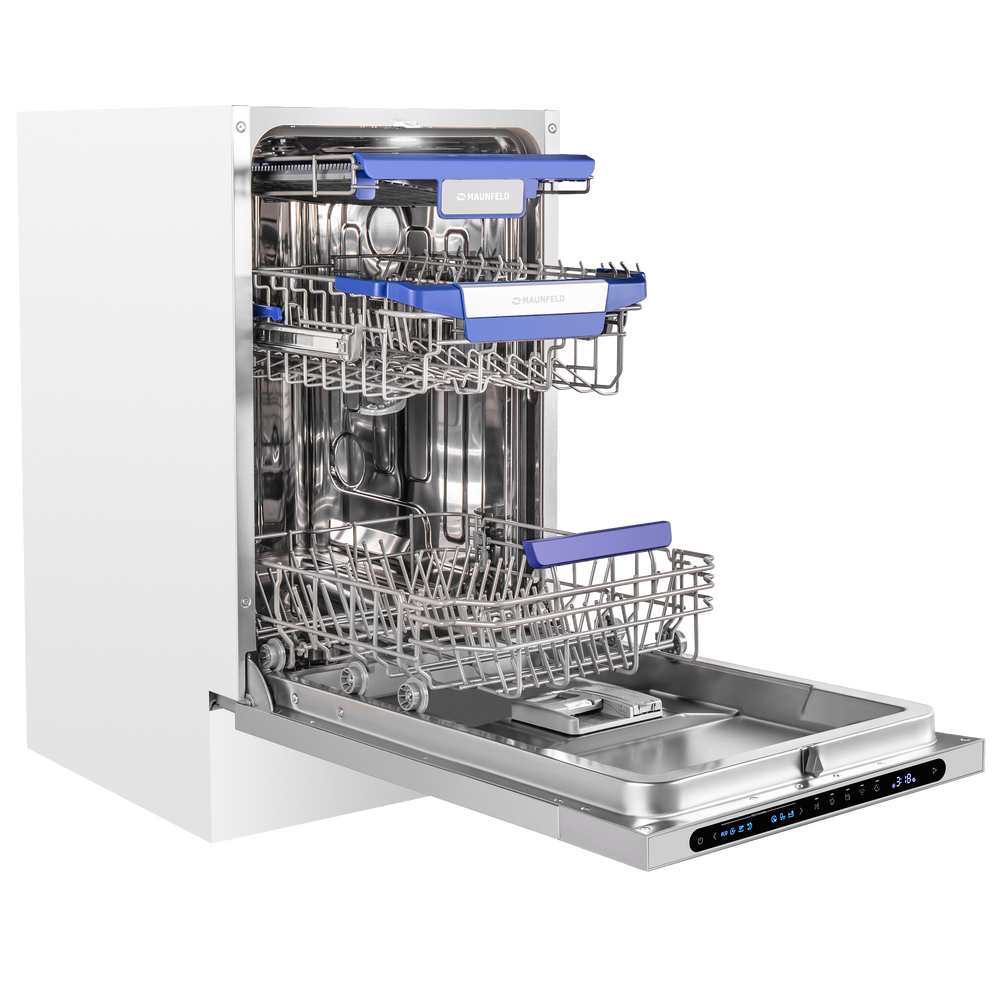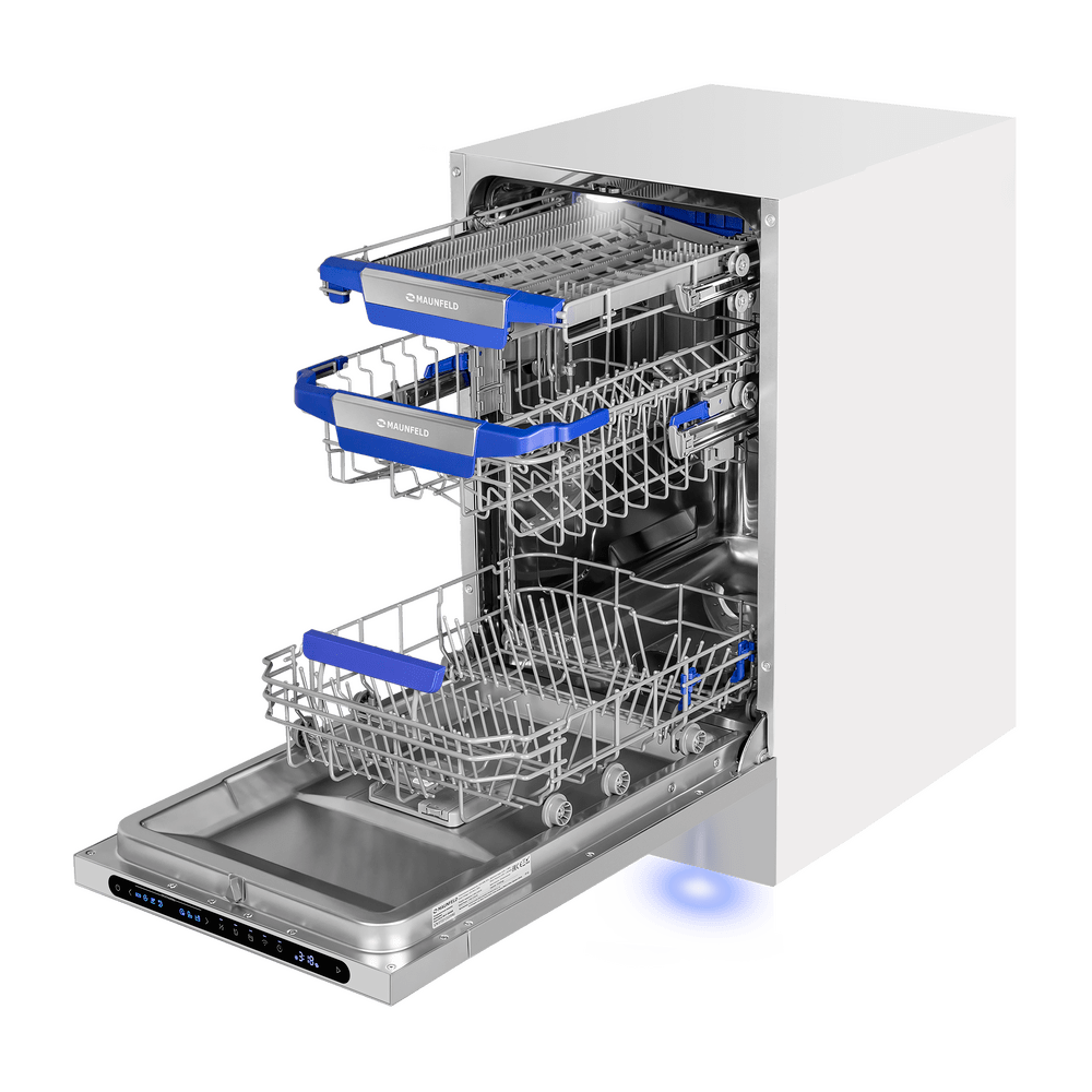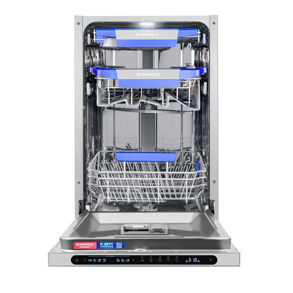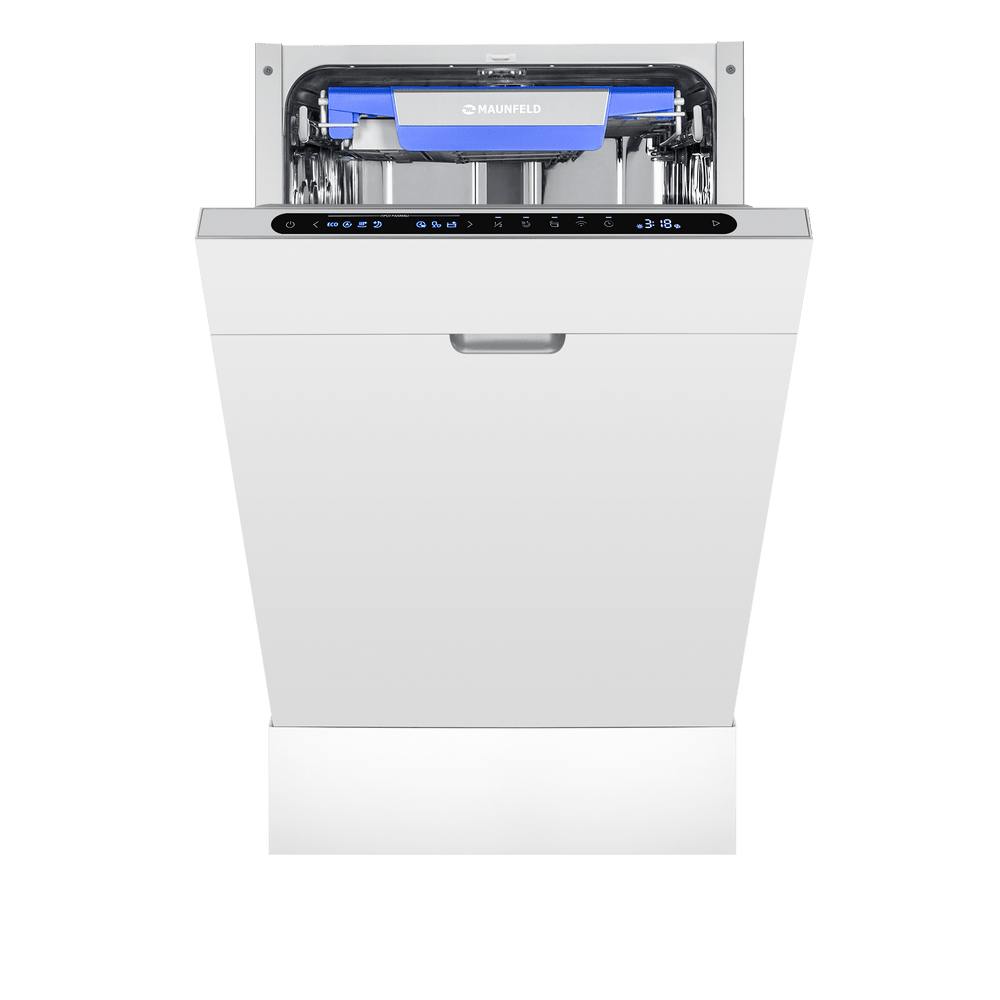 Узкая встраиваемая посудомоечная машина с функцией Aqua Stop. Модель оснащена модулем Wi-Fi управления и опцией автоматического открытия дверцы, функцией «луч на полу» .