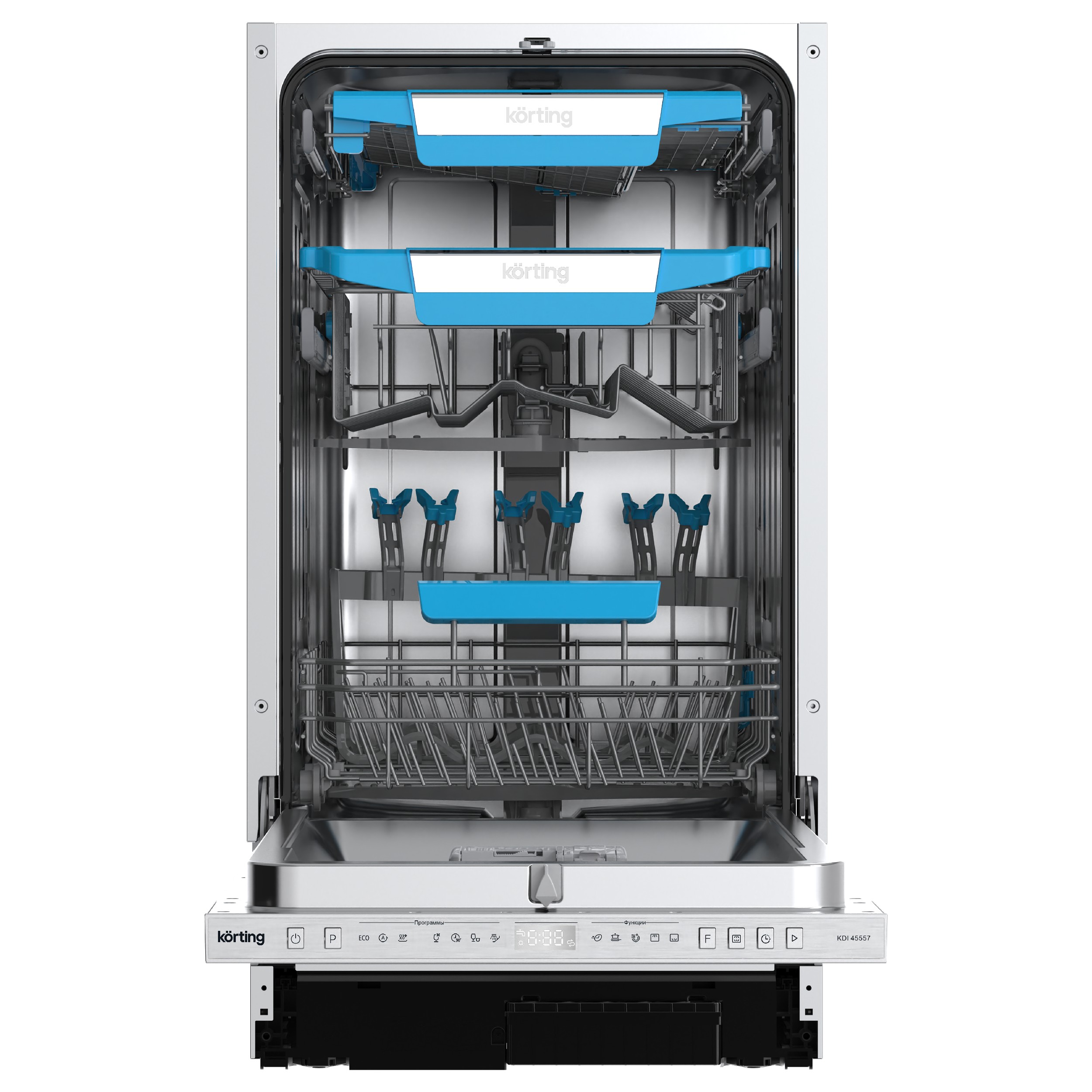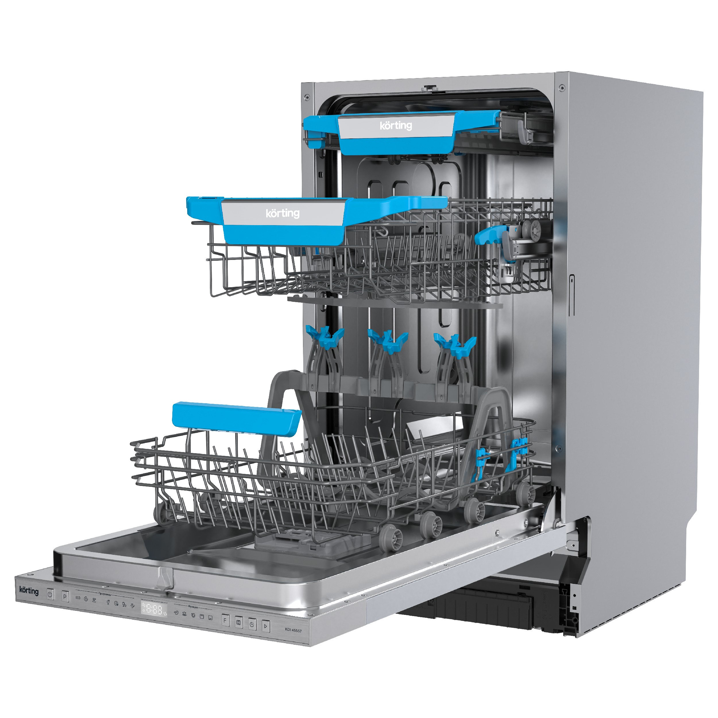 Посудомоечная машина KDI 45557 — это современный встраиваемый бытовой прибор шириной всего 45 см, что позволяет легко вписать её в небольшие кухонные пространства. Модель вмещает до десяти комплектов посуды и предлагает выбор из семи программ, что позволяет подобрать оптимальный режим для различных типов посуды и видов загрязнений. Специальная функция «Экспресс-мойка» может быть применена практически ко всем программам: одним нажатием кнопки ускоряется процесс мытья, при это не страдает качество. Программа «Гигиена» обеспечивает дополнительную защиту от бактерий и микробов, что делает её идеальной для мытья детской посуды и кухонных аксессуаров. Она гарантирует чистоту и безопасность без необходимости использования дополнительных химических средств. Режим «Экстра-сушка» немного увеличивает продолжительность выбранной программы, но значительно улучшает качество сушки посуды. Машина оснащена тремя корзинами и держателем для бокалов, регулятор высоты позволяет легко изменять расположение верхней корзины. Обновленный дизайн панели управления с цифровым дисплеем делает использование прибора еще более наглядным и удобным. Модель поддерживает комбинированные моющие средства в одной таблетке «All in 1» и оснащена слайдерным диспенсером для моющих средств. Для повышения удобства в повседневном использовании предусмотрена функция отложенного старта от 1 до 24 часов. Благодаря особой форме разбрызгивателей «S-Form» потоки воды равномерно распределяются по всей камере, эффективно удаляя загрязнения с посуды на всех уровнях. Функция «Луч на полу» проецирует световой индикатор на пол во время выполнения программы и отключает его по завершении процесса мойки. Внутреннее LED-освещение камеры добавляет комфорта и позволяет контролировать чистоту внутри прибора. Посудомоечная машина KDI 45557 обеспечивает полную защиту от протечек «AquaControl» и «AquaStop», имеет класс энергопотребления A++ и отличается низким уровнем шума, не превышающим 47 дБ. 7 программ мойки 7 программ - это оптимальный набор режимов для мойки с любым типом посуды. Система защиты от протечек «AquaStop» Специальная конструкция состоящая из двухслойного шланга и особого механизма, расположенного в месте подсоединения к точке водоснабжения, перекроют залив воды в случае избыточного давления. Такая система защиты работает автономно без Вашего участия. Система защиты от протечек «AquaControl» Система защиты от протечек «AquaControl» защитит Вас и Ваших соседей в случае возникновения протечки. Такая система защиты работает автономно без Вашего участия. Корзина для столовых приборов «C-Shelf» Третья корзина «C-Shelf» находится в самом верху и предназначена для столовых приборов, лопаток, венчиков и других аксессуаров, которые необходимы в процессе приготовления. Благодаря ней Вы сможете загрузить намного больше предметов и распределять посуду более эффективно. Функция «Экспресс-мойка» Специальная функция, применяемая практически во всех программах. Позволяет быстро и без потери качества мойки удалить с посуды загрязнения. Программа Гигиена Специальный режим, который обеспечивает дополнительную защиту от бактерий и микробов. При высокой температуре и длительном процессе мытья, программа эффективно устраняет не только остатки пищи, но и потенциально опасные микроорганизмы, обеспечива