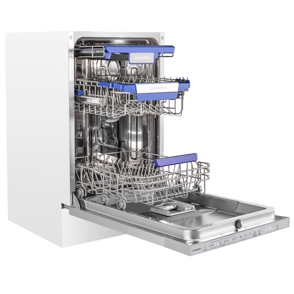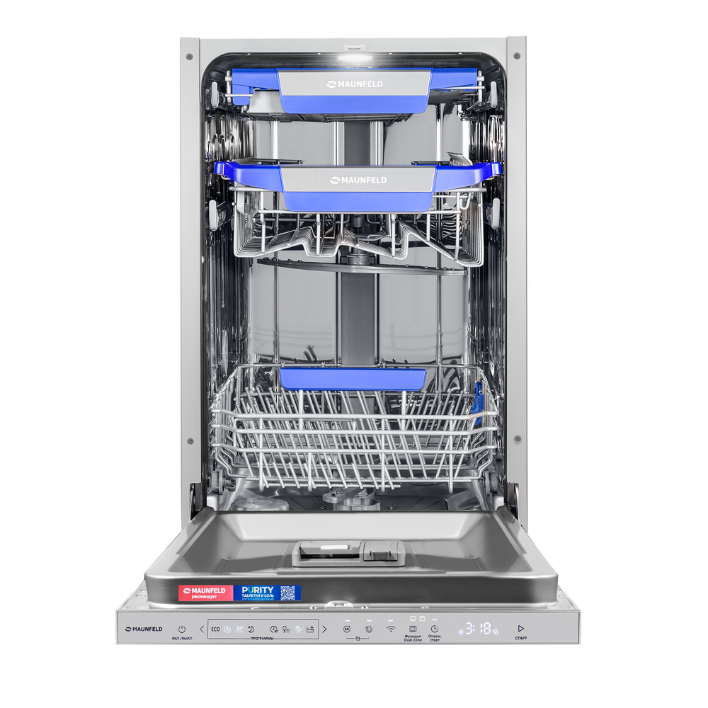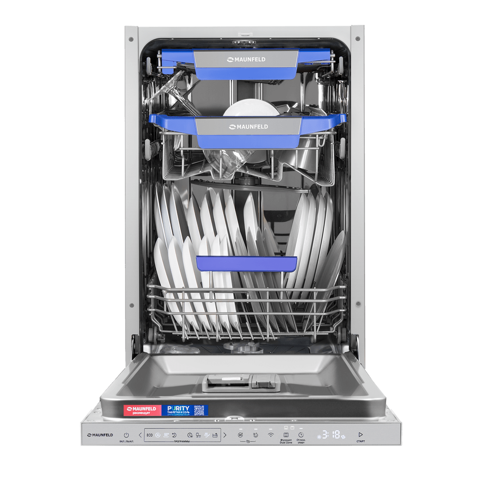 Узкая встраиваемая посудомоечная машина с функцией Aqua Stop. Модель оснащена модулем Wi-Fi управления, инверторным двигателем, опцией автоматического открытия дверцы, и проекцией таймера на пол .