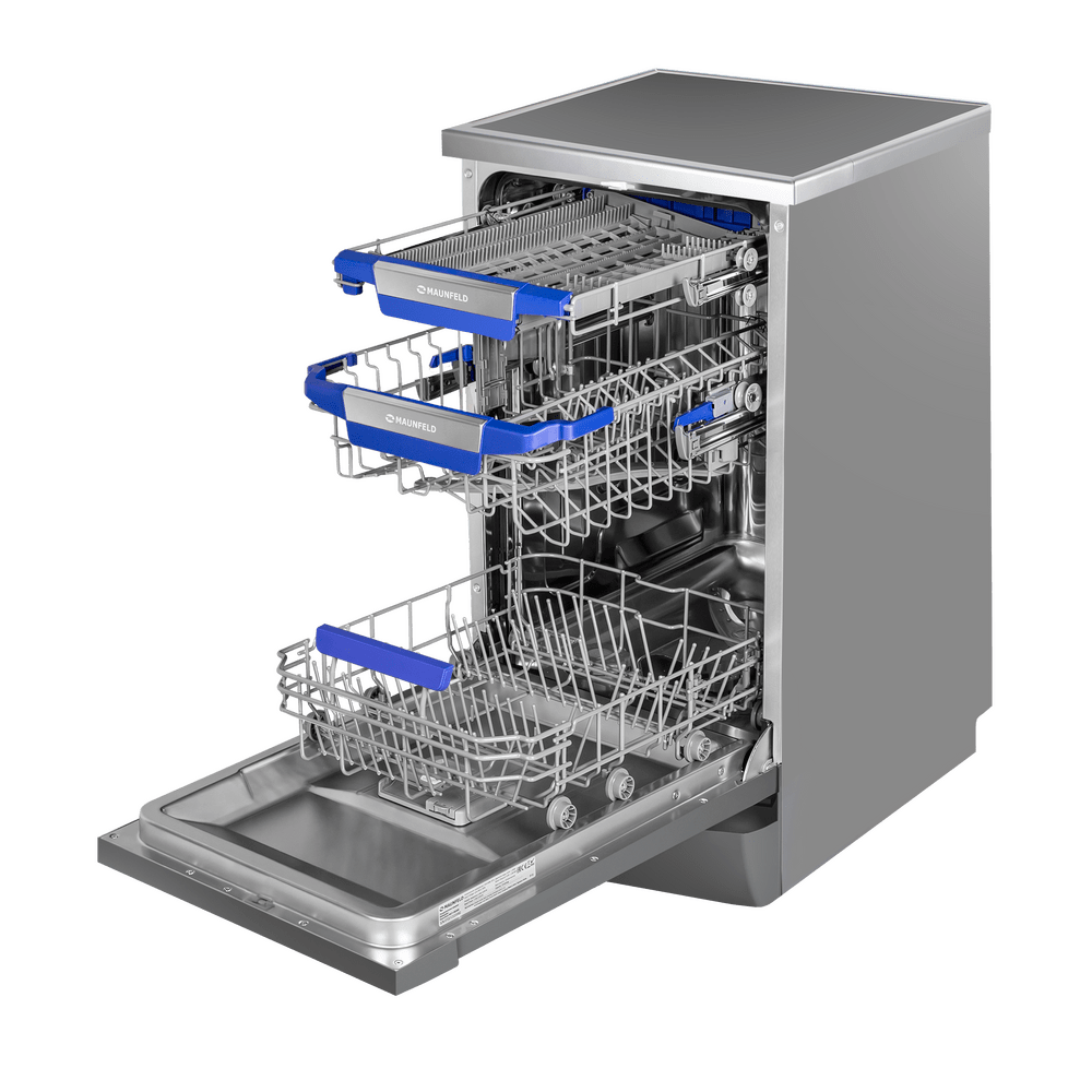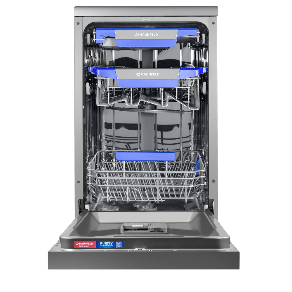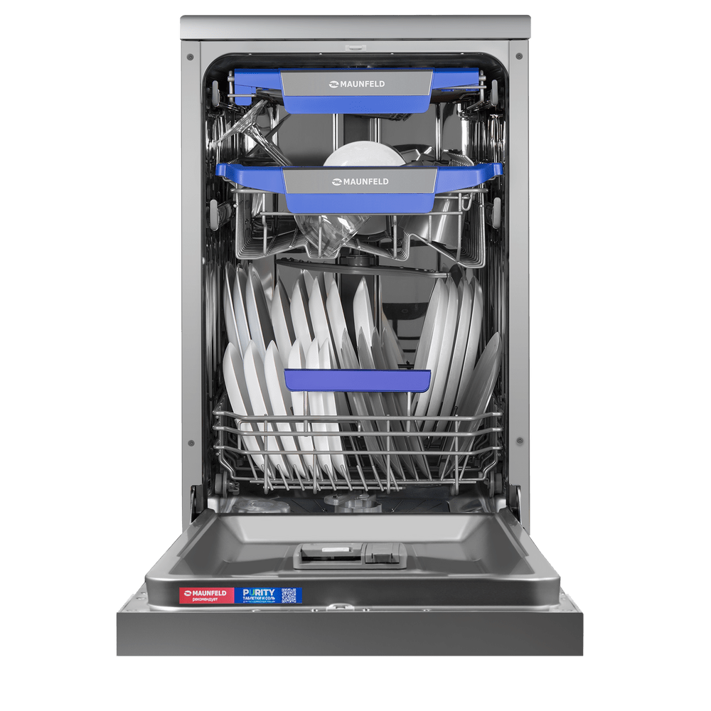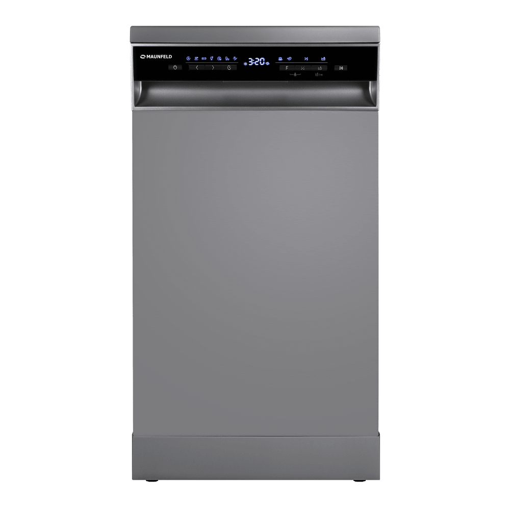 Узкая посудомоечная машина MAUNFELD MWF45331S с аквастопом. На большом и широком светодиодном дисплее можно с комфортом просматривать всю информацию о посудомоечной машине.