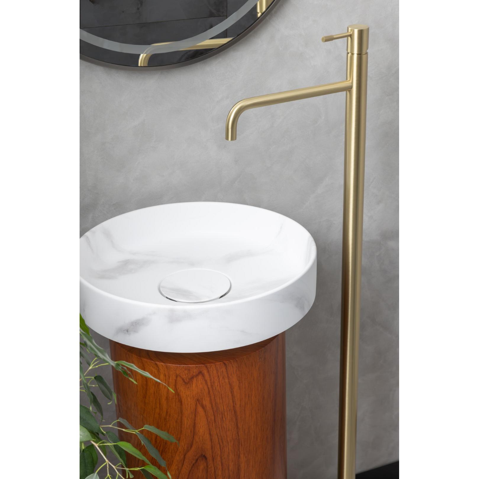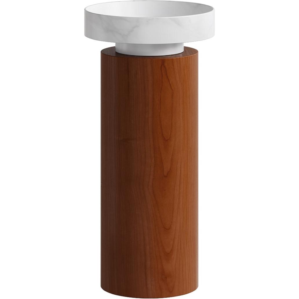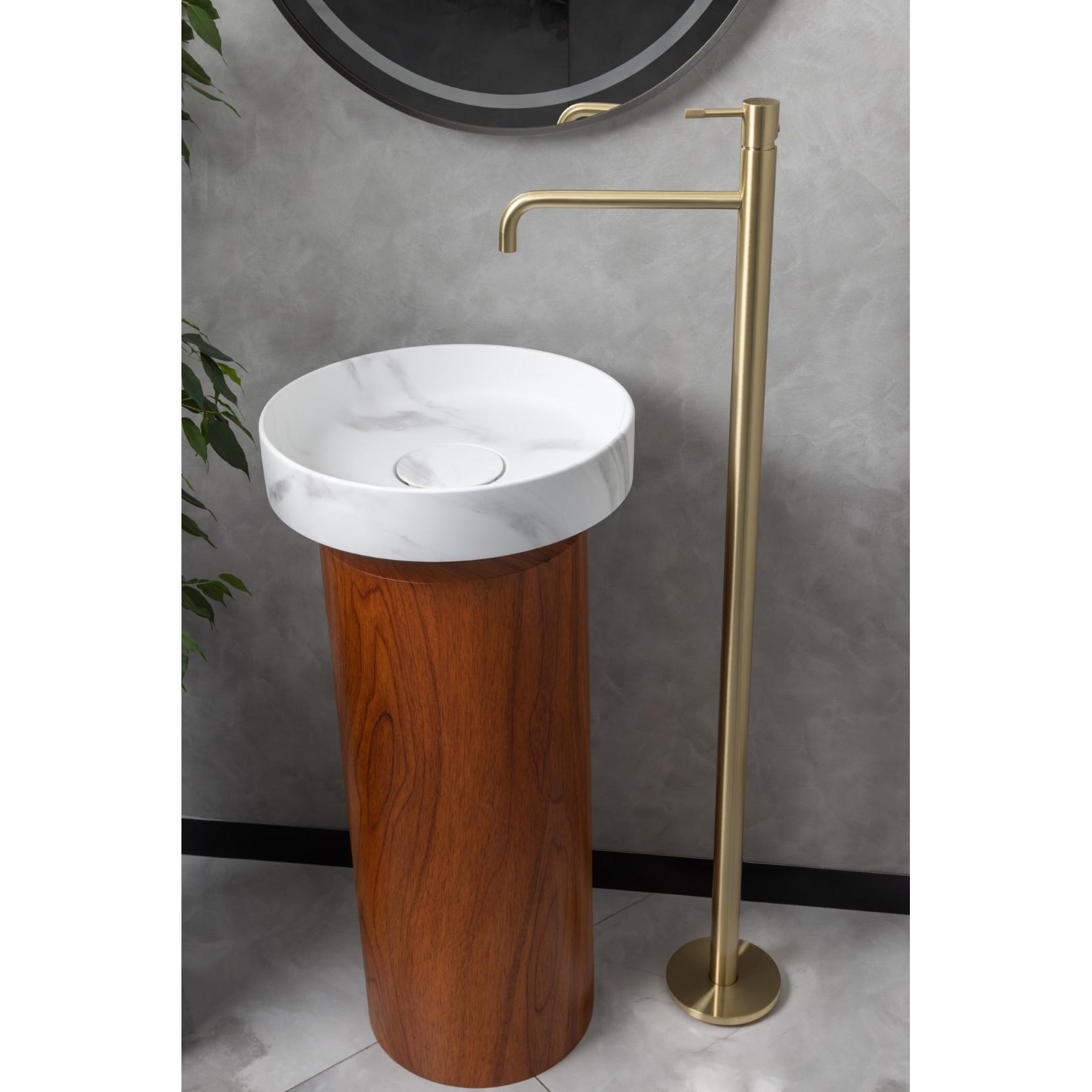Раковина накладная Boheme Sole Corian 400*130 Calacatta с пьедесталом Corian 300*720 Red Wood