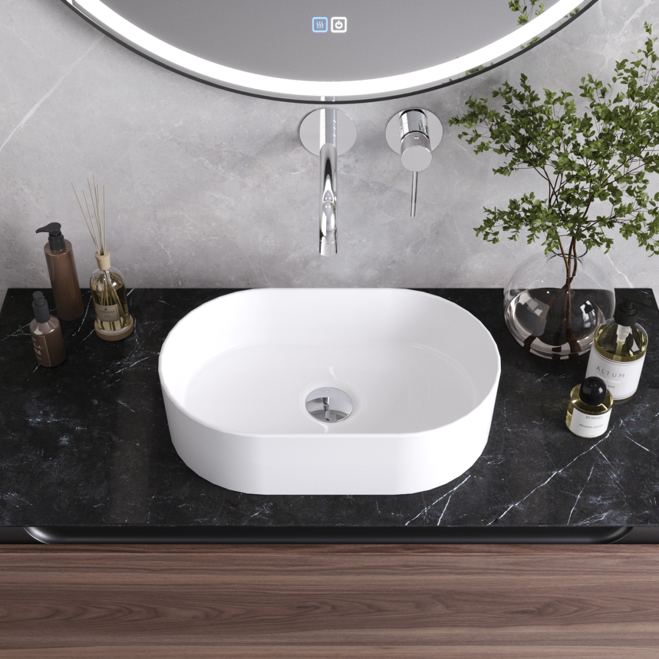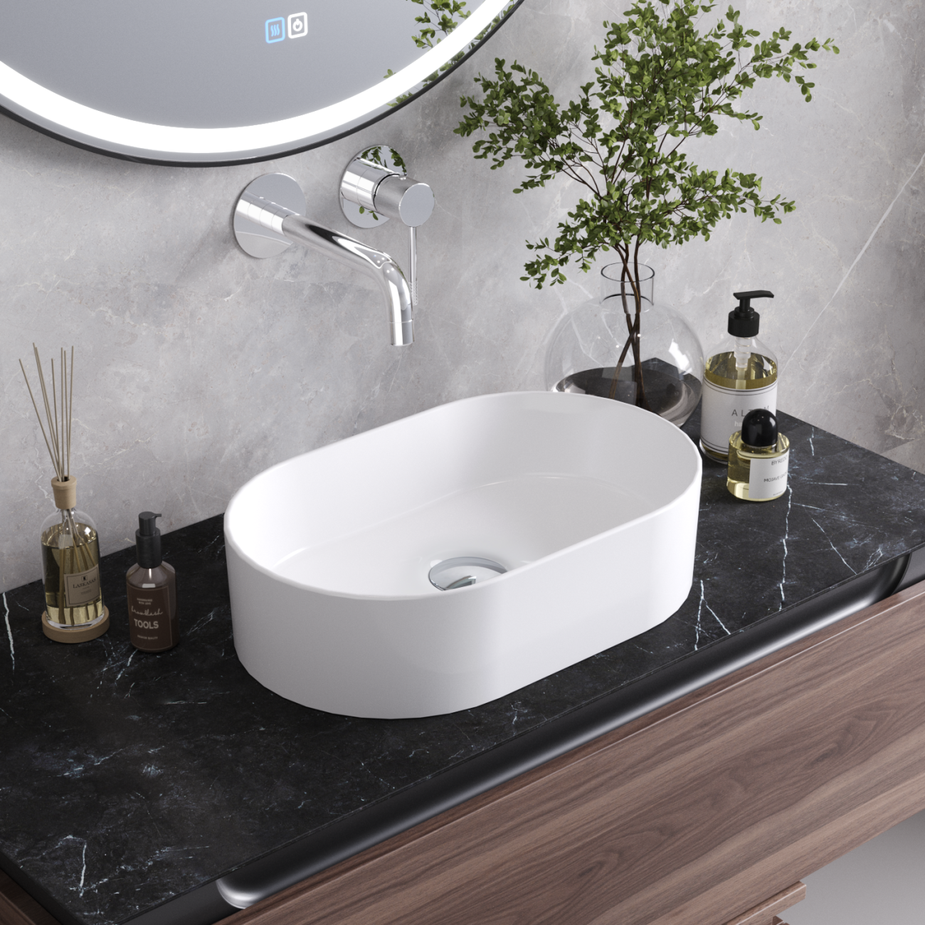 Раковина керамическая, накладная, без отверстия перелива.
