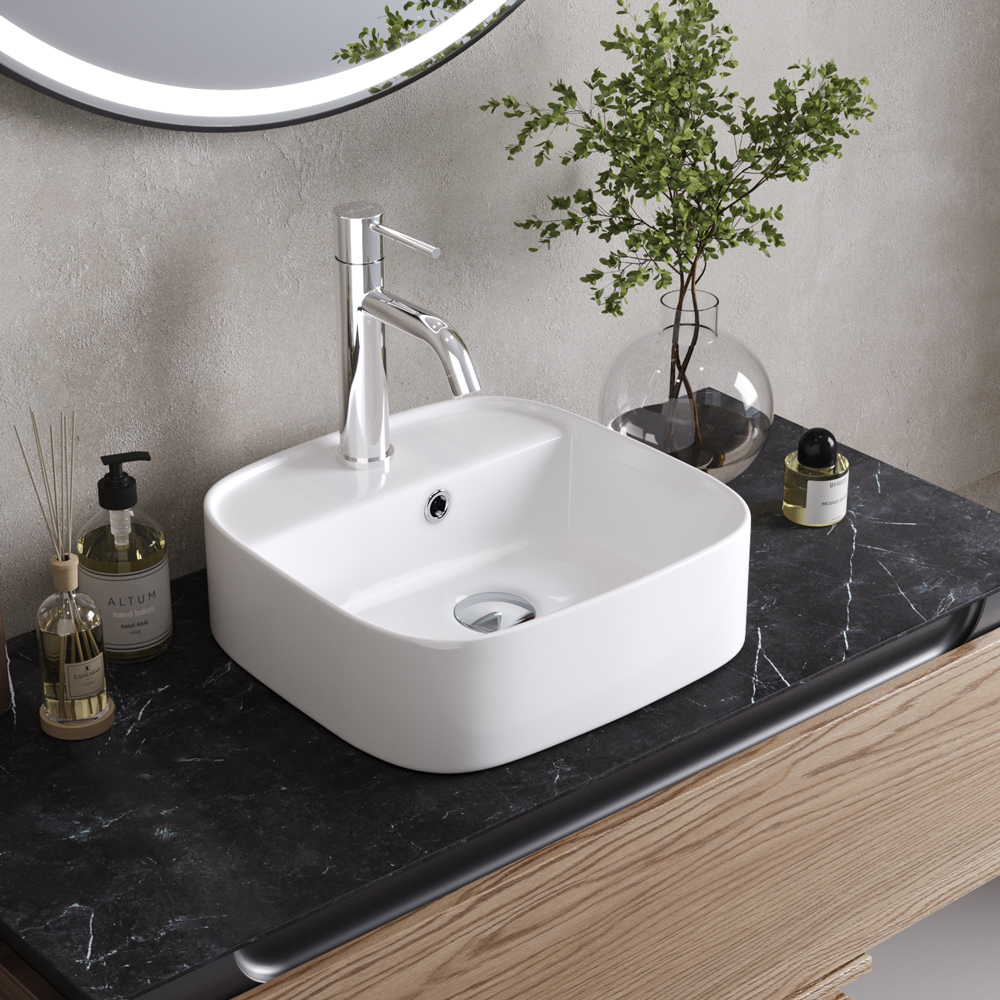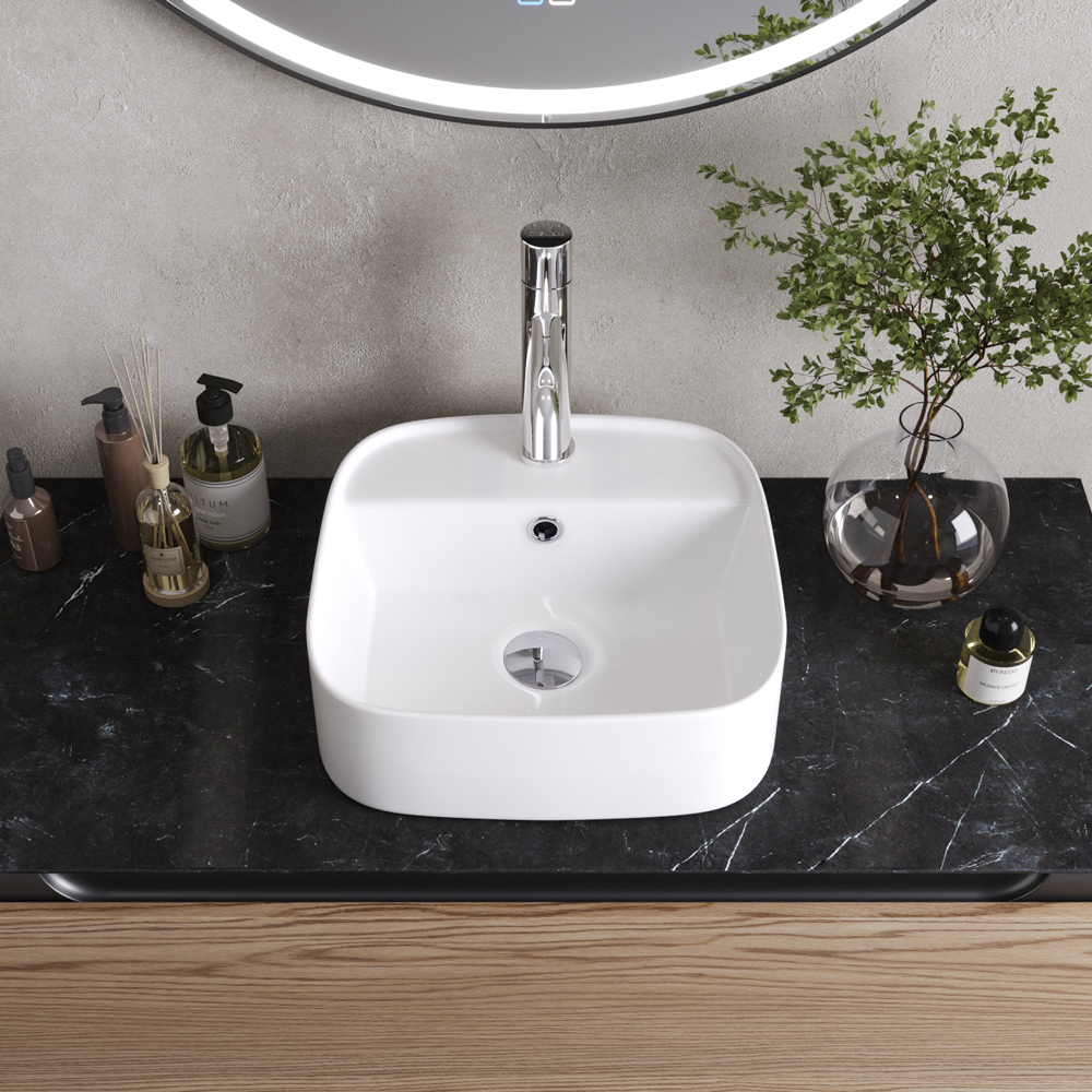 Раковина белая, матовая, керамическая, накладная с отверстием перелива.