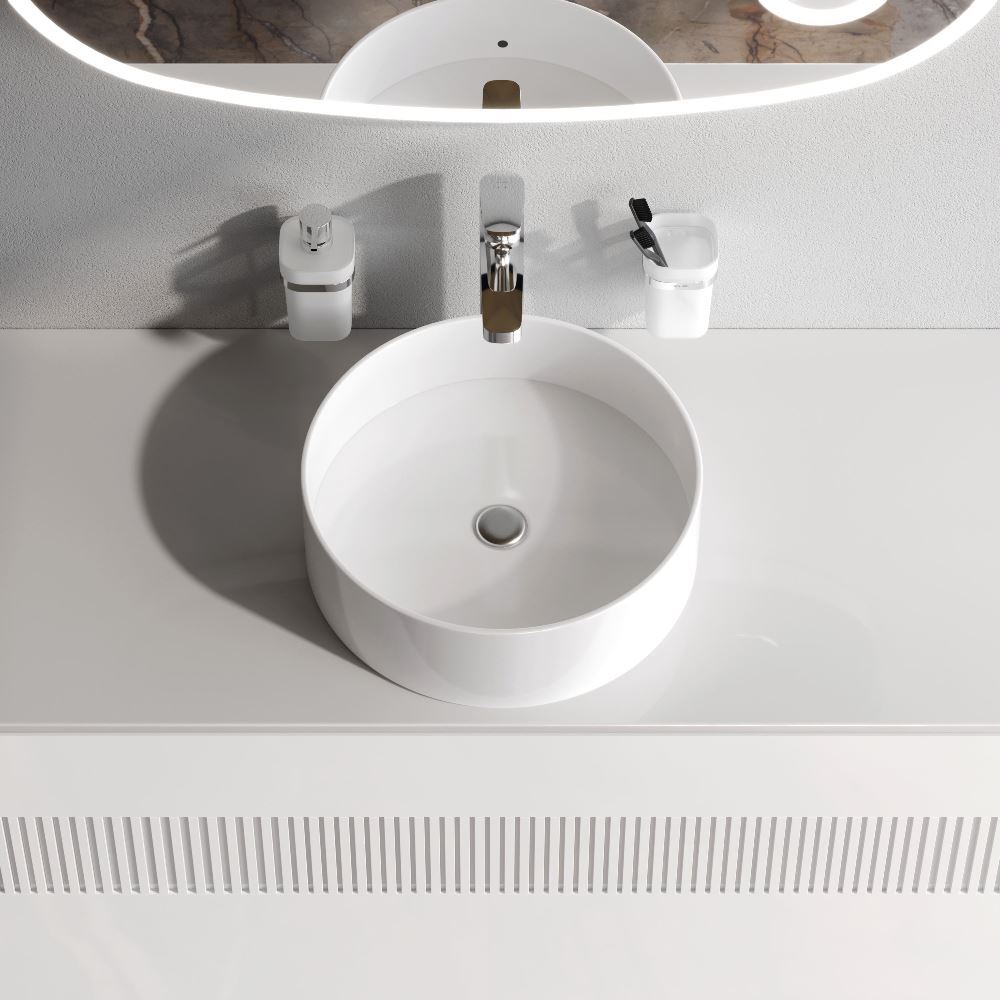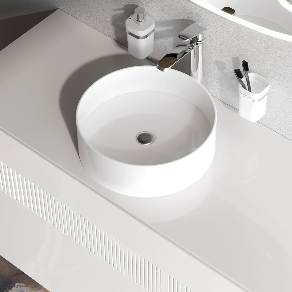 Трендовый дизайн раковины с ее идеально ровными поверхностями в сочетании с плавными линиями принадлежит авторству собственной дизайн-студии AM.PM в Германии. Лаконичная круглая форма раковины сделает ее центром притяжения любой ванной комнаты. Размер раковины составляет всего 40 см благодаря чему она может органично вписаться даже в ванную комнату с ограниченной площадью. Тщательно продуманная форма чаши исключает пролив воды за край сохраняя чистоту столешницы и сокращая время на уборку. Раковина изготовлена из стекловидного фарфора самого гигиеничного и влагостойкого материала. ""