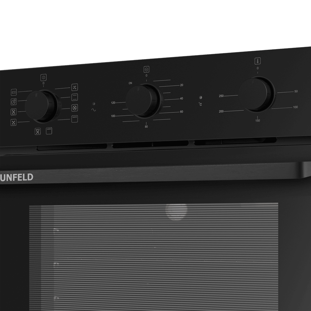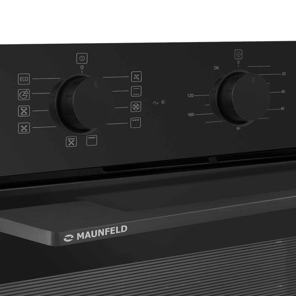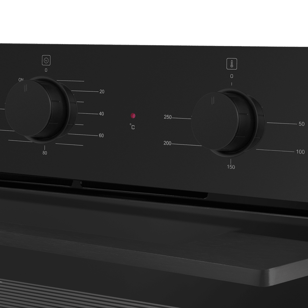 Встраиваемый электрический духовой шкаф с объемом 76 литров оснащен удобными телескопическими направляющими и простым механическим управлением с утапливаемыми переключателями.