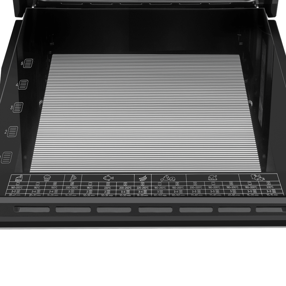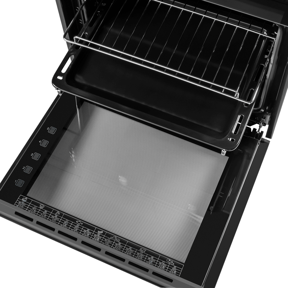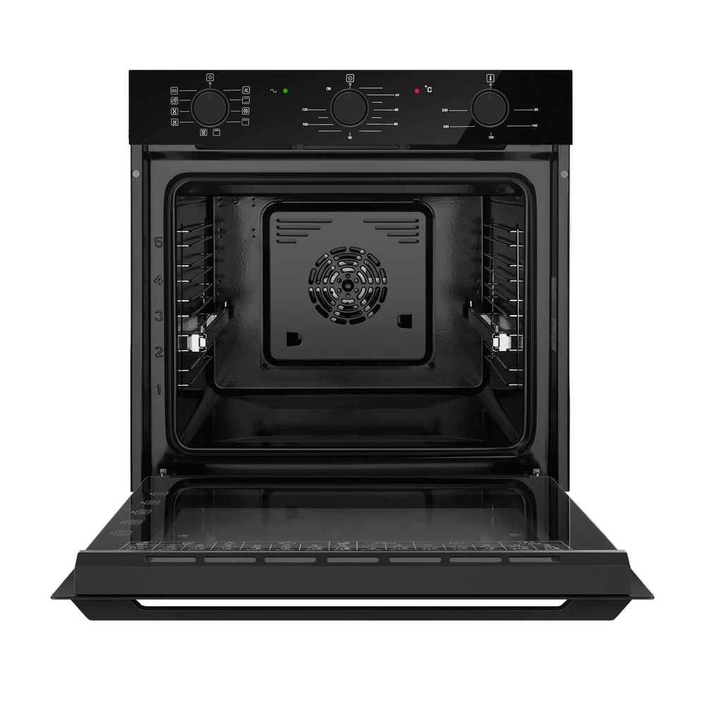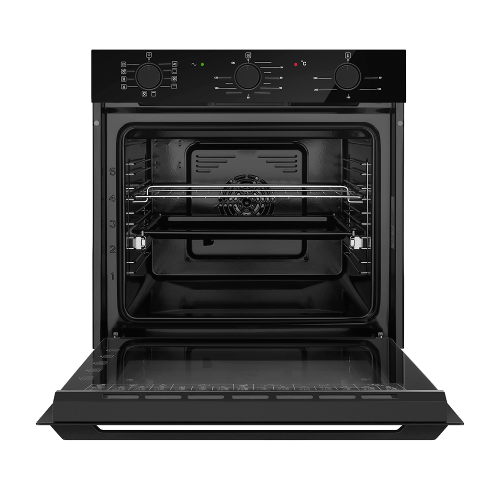 Встраиваемый электрический духовой шкаф с объемом 76 литров оснащен удобными телескопическими направляющими и простым механическим управлением с утапливаемыми переключателями.