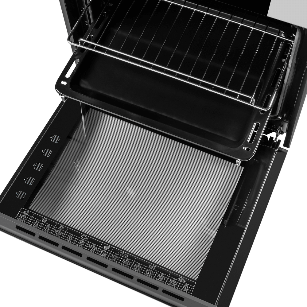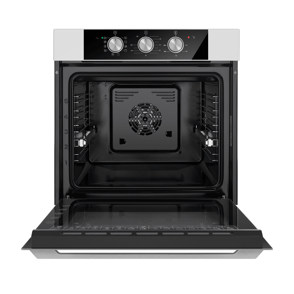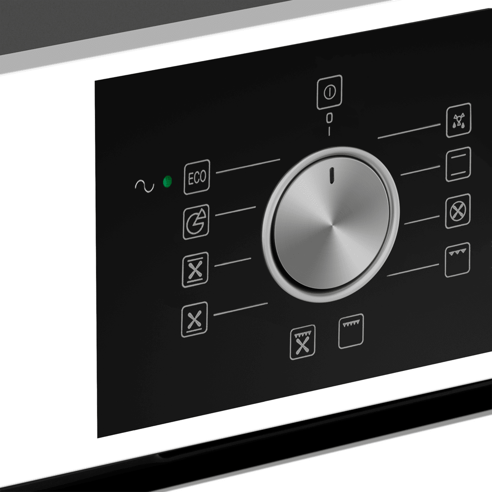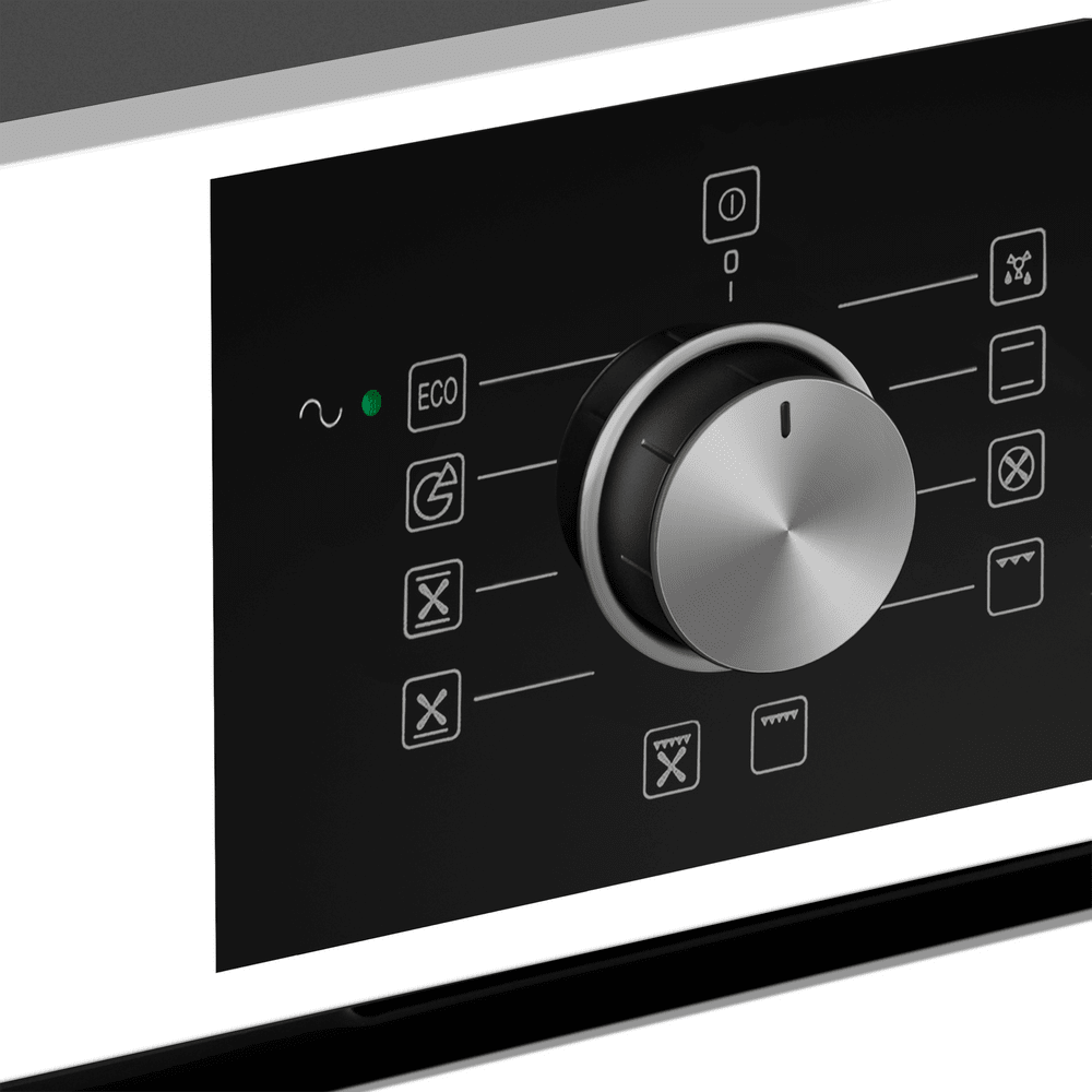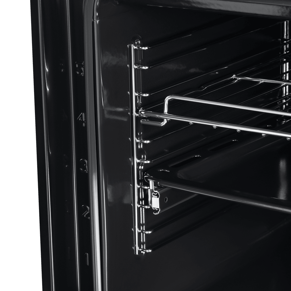 Встраиваемый электрический духовой шкаф с объемом 76 литров оснащен удобными телескопическими направляющими и простым механическим управлением с утапливаемыми переключателями.