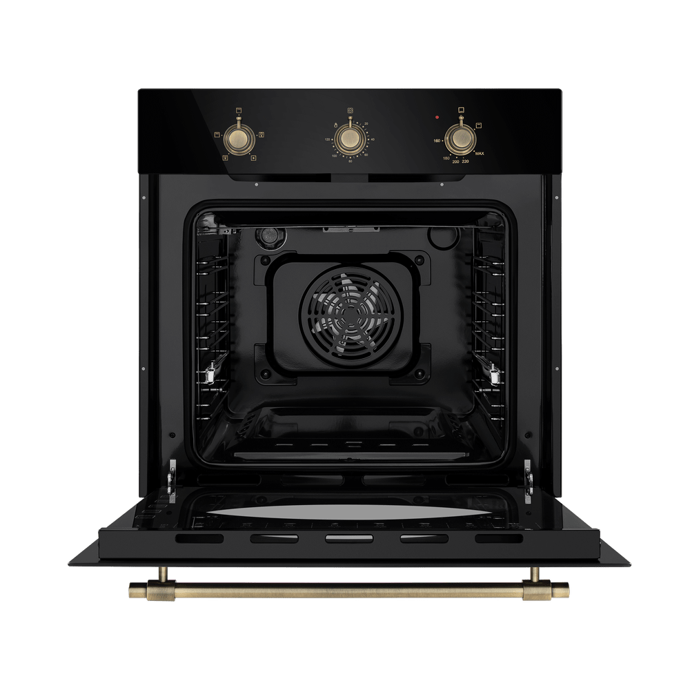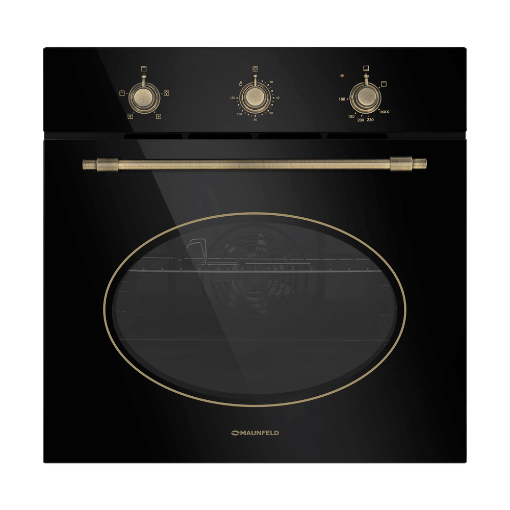 Духовой шкаф MAUNFELD EOGC604RIB.MT Slim — невероятно красивая и практичная модель. Стильный ретро-дизайн черного духового шкафа, который подчеркивает золотая фурнитура.