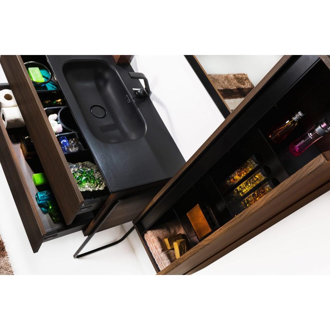 • Фасады шкафа изготовлены из эксклюзивного ультраглянцевого акрилового МДФ от Senosan (Австрия). Этот материал не только красив, но и долговечен, устойчив к влаге и механическим повреждениям. Задняя стенка шкафа покрыта экокожей, что обеспечивает дополнительную защиту от влаги и придаёт изделию стильный и современный вид. Фурнитура Hettich гарантирует надёжность и долговечность конструкции. Вы можете быть уверены, что шкаф-пенал прослужит вам долгие годы, не теряя своей функциональности и эстетики. Вкладные полки из тонированного калёного стекла не только красивы, но и практичны. Они выдерживают большой вес, легко моются и не подвержены коррозии.