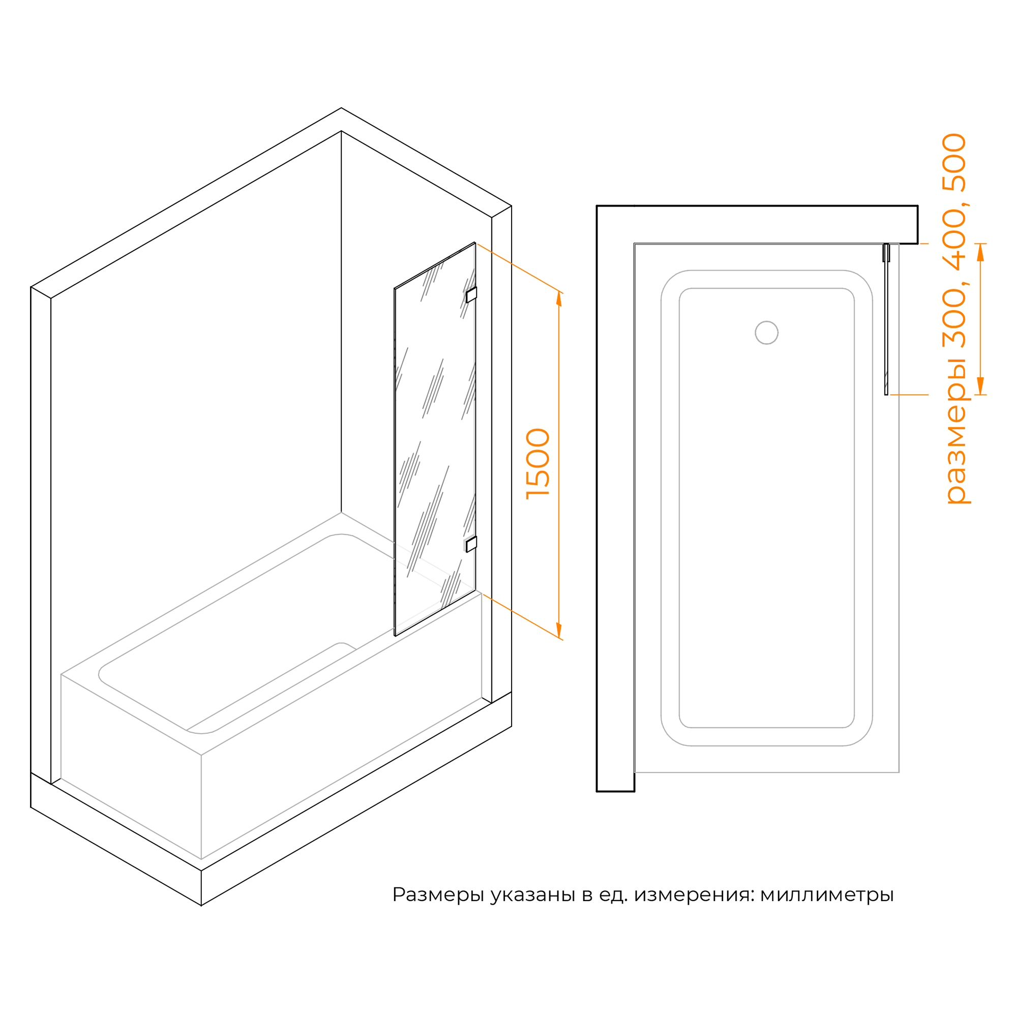 Высота стеклянной шторки составляет 1500 мм, что достаточно для большинства стандартных ванн. Конструкция створки шторки неподвижная, что обеспечивает легкость установки и удобство использования.