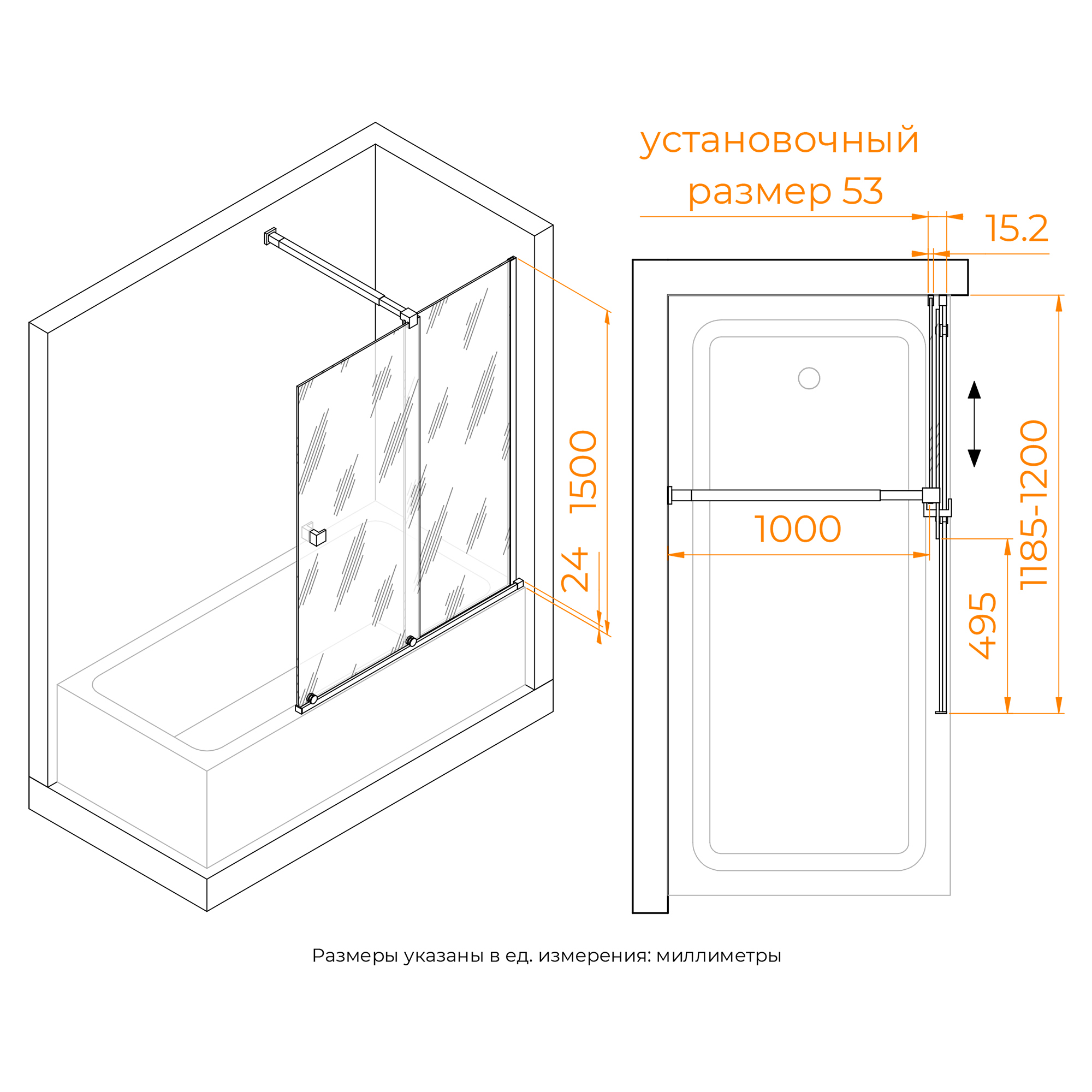 Стеклянная шторка RGW SC-46 - двух сегментная, состоит из стационарного полотна и полотна с подвижной частью изменения размера ограждающей конструкции ванны.