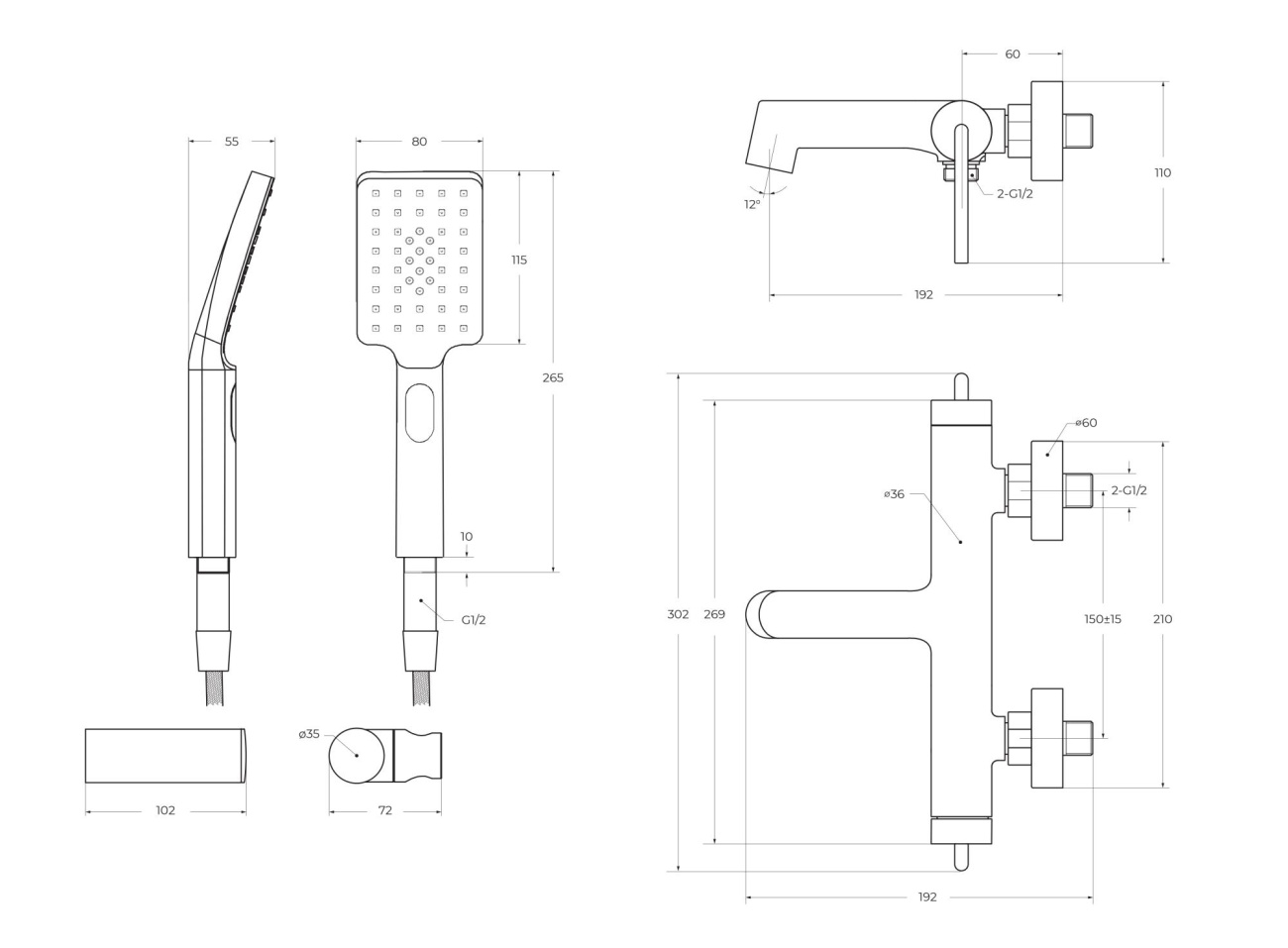 Смеситель для ванны и душа в комплекте с ручным душем, шлангом и держателем.