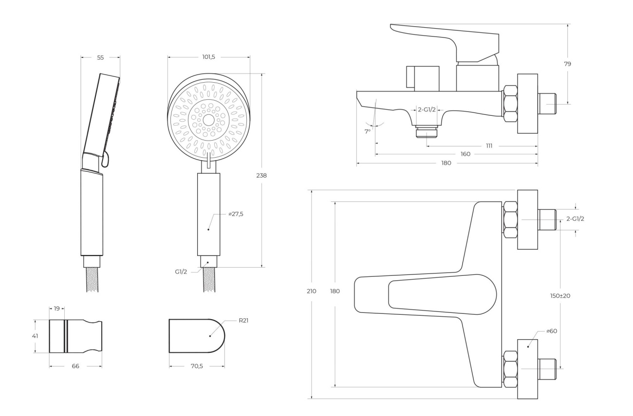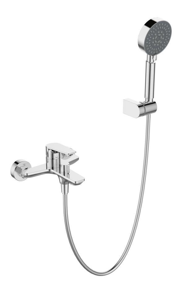 Смеситель для ванны и душа в комплекте с ручным душем, шлангом и держателем.