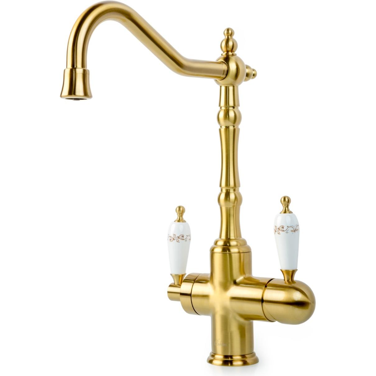 Смеситель Medici Ripresa порадует поклонников интерьеров в ретростиле. Изящная модель изготовлена из латуни с износостойким покрытием PVD бронзового цвета, сохраняющим приятное сияние на протяжении всего периода эксплуатации. Подключается к фильтру и обеспечивает подачу очищенной воды через дополнительный канал в поворотном изливе. Управление потоками осуществляется 2 рычагами. Устройство герметично и рассчитано на долгий срок службы.