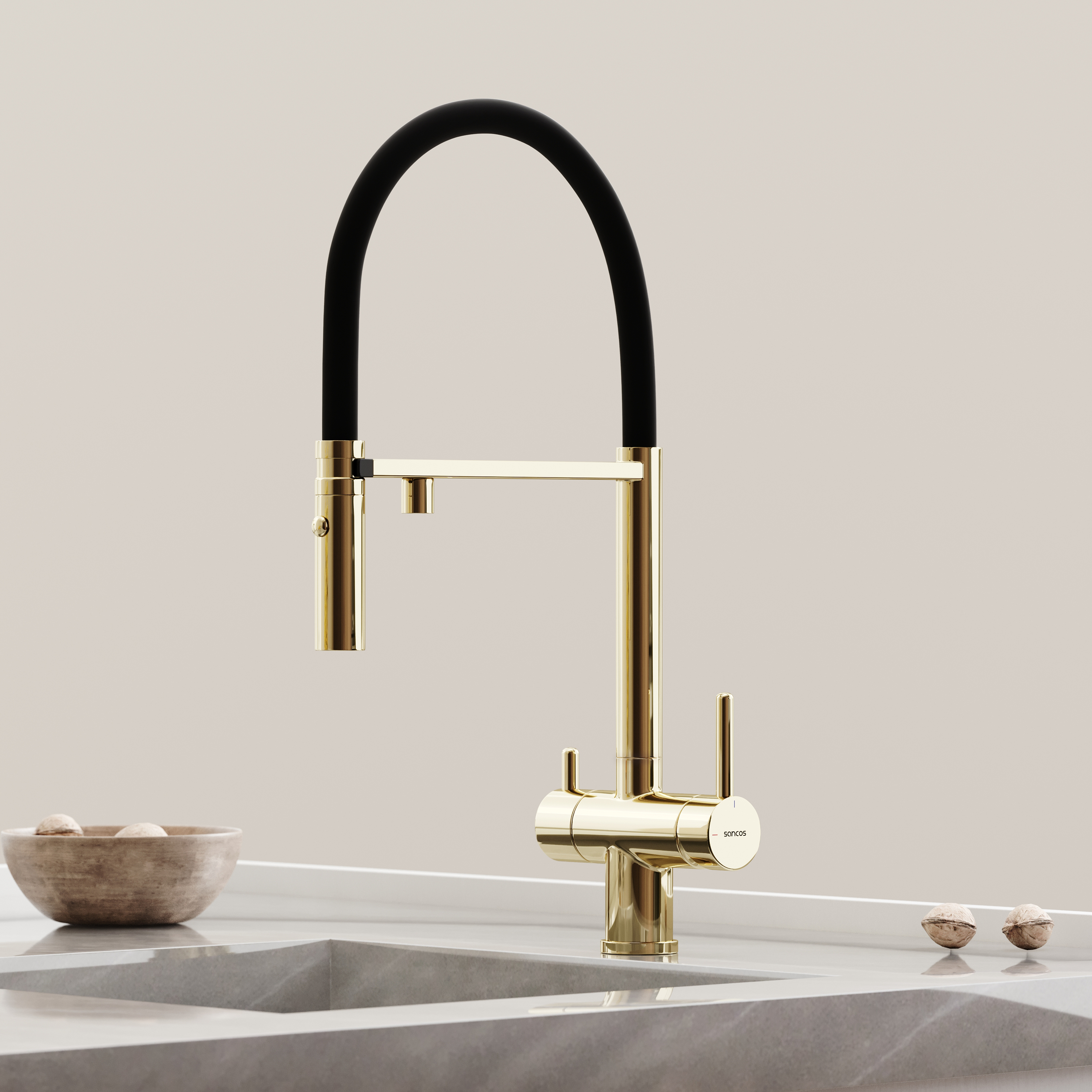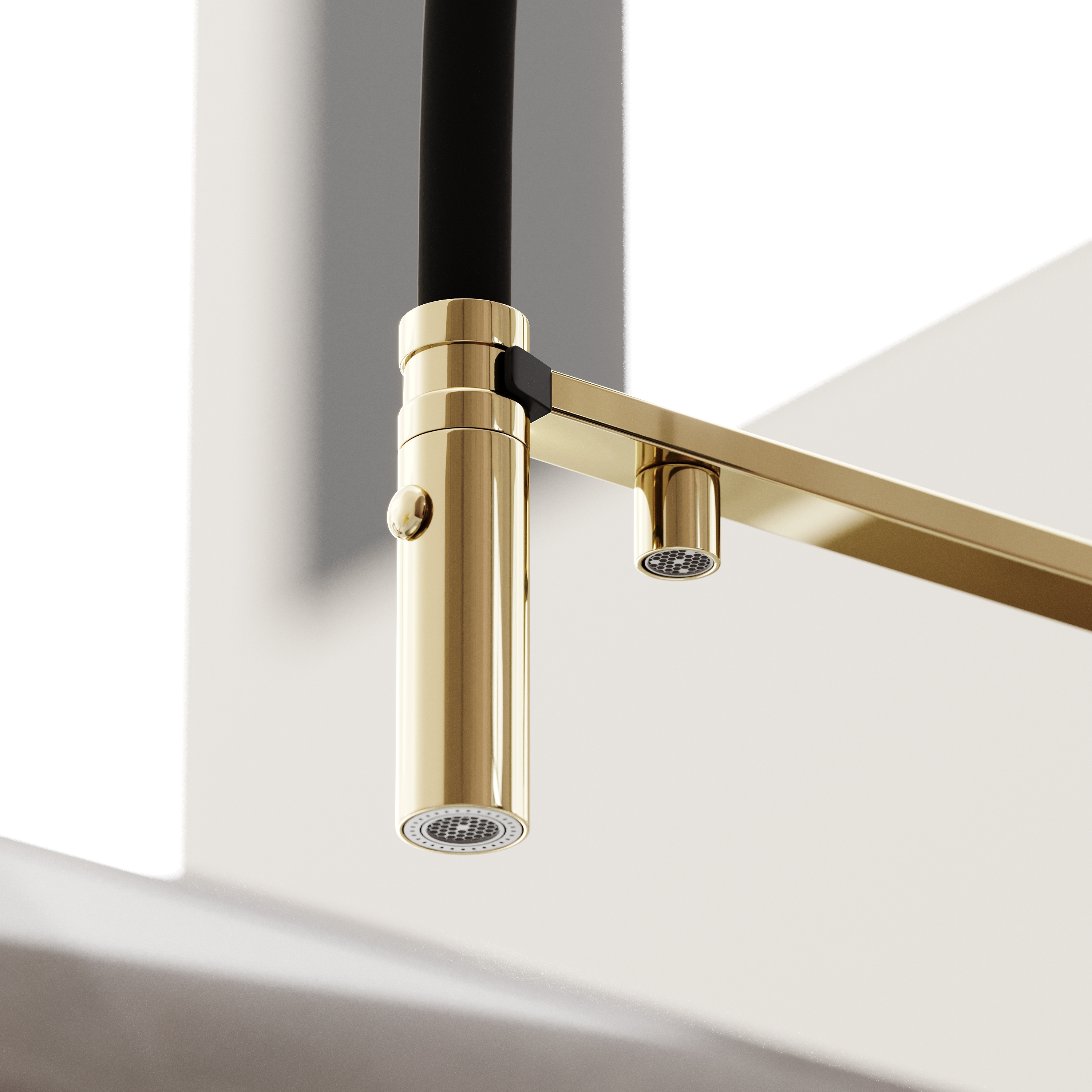 - Излив для фильтрованной воды интегрирован в держатель основного излива