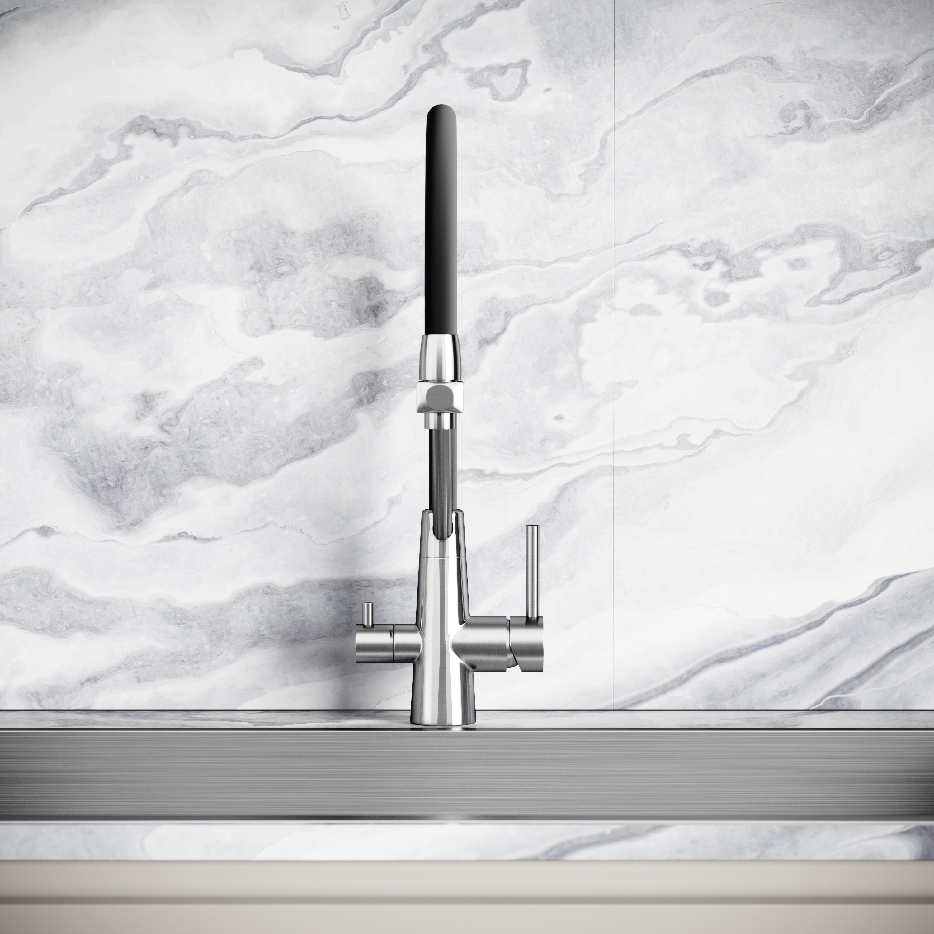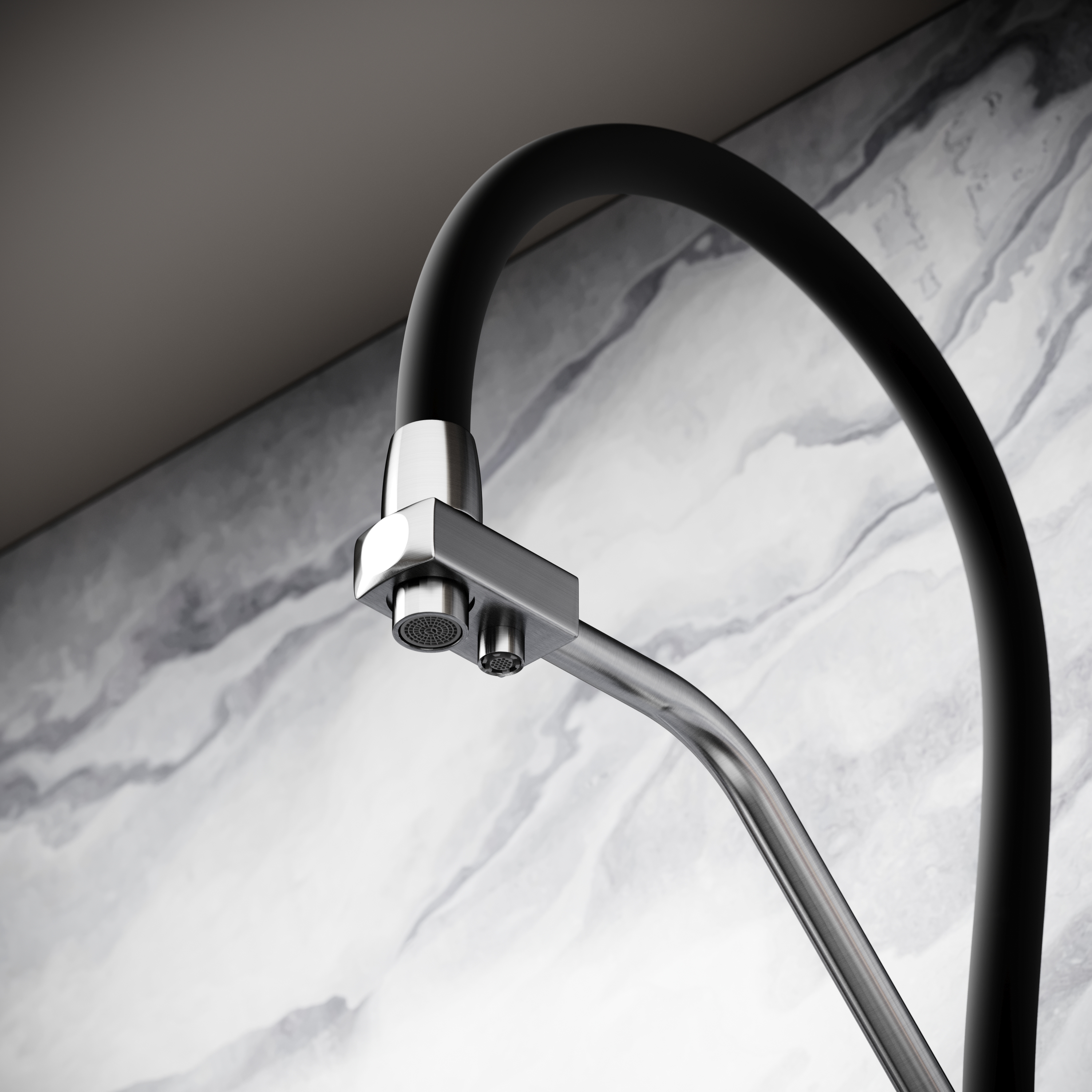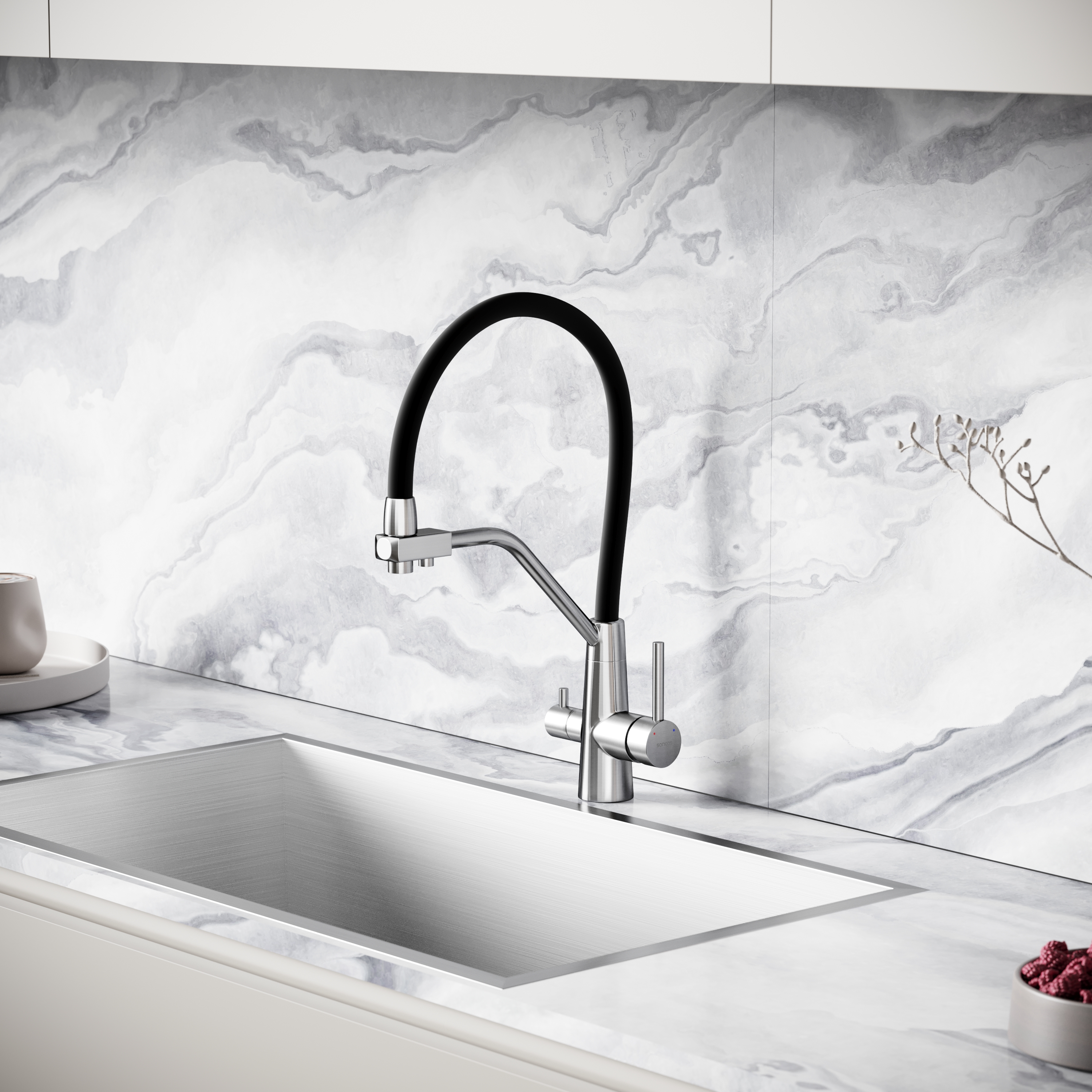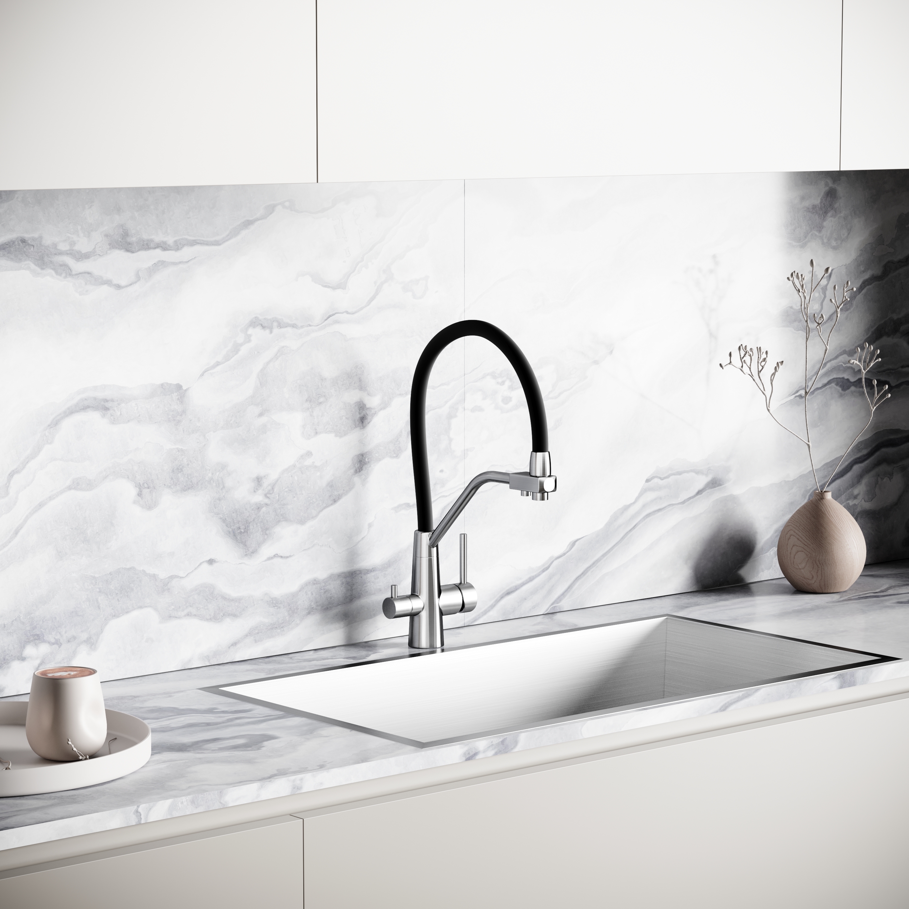 В комплекте: смеситель, комплект для подключения к фильтру, подводка для воды, монтажный комплект