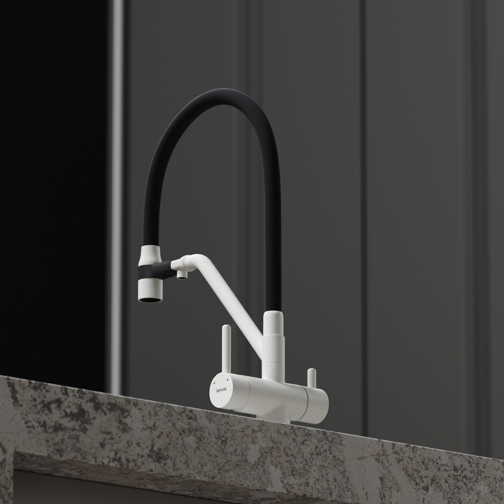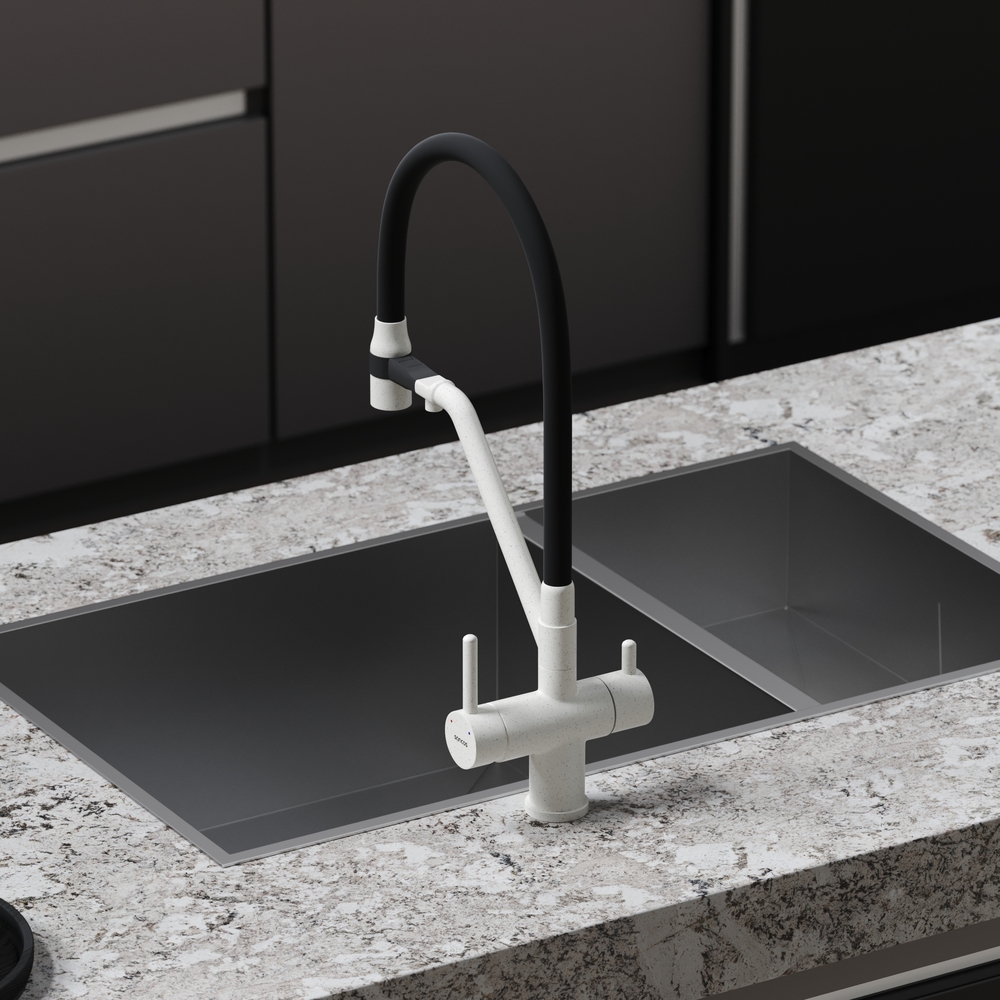 - Излив для фильтрованной воды интегрирован в держатель основного излива. Управляется отдельной ручкой слева на корпусе смесителя