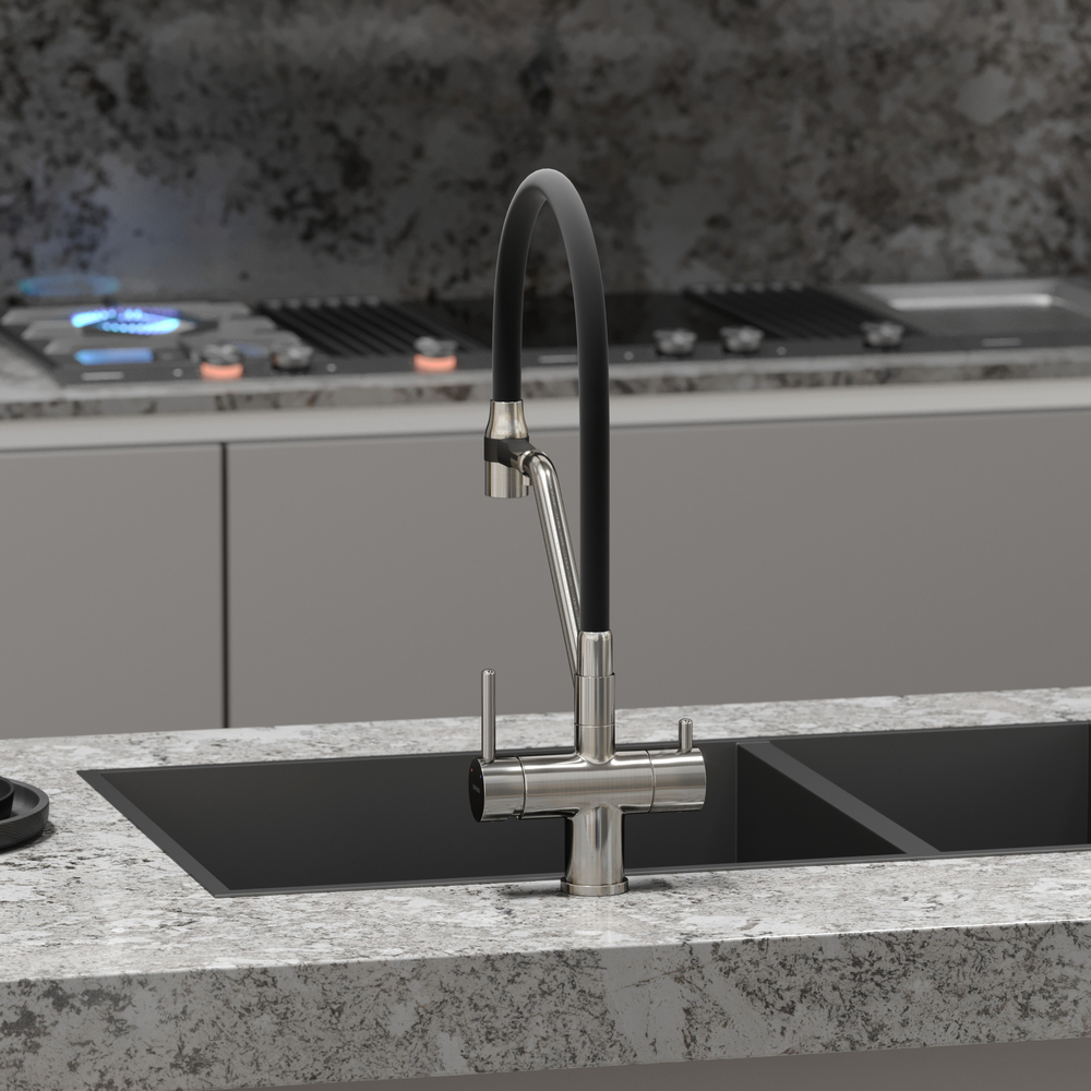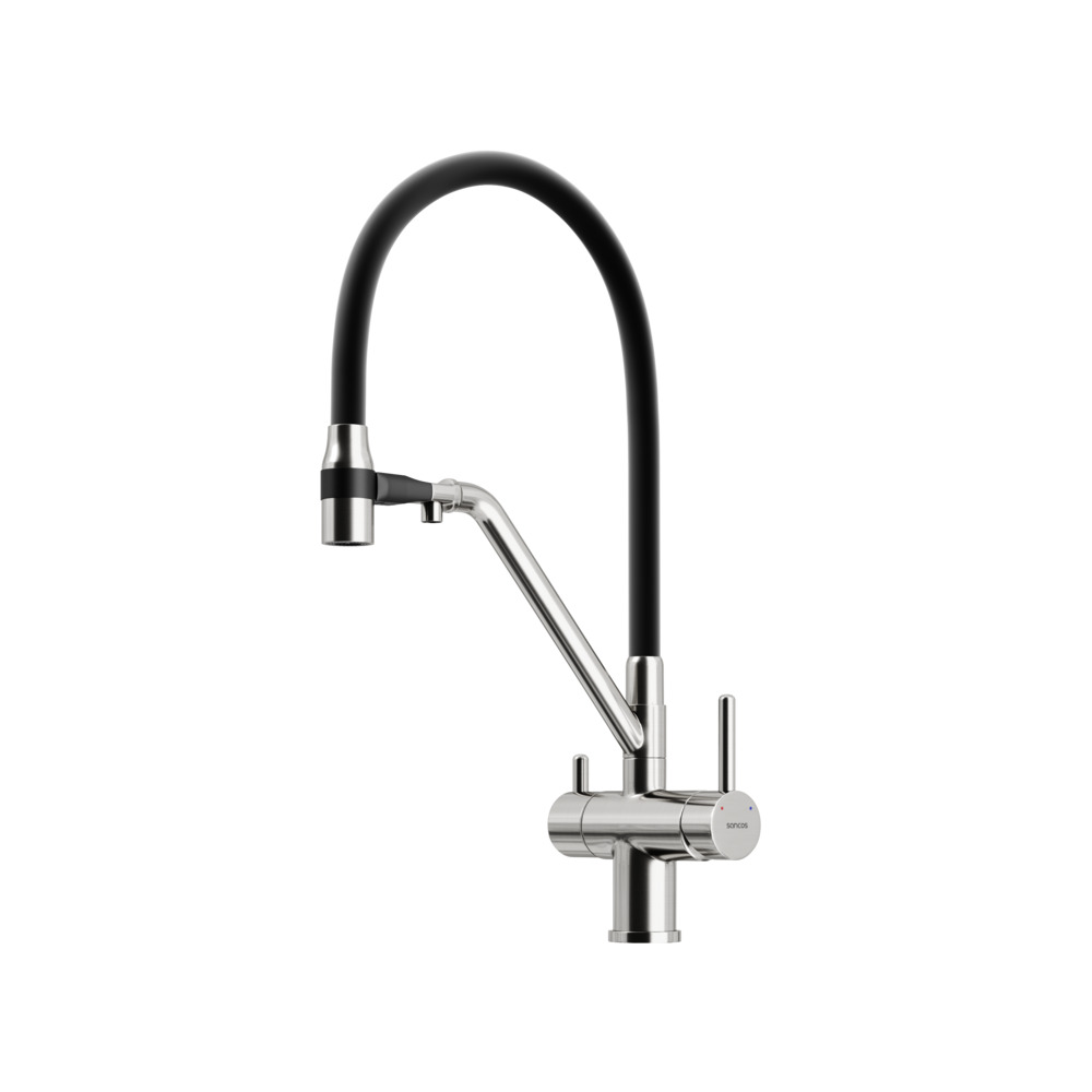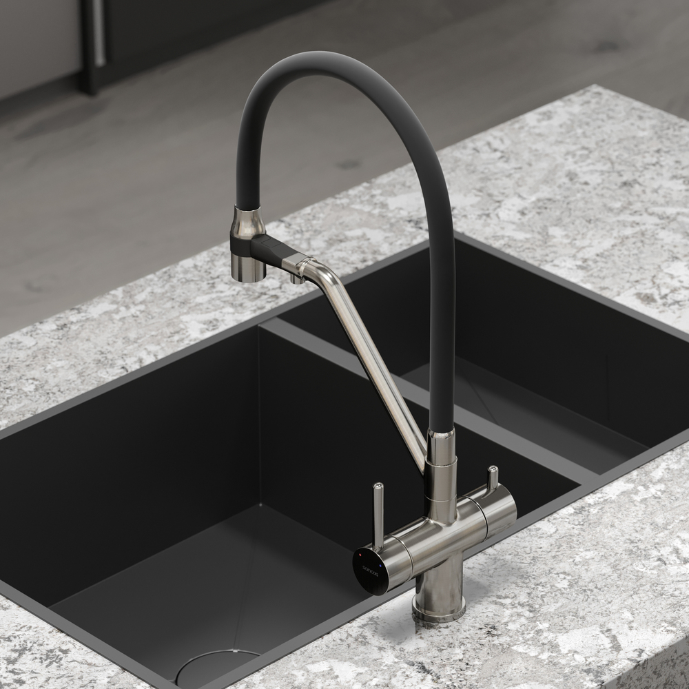 - Излив для фильтрованной воды интегрирован в держатель основного излива. Управляется отдель¬ной ручкой слева на корпусе смесителя