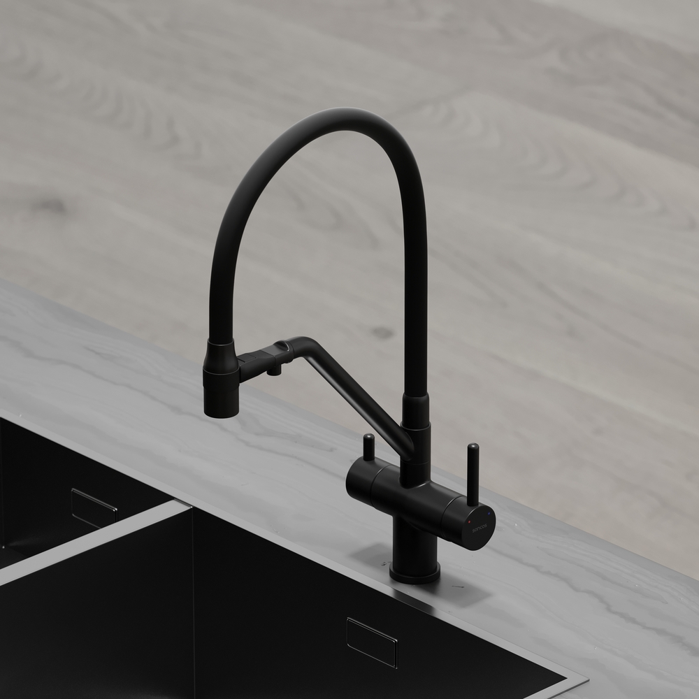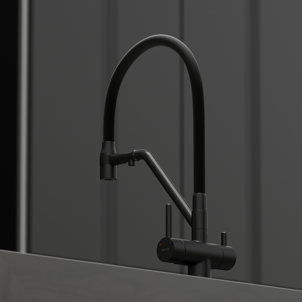 - Излив для фильтрованной воды интегрирован в держатель основного излива. Управляется отдель¬ной ручкой слева на корпусе смесителя