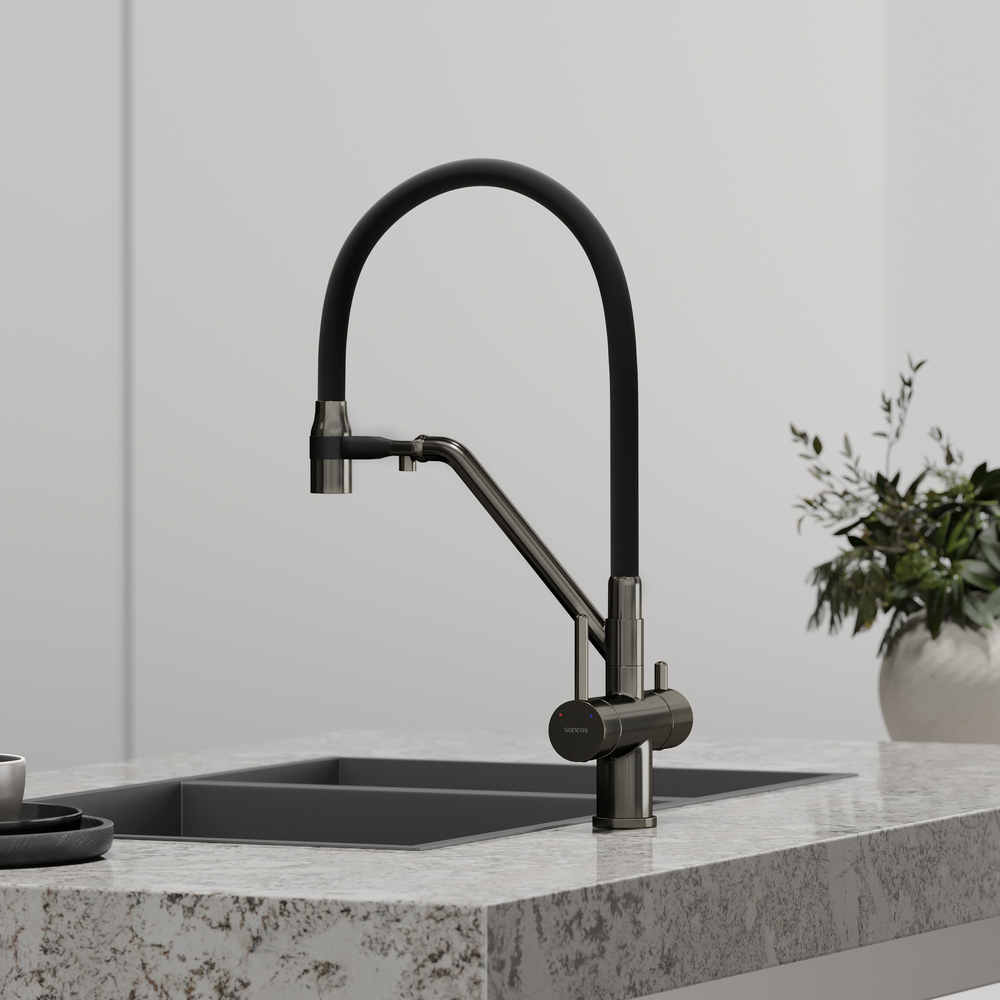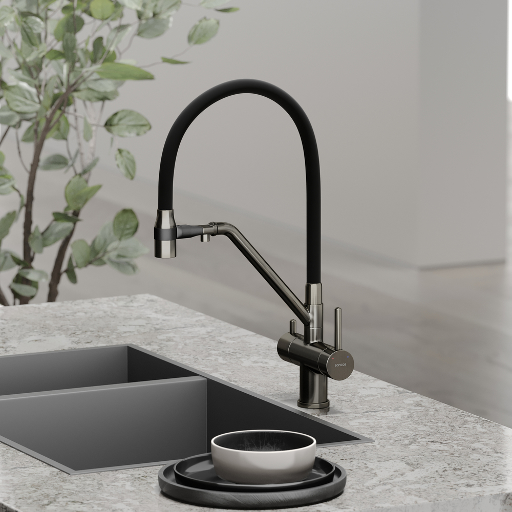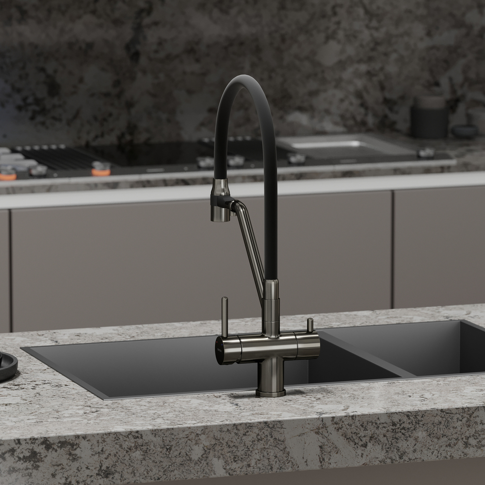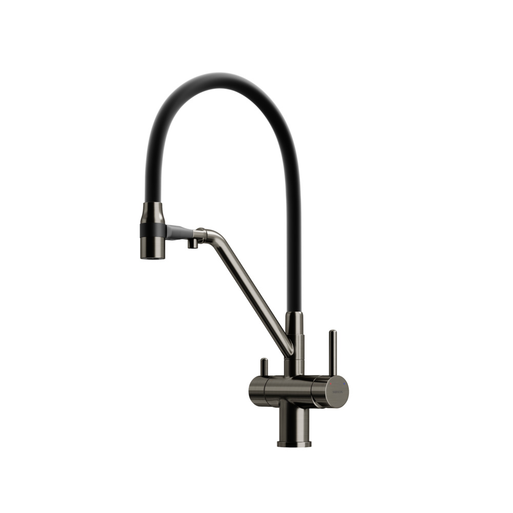 - Излив для фильтрованной воды интегрирован в держатель основного излива. Управляется отдель¬ной ручкой слева на корпусе смесителя