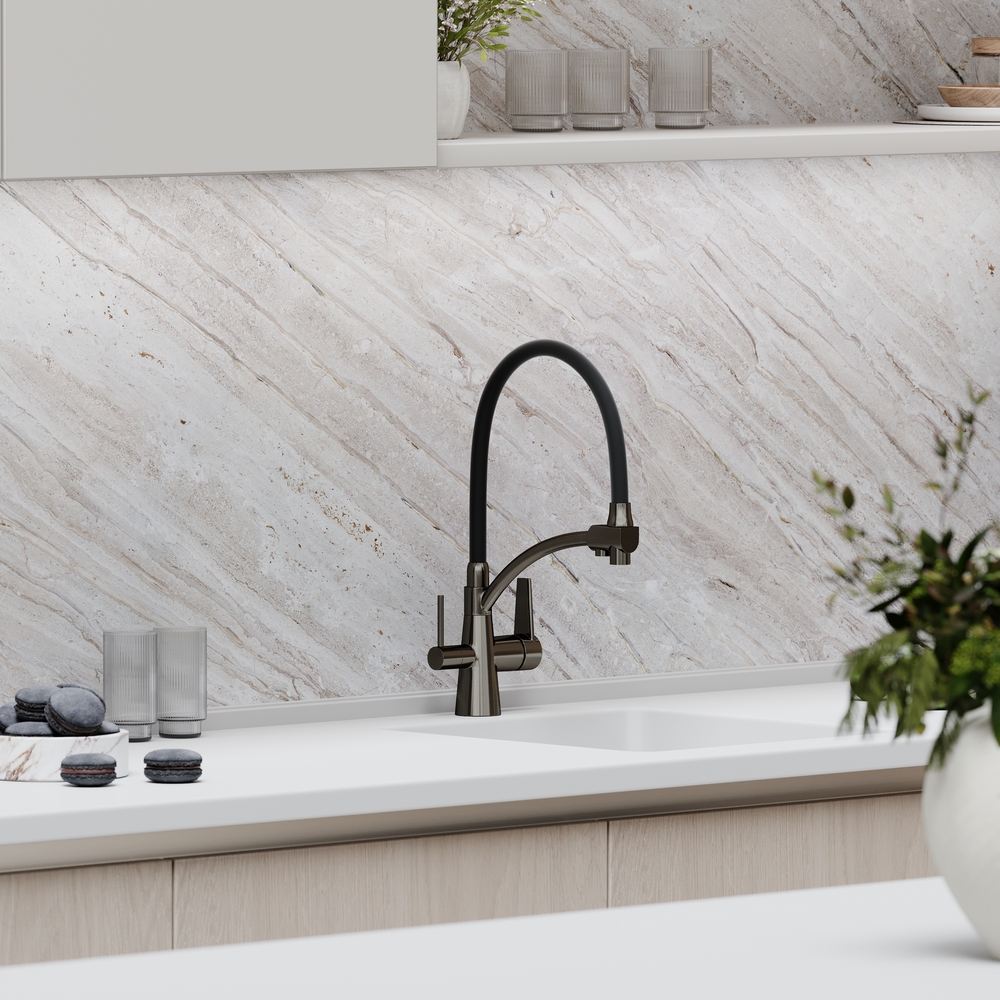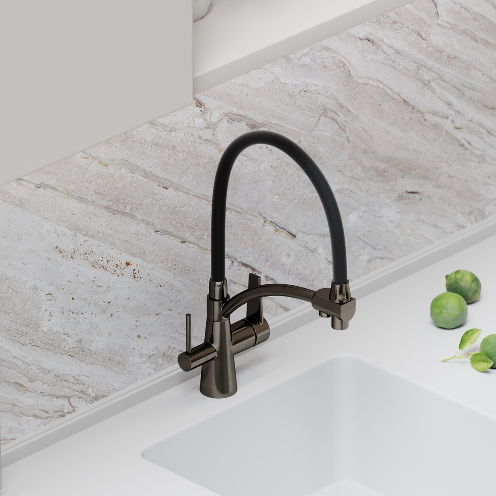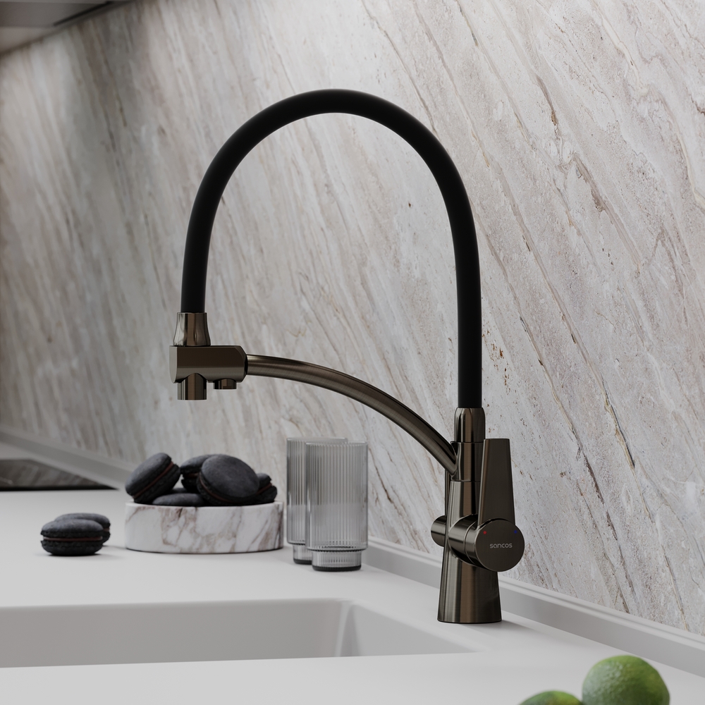 - Излив для фильтрованной воды интегрирован в держатель основного излива. Управляется отдельной ручкой слева на корпусе смесителя