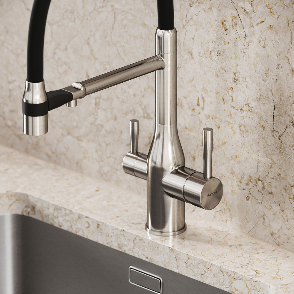 - Излив для фильтрованной воды интегрирован в держатель основного излива